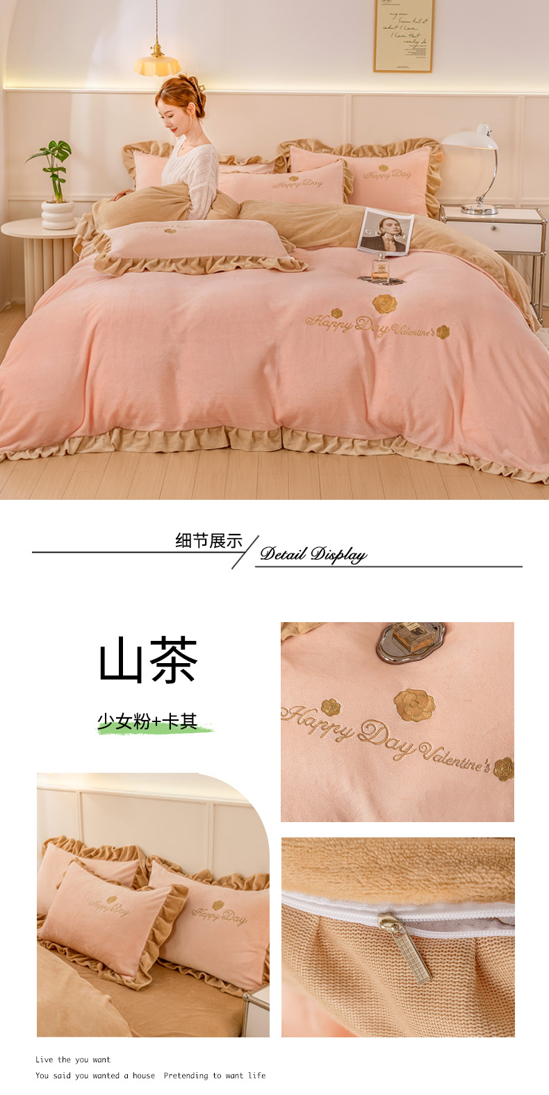当前位置: 91家纺网 > 商品网购 > 床品套件 > 四件套 > 牛奶绒四件套 > 梦喜妮 2024新款高克重韩版纯色绣花刺绣牛奶绒四件套 山茶少女粉+卡其