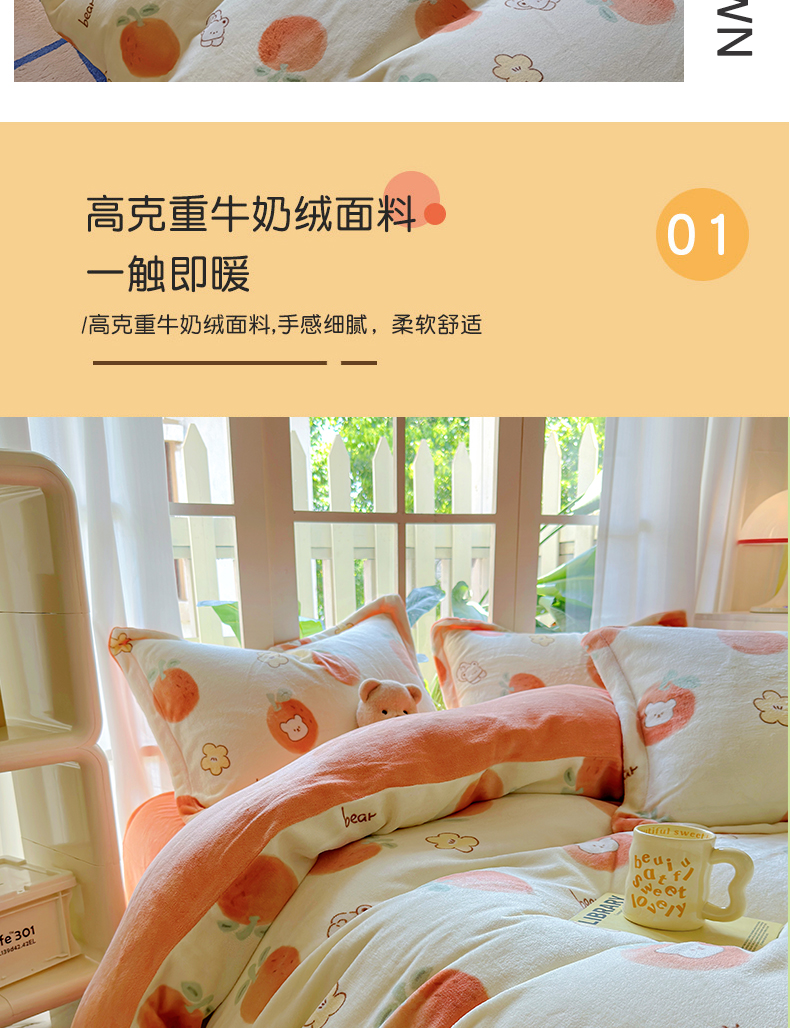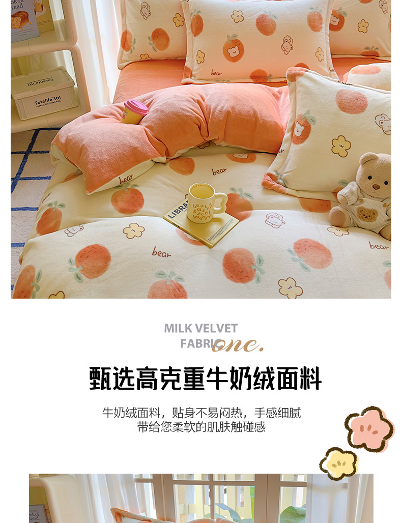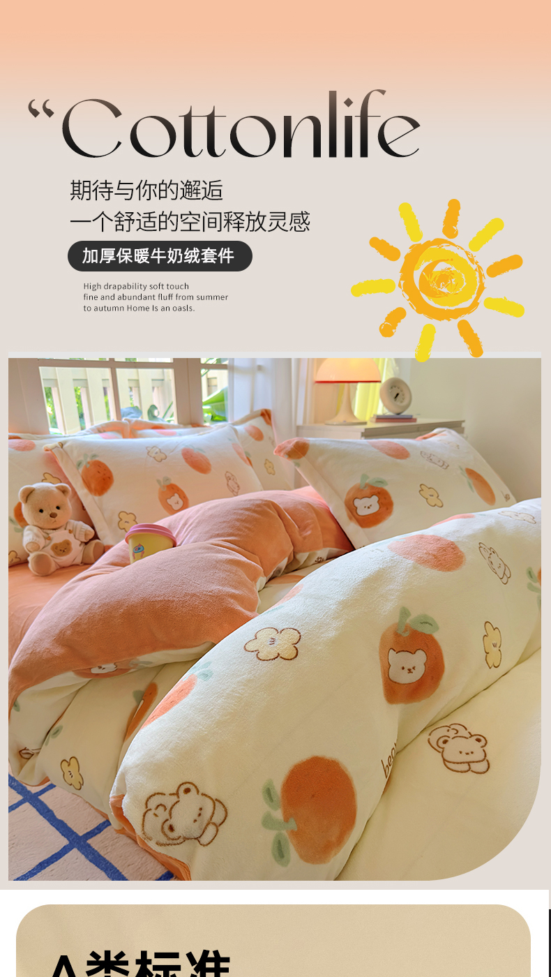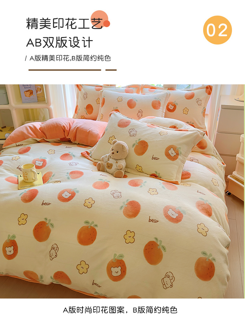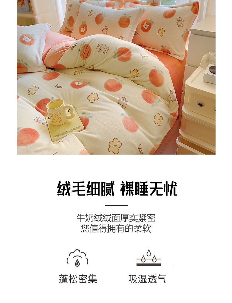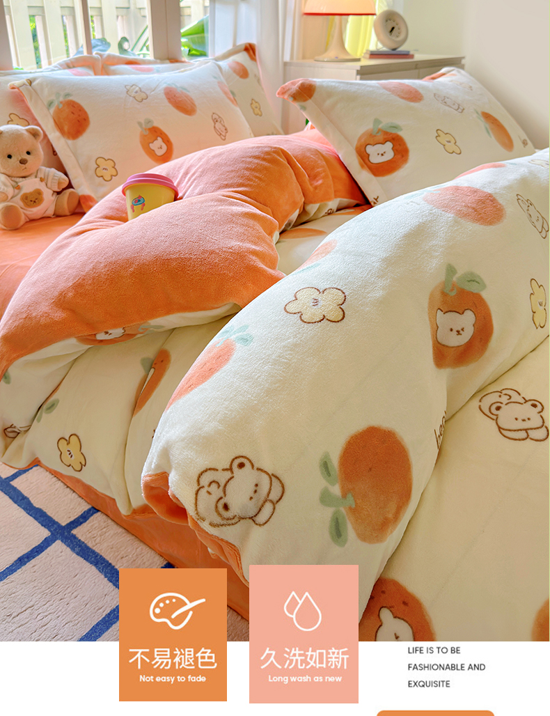 当前位置: 91家纺网 > 商品网购 > 床品套件 > 四件套 > 牛奶绒四件套 > 百寐 2024新款加厚A类牛奶绒印花卡通床单床笠四件套三件套 橘子熊
