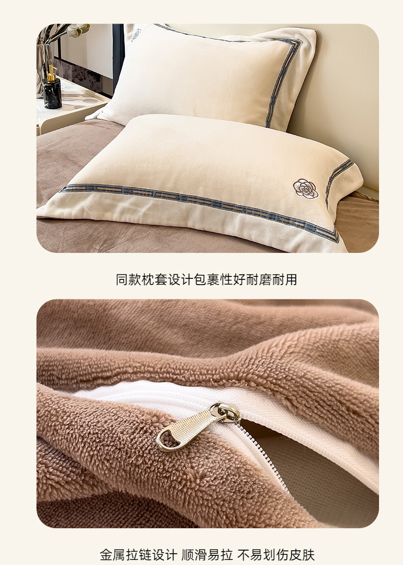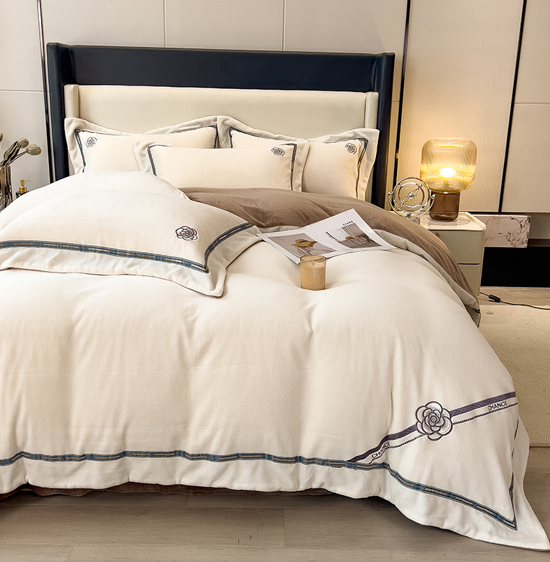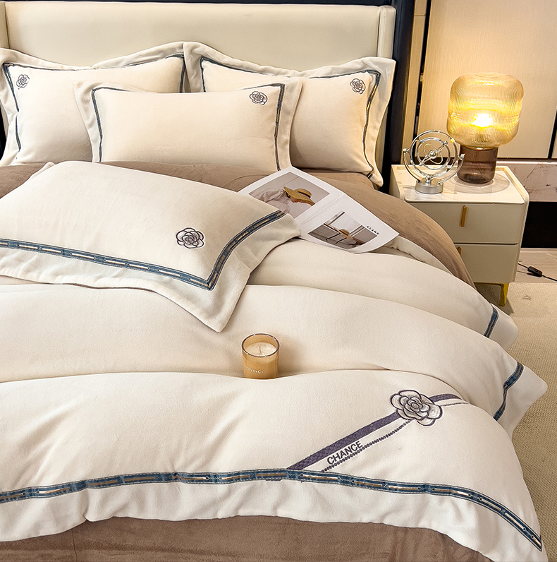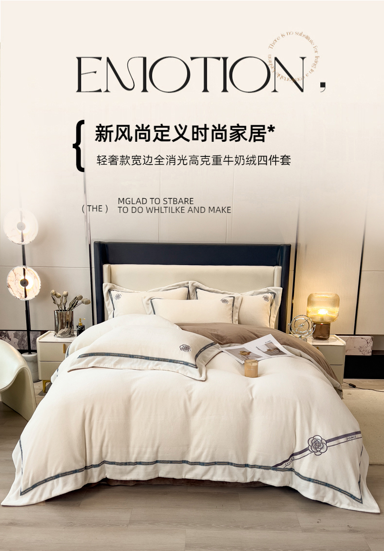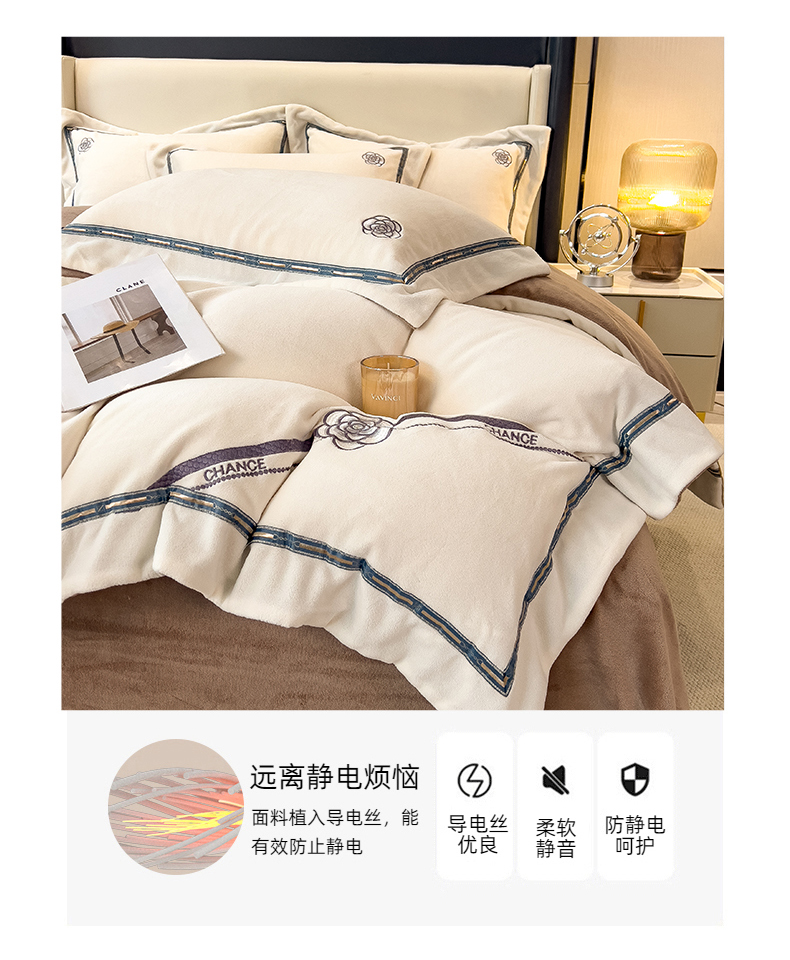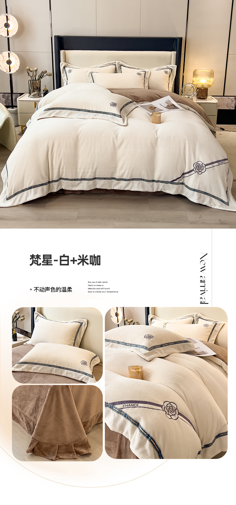 金绣美居 2025新款全消光牛奶绒高克重加厚宽边绣花保暖四件套-梵星 白+米咖