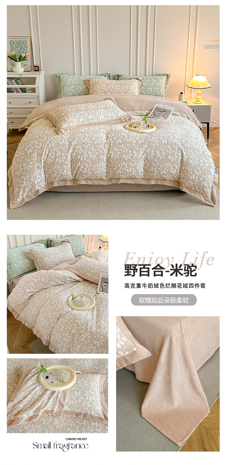 商品名称:金艾草 2024新款牛奶绒色烂雕花绒四件套 野百合-米驼
