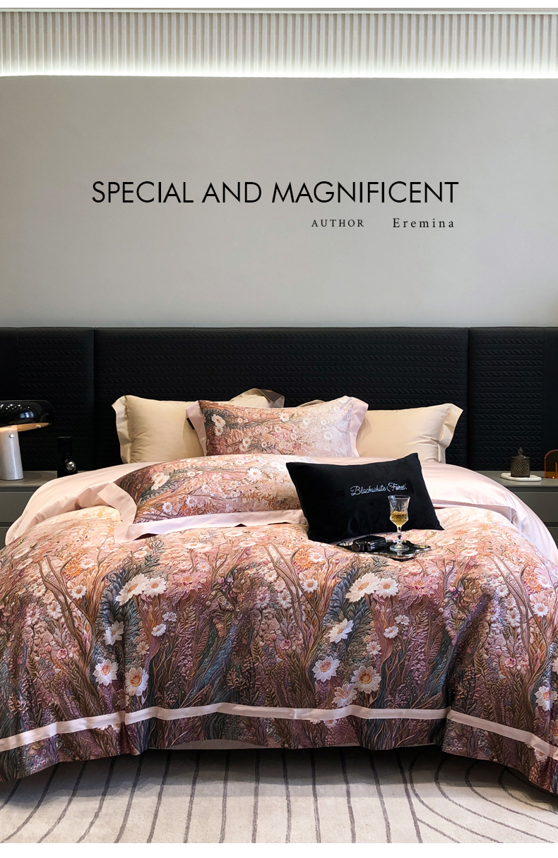 黑白森林2024款 60S支兰精天丝数码印花四件套,朝颜,木槿,玉茗,春浅,京墨,半夏,丹若,繁缕,青黛,德琳-粉,德琳-绿,蒂娜-灰,蒂娜-紫,慧莉-粉,慧莉-绿,欧瑞,夏夜