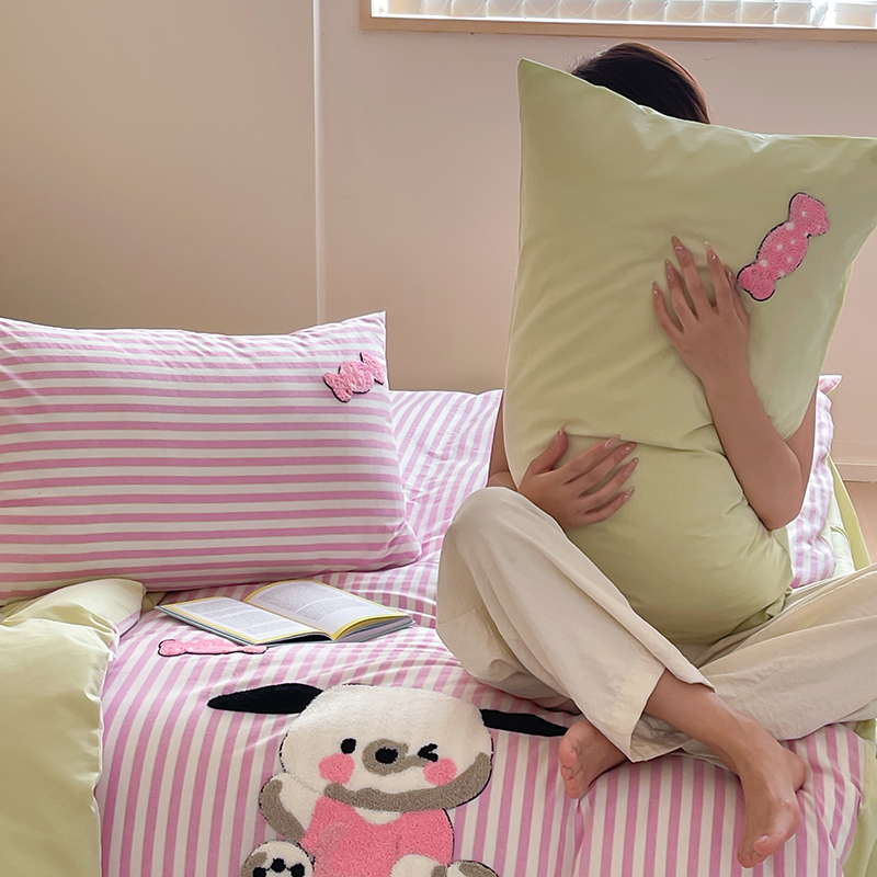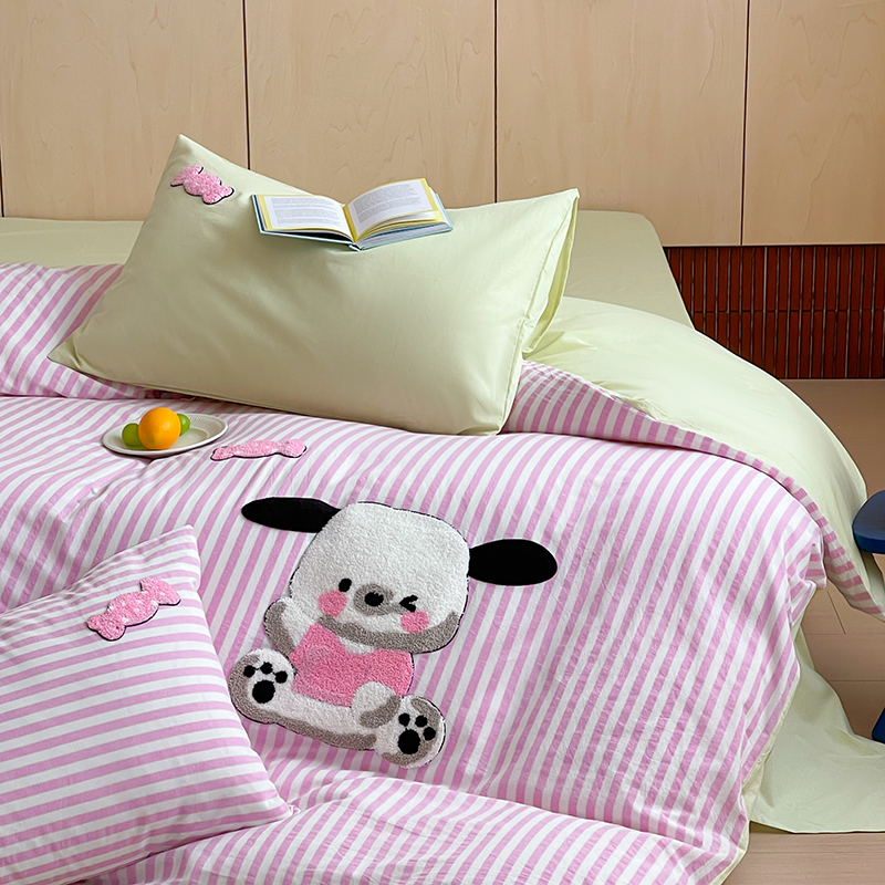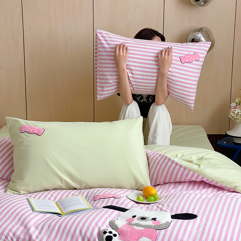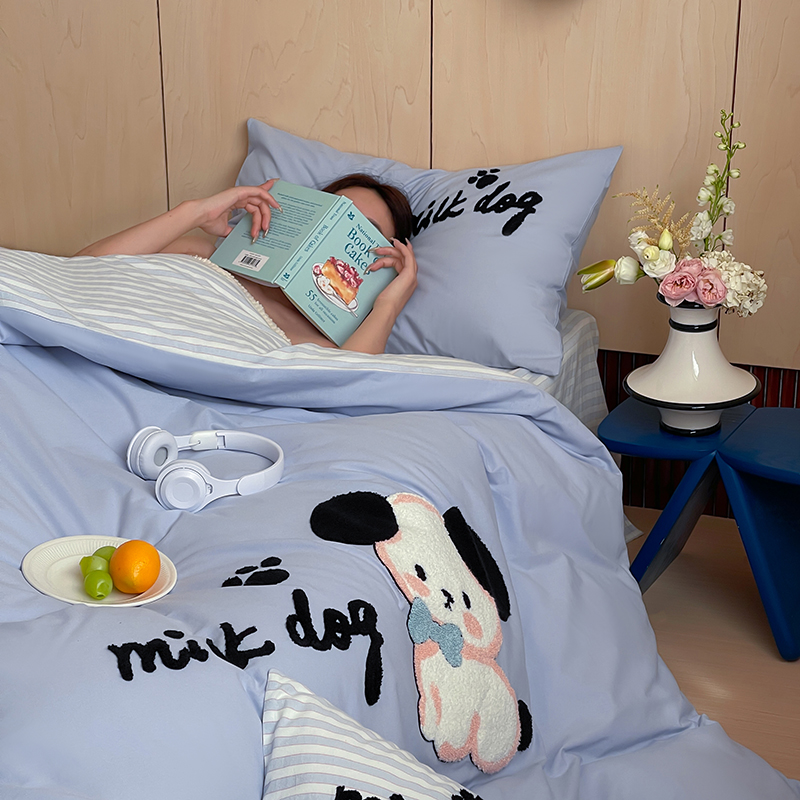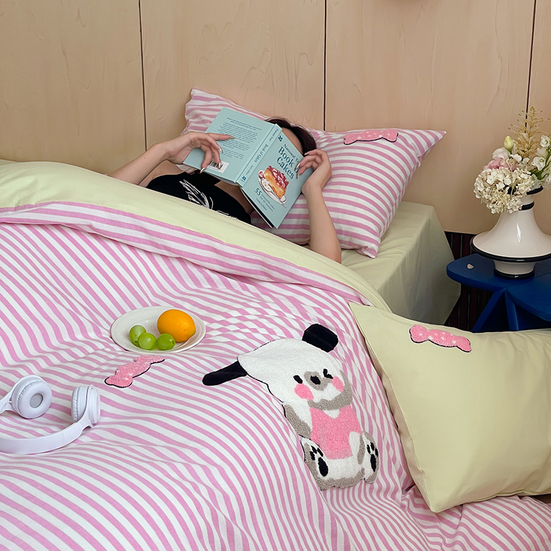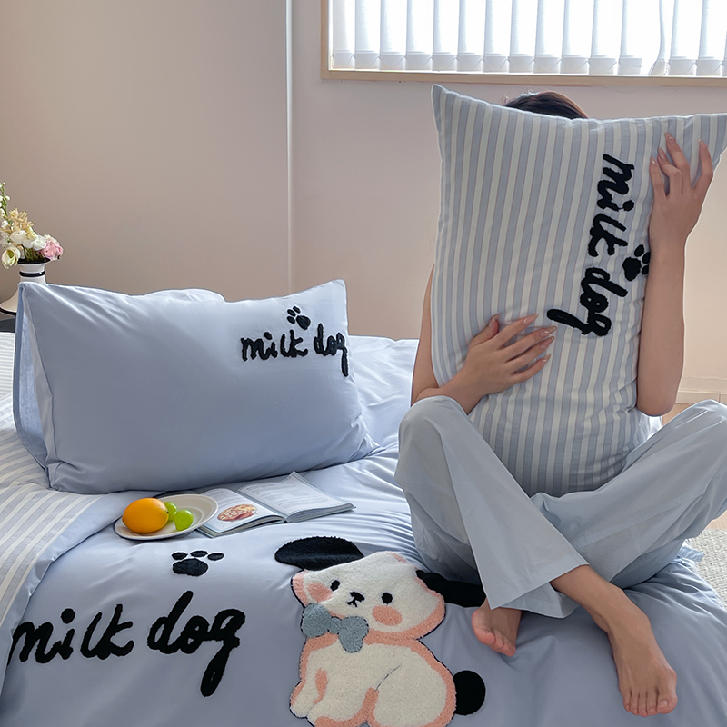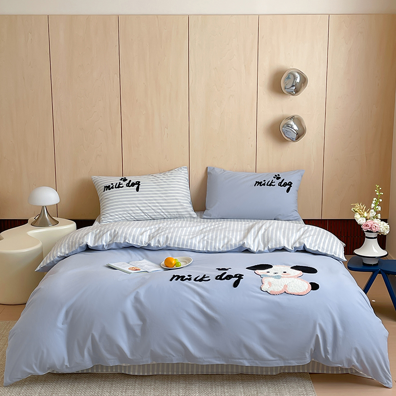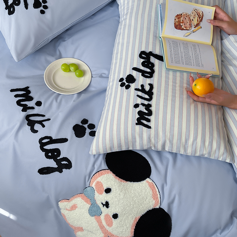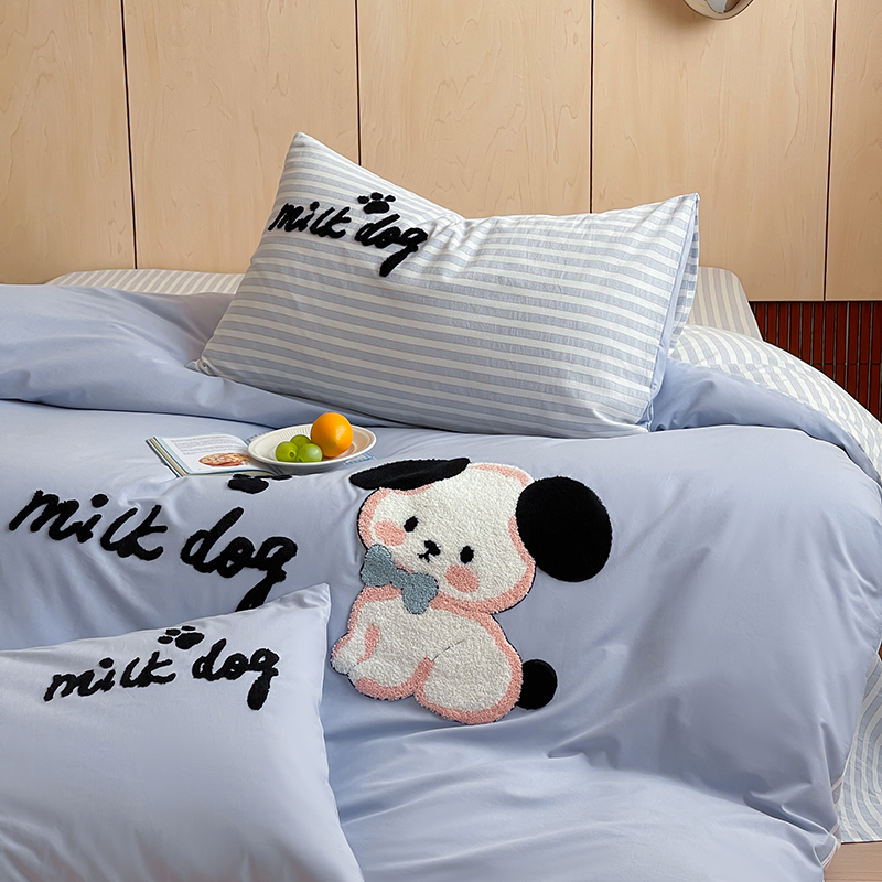 觅糖家纺 2024新款全棉水洗棉大版卡通毛巾绣四件套 糖果狗