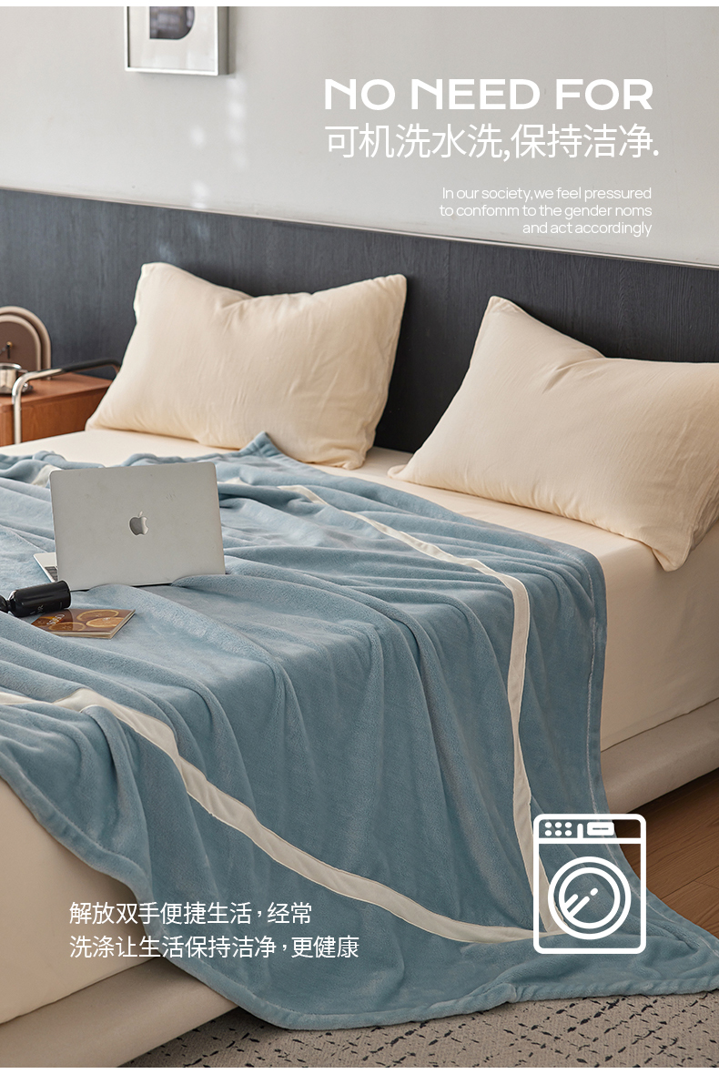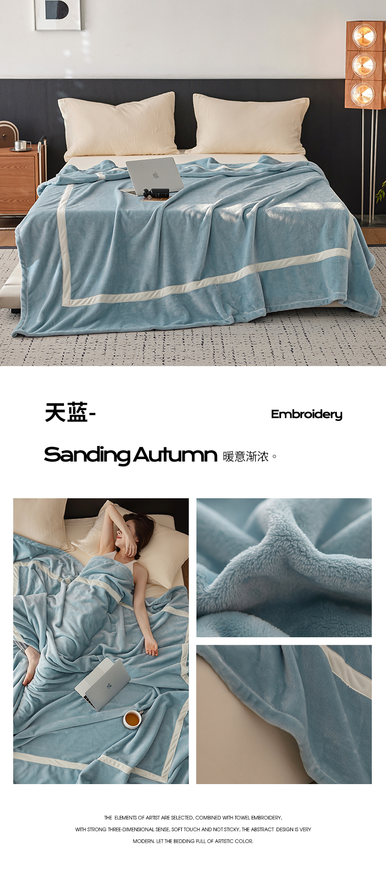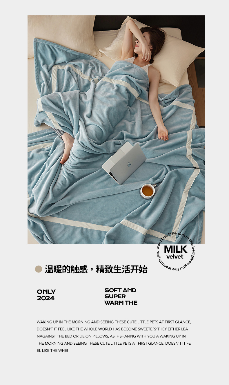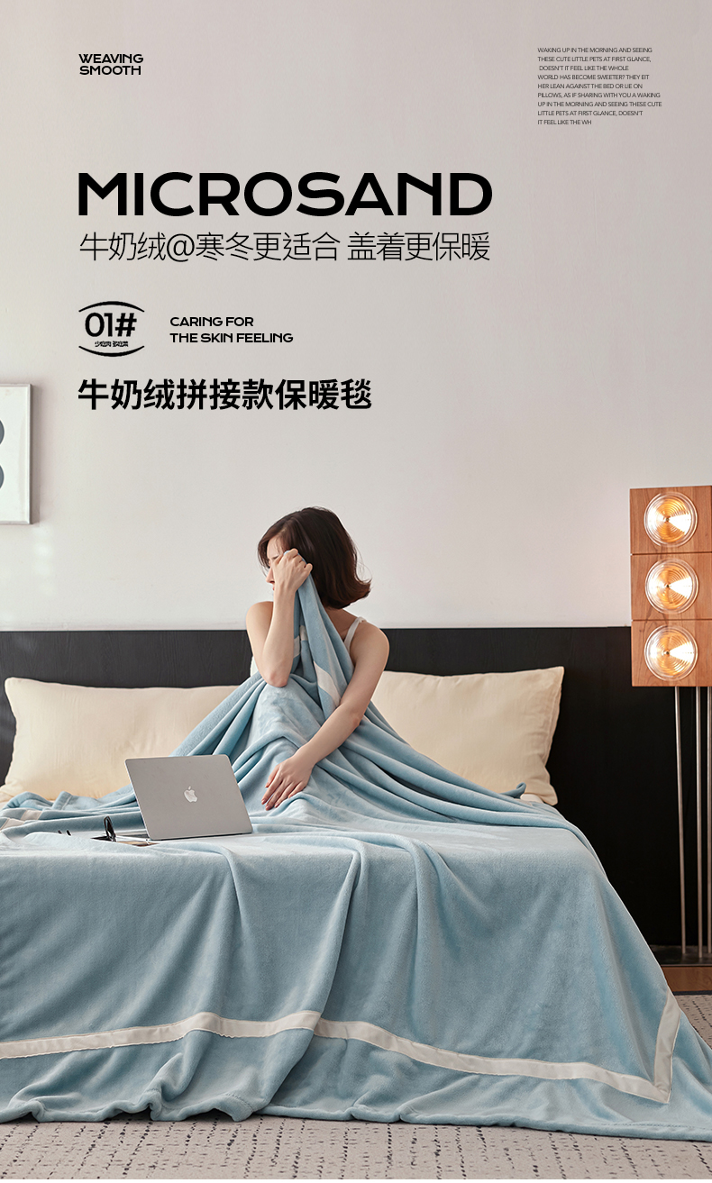 商品名称:铭动家纺 2024新款牛奶绒拼接款纯色保暖毯 天蓝