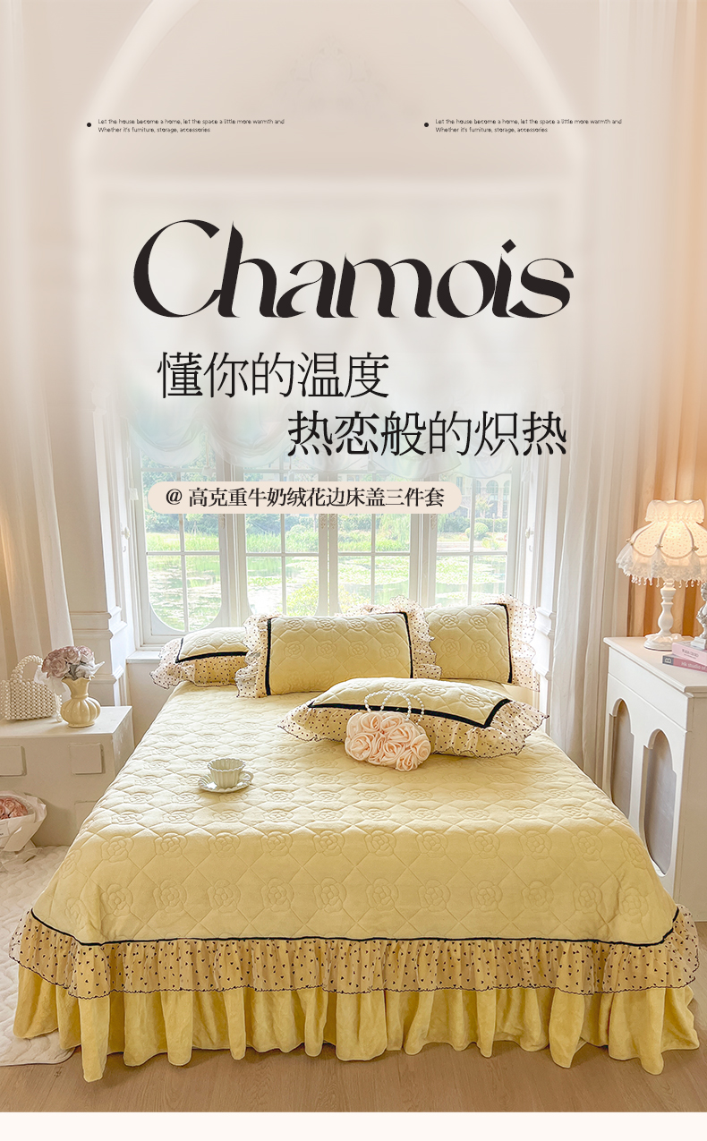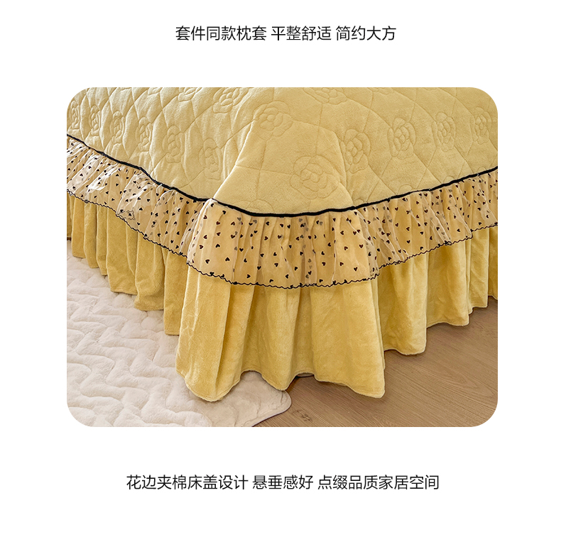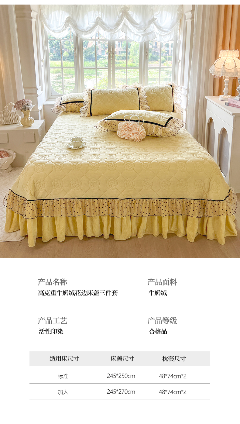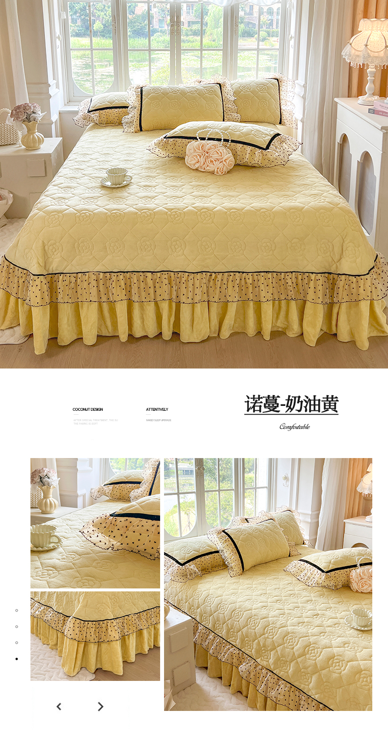 商品名称:网红馆(ck家纺) 2025新款牛奶绒花边床盖三件套-诺蔓 诺蔓-奶油黄