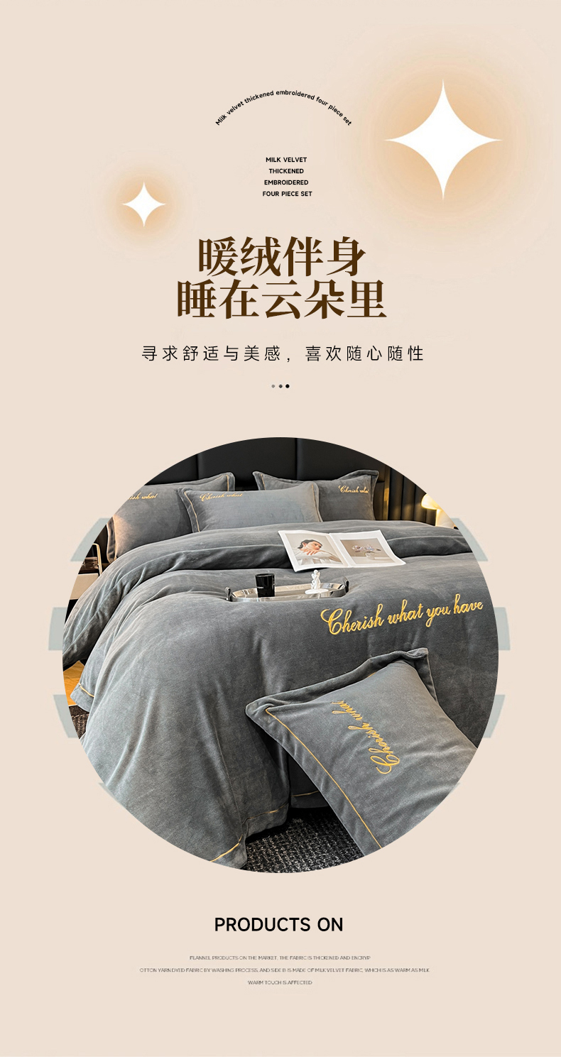 (总)鸿织源家纺 2025新款牛奶绒刺绣四件套-羽蝶,羽蝶-奶昔白+奶咖,羽蝶-宾利兰,羽蝶-豆沙色,羽蝶-极致灰,羽蝶-焦糖色,羽蝶-奶咖,羽蝶-玉色