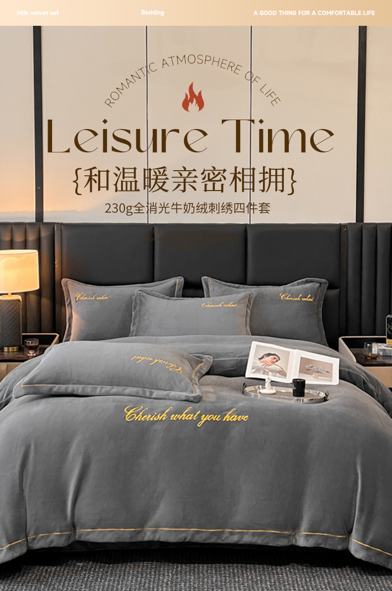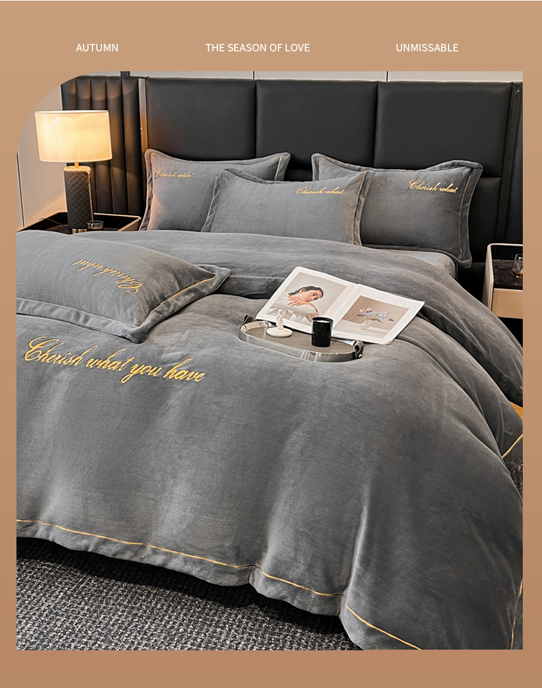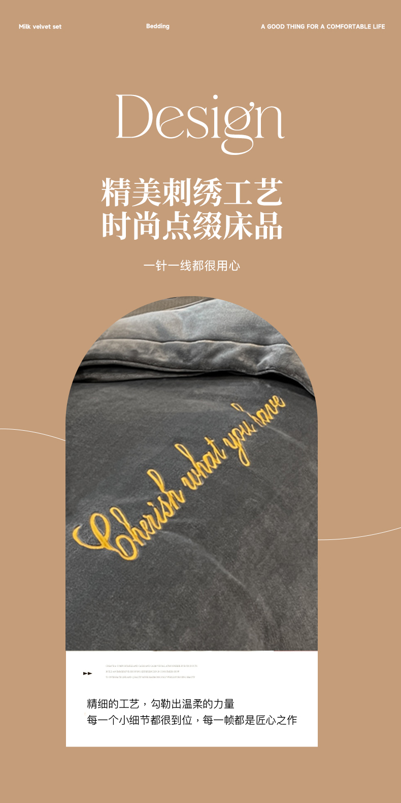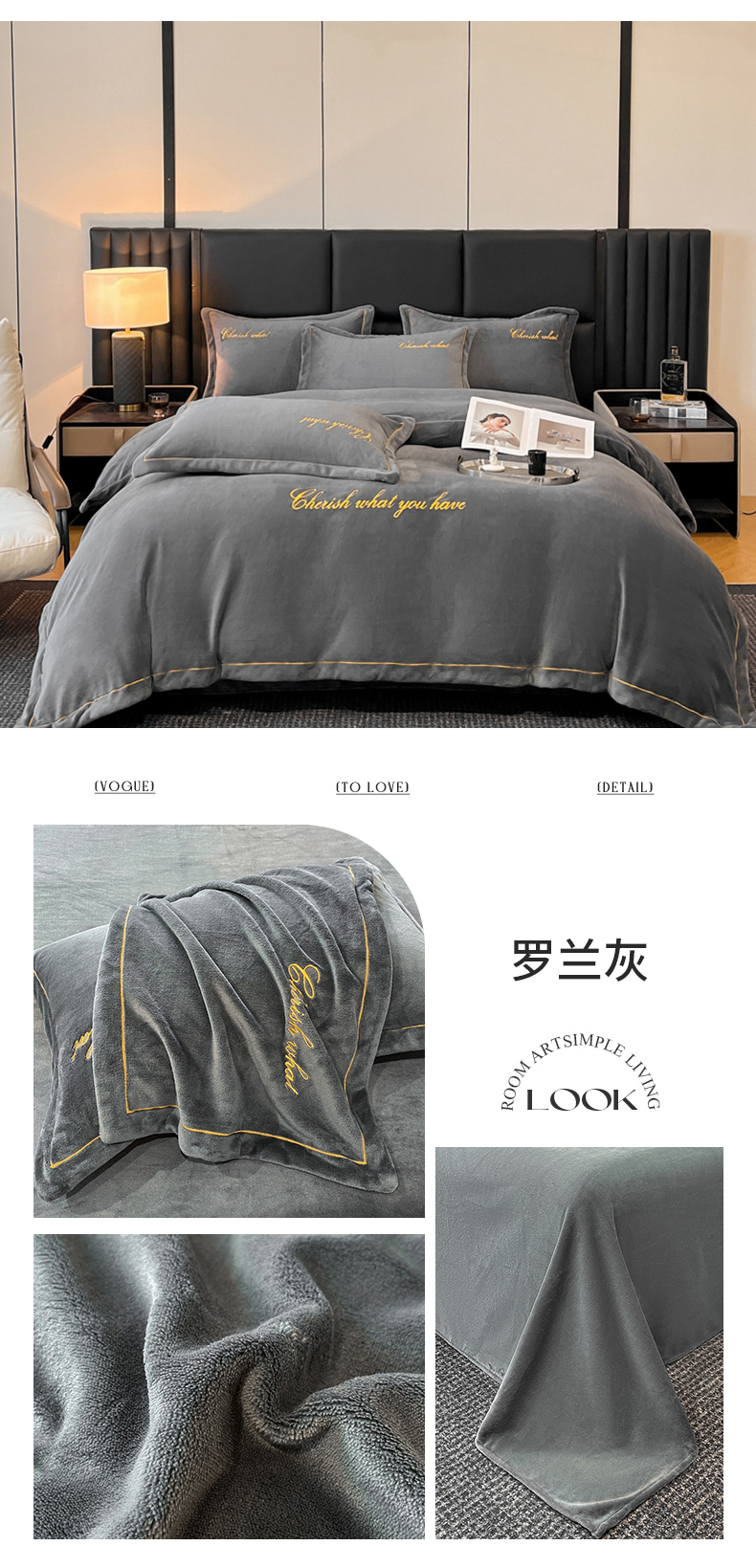 鸿织源家纺 2025新款230g全消光牛奶绒刺绣四件套 罗兰灰