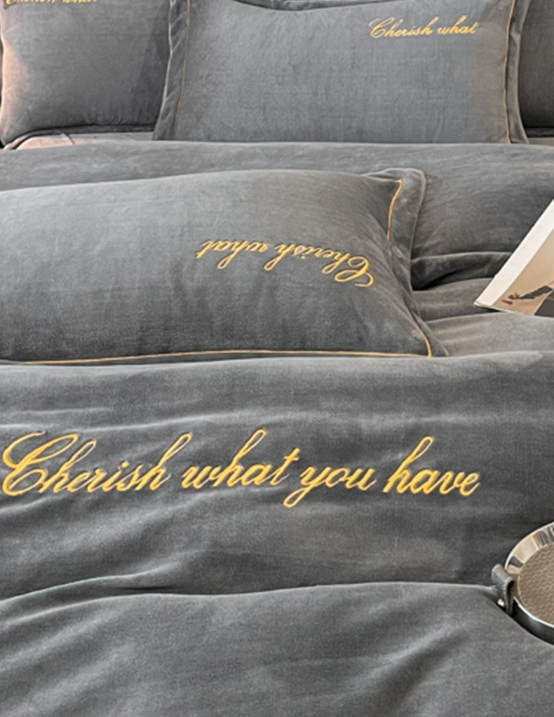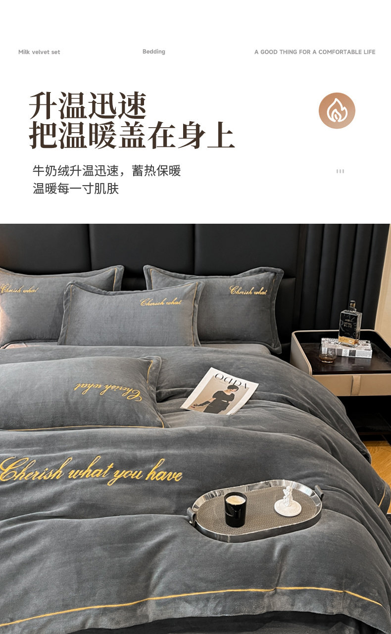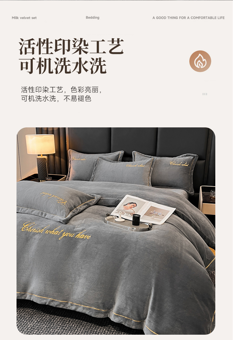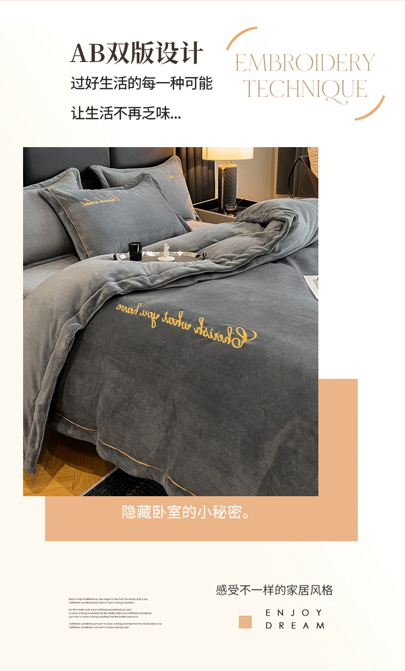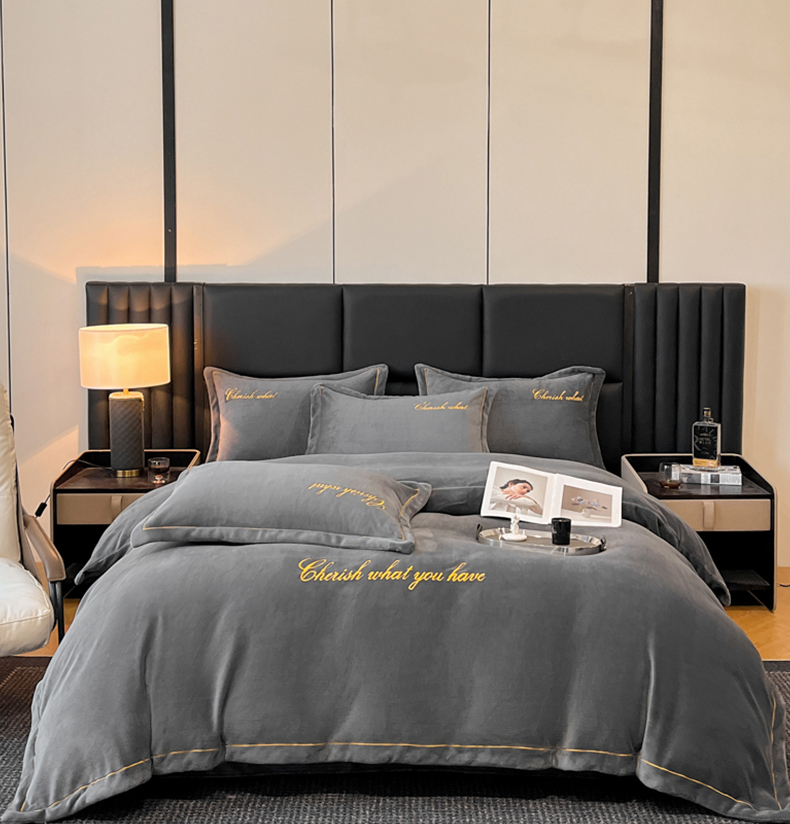 鸿织源家纺 2025新款230g全消光牛奶绒刺绣四件套 罗兰灰