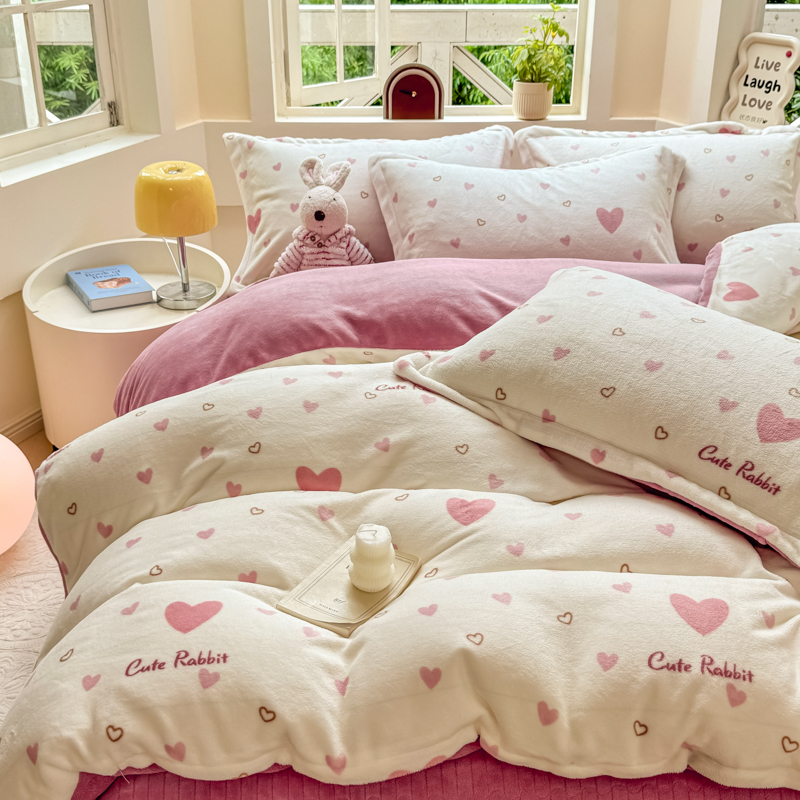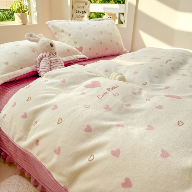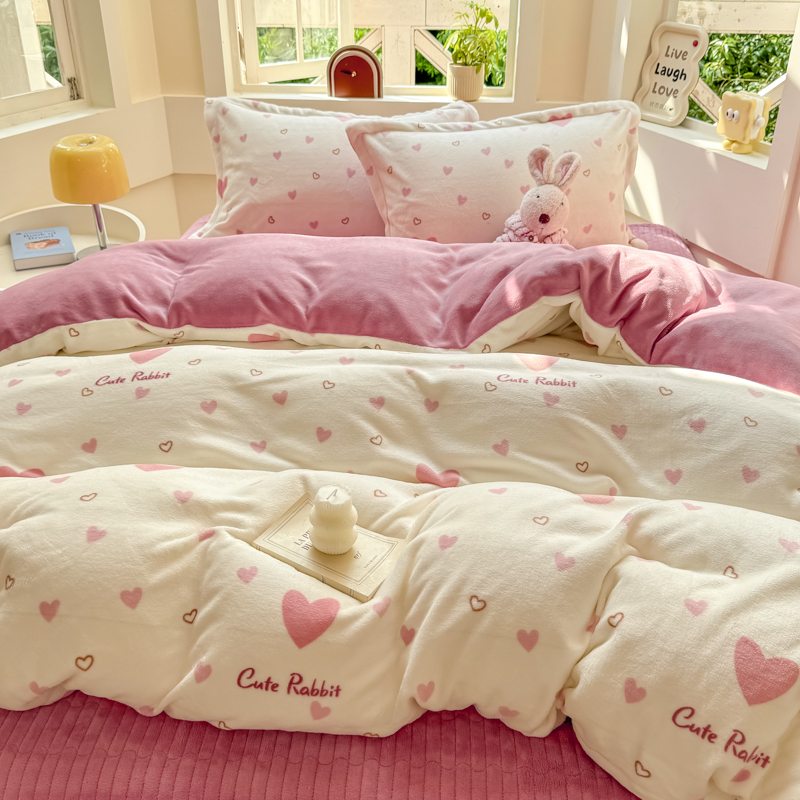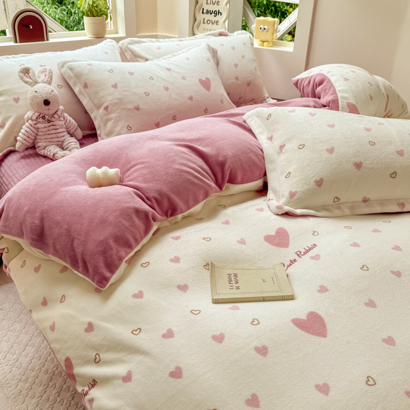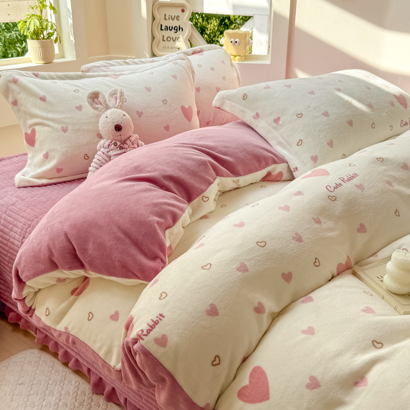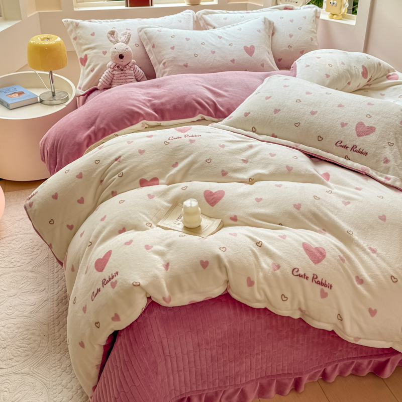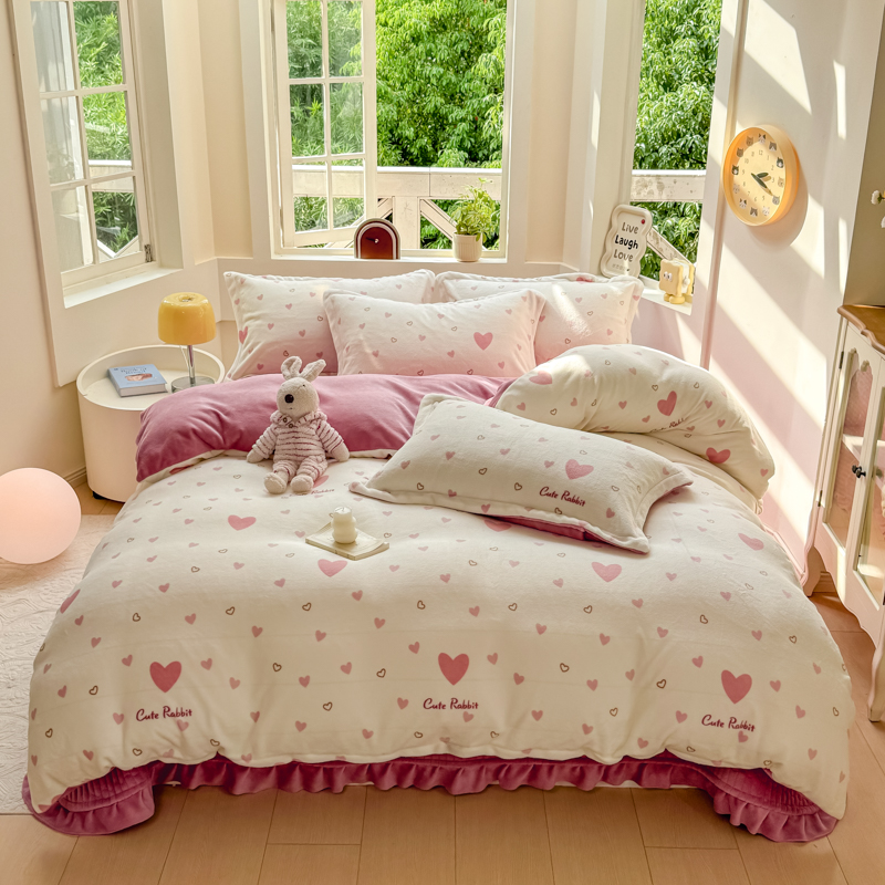 梦可莱家居 2024秋冬牛奶绒韩系ins印花床盖四件套 粉爱心