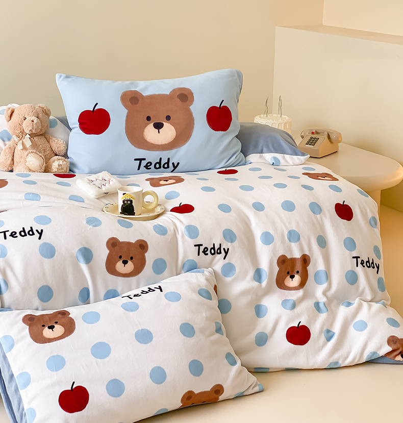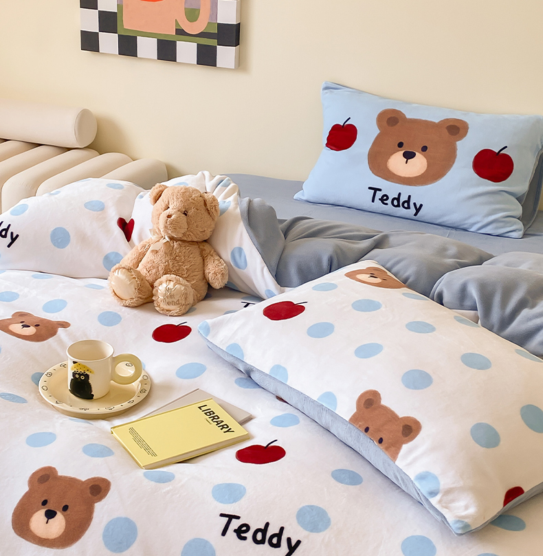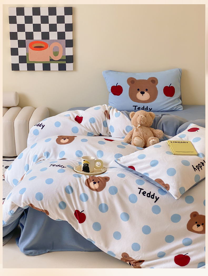 时光里 2024新款数码印花牛奶绒四件套 波点熊