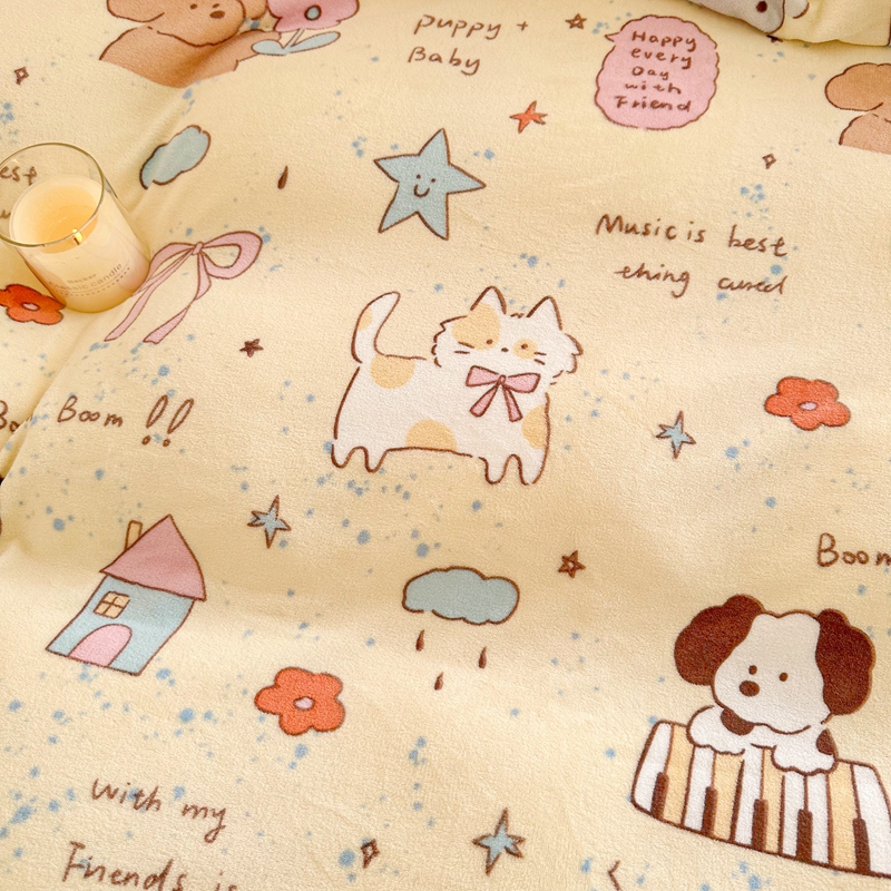 商品名称:呗旺鹿 2024新款高克重卡通印花毛巾绣牛奶绒四件套 宠物音乐会