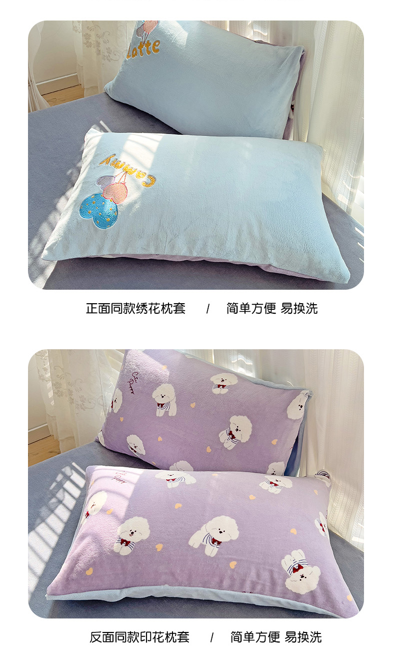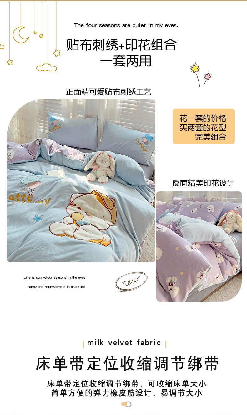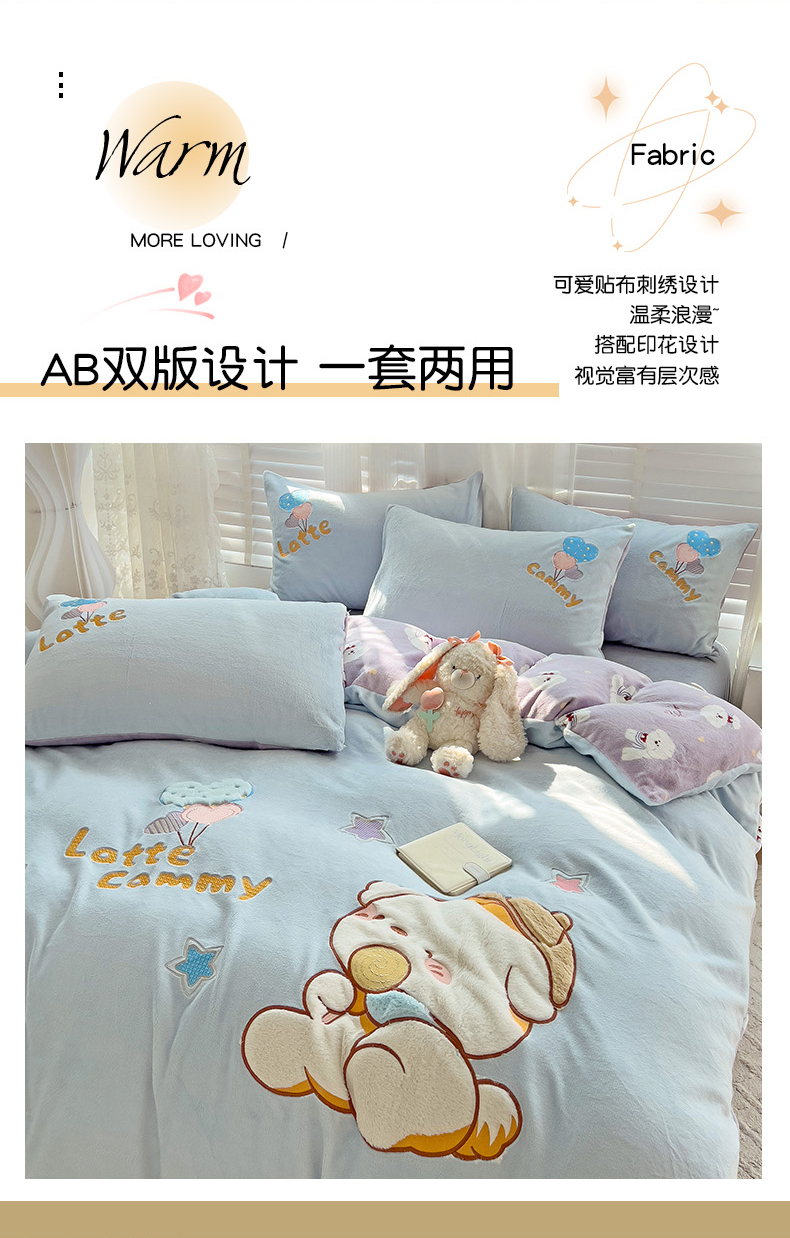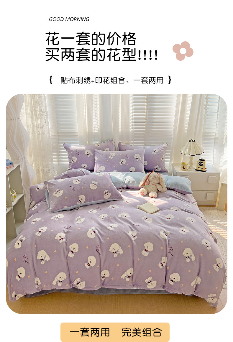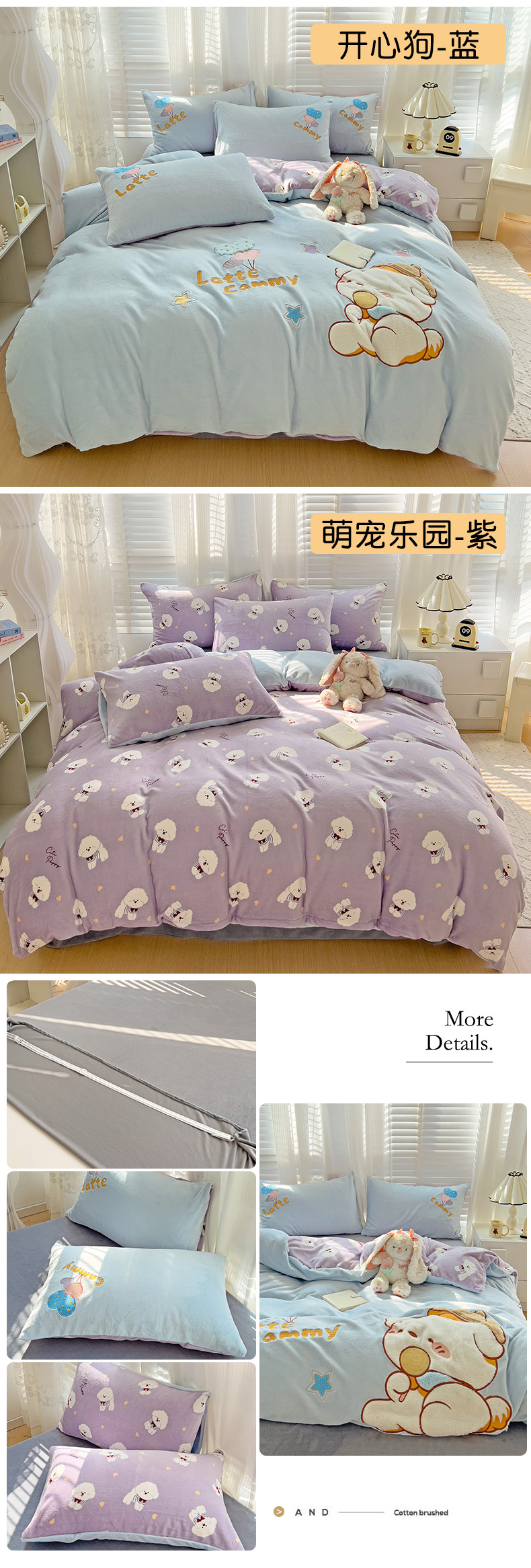 当前位置: 91家纺网 > 商品网购 > 床品套件 > 四件套 > 牛奶绒四件套 > 2024新款一套两款式加厚牛奶绒贴布刺绣加印花四件套 开心狗-蓝贴布绣-萌宠乐园-紫印花