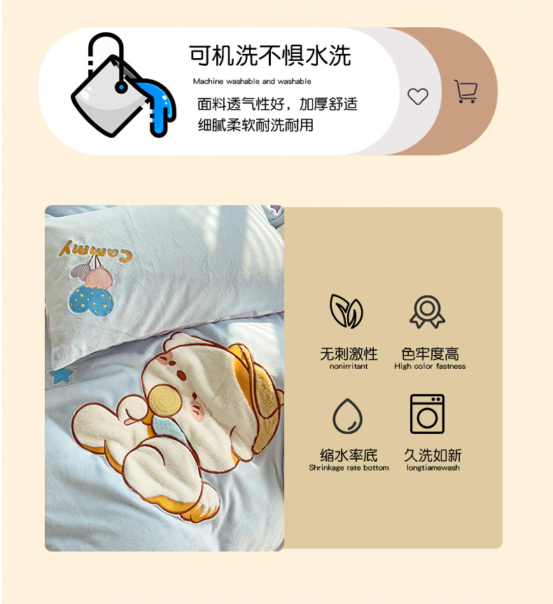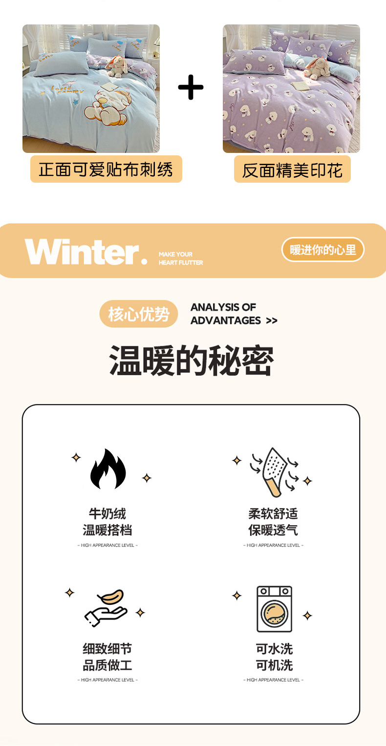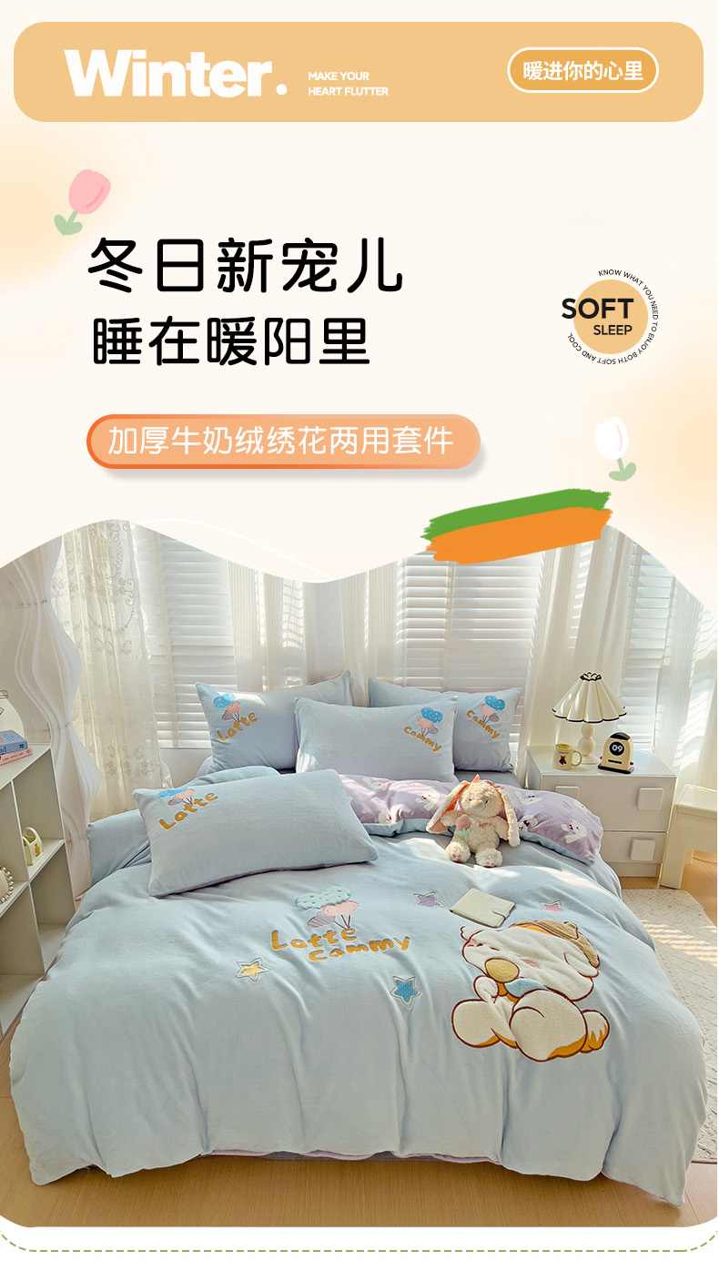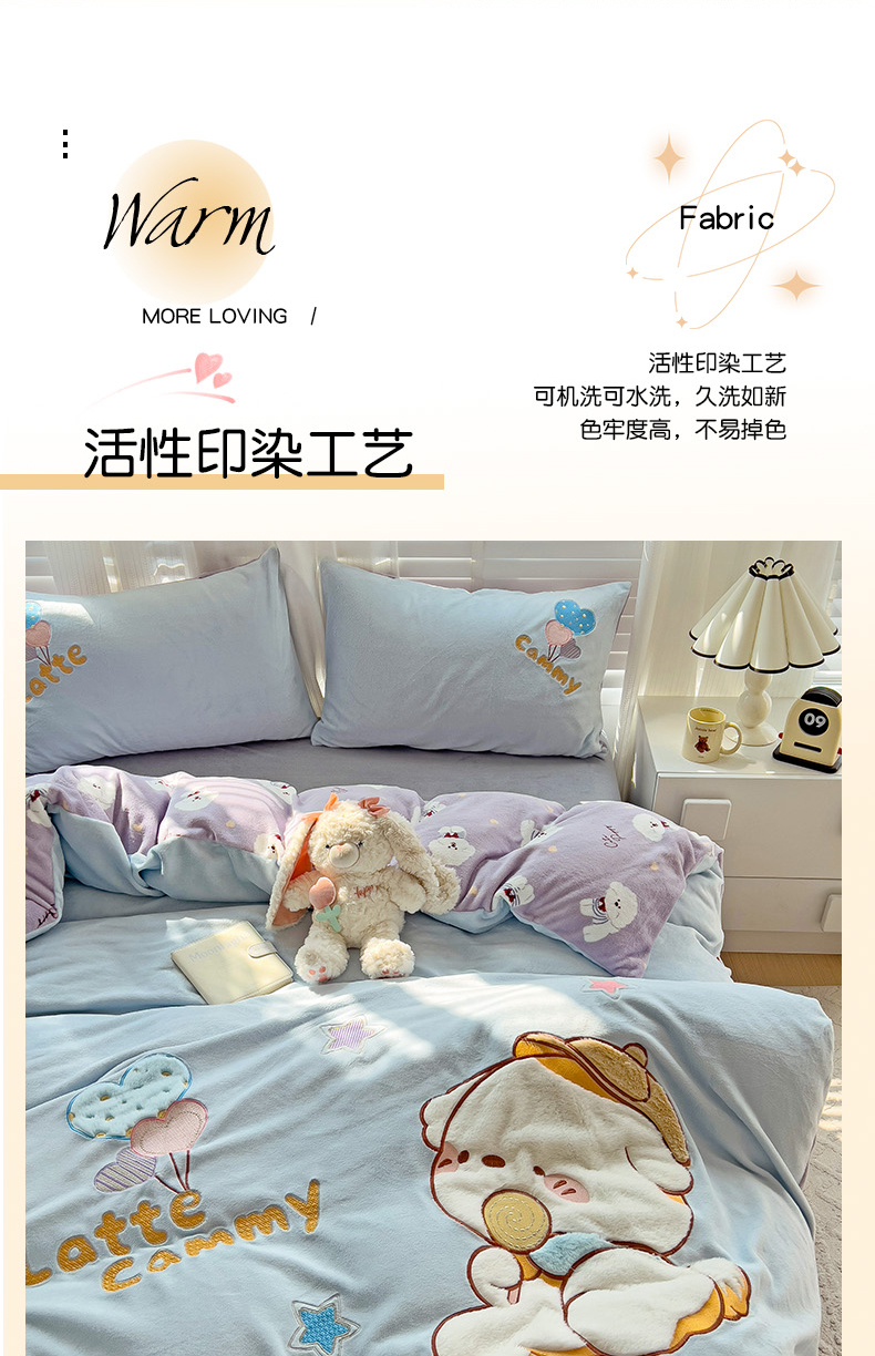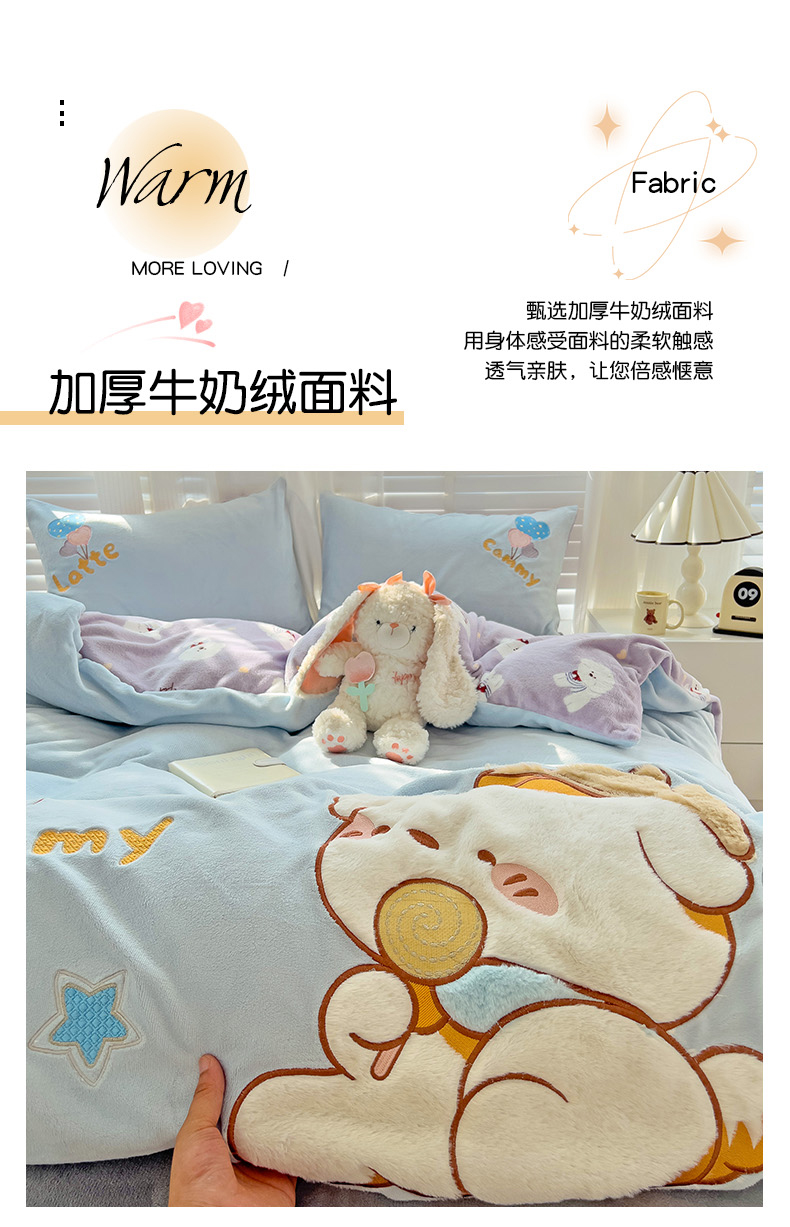 当前位置: 91家纺网 > 商品网购 > 床品套件 > 四件套 > 牛奶绒四件套 > 2024新款一套两款式加厚牛奶绒贴布刺绣加印花四件套 开心狗-蓝贴布绣-萌宠乐园-紫印花