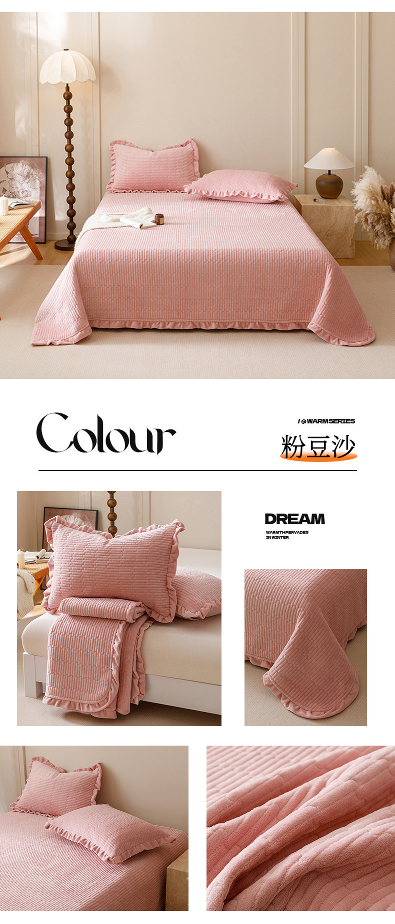 (总)富瑞阁 2024新款牛奶绒宝宝绒韩版花边床盖三件套单品,粉豆沙,粉色,芙蓉绿,浅灰,浅驼,深驼
