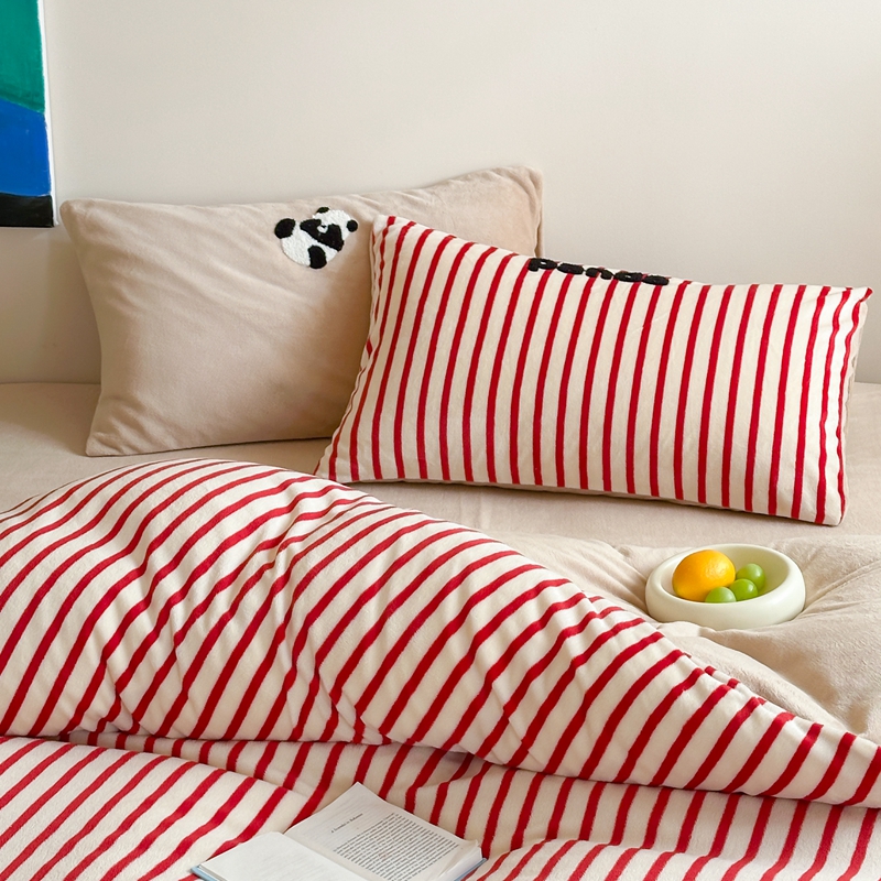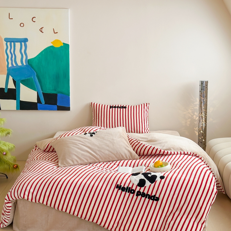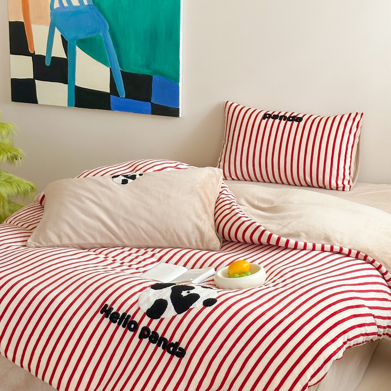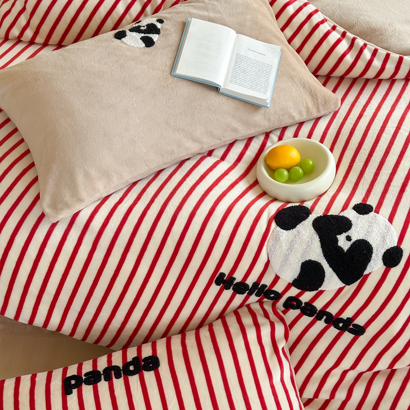 商品名称:时年家纺 2024新款牛奶绒毛巾绣系列四件套(充值会员优惠5元) 条纹熊猫-红