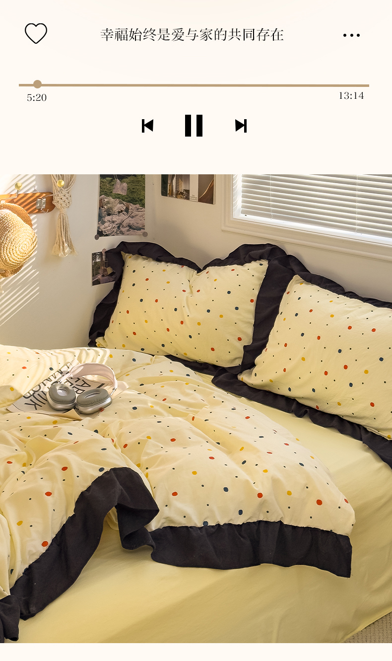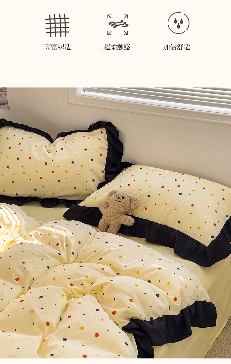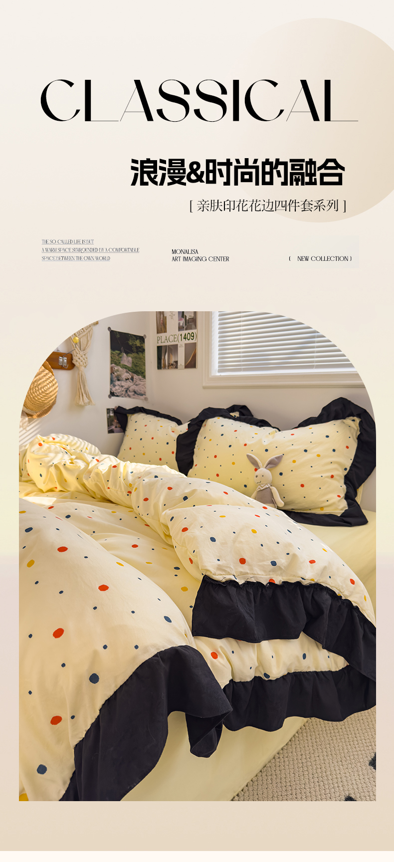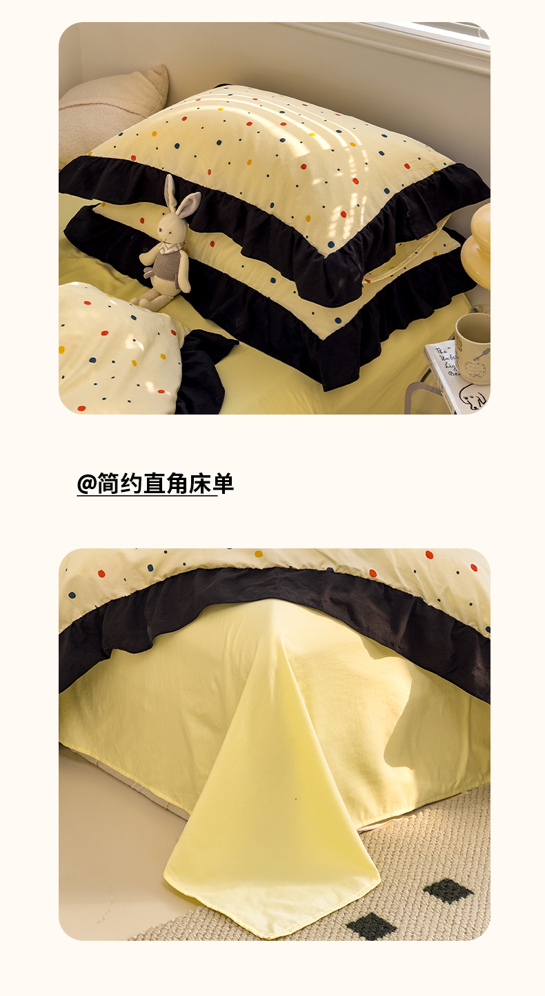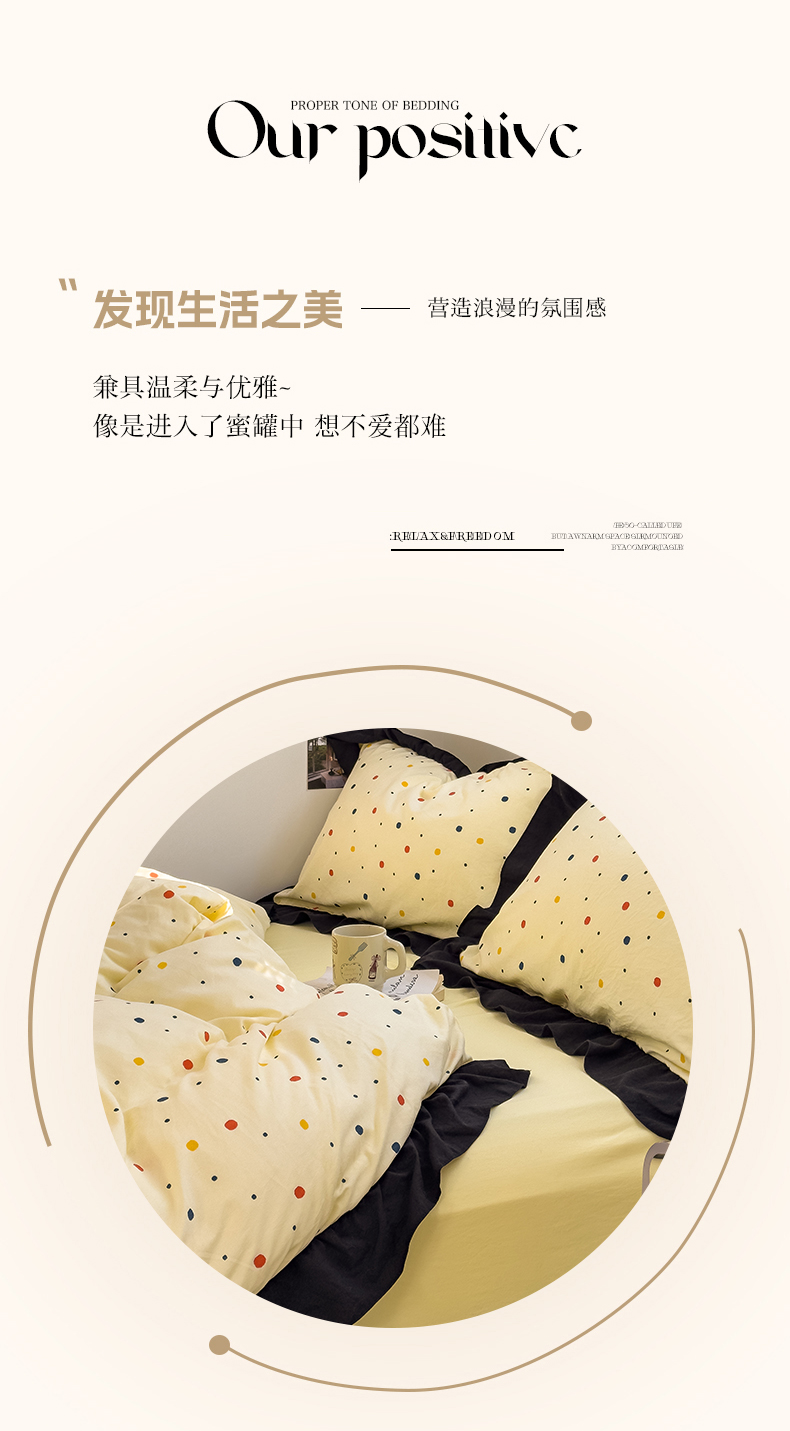 当前位置: 91家纺网 > 商品网购 > 床品套件 > 四件套 > 双层纱四件套 > 繁花家居 2025新款黑色花边赫本风水洗棉双层纱针织棉韩式花边四件套 黄梦星辰