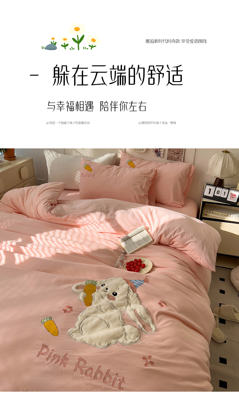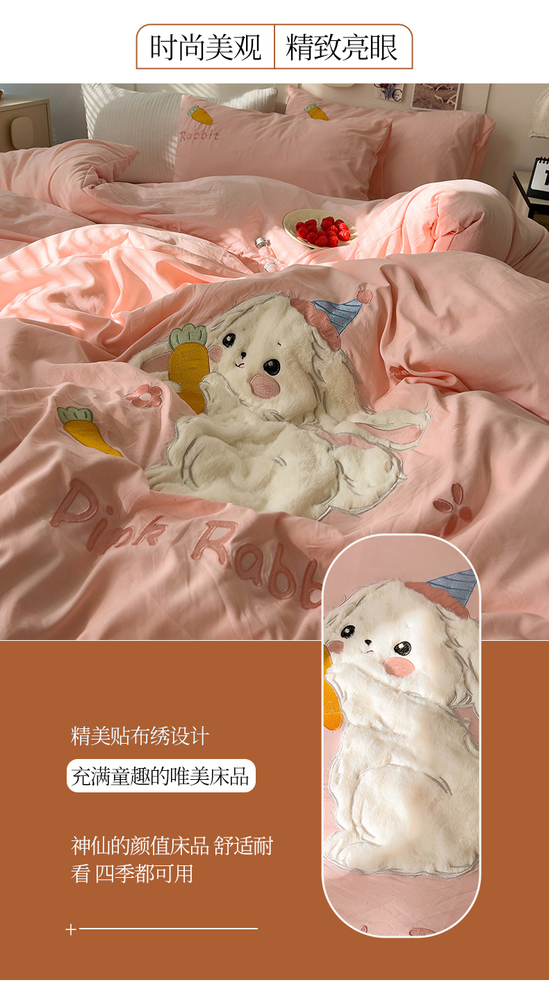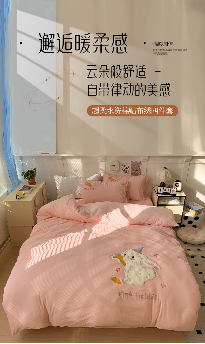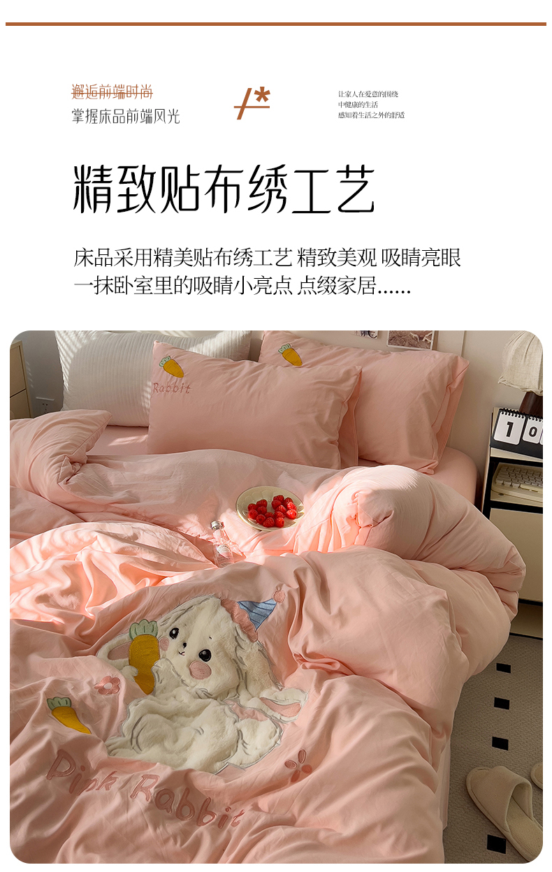当前位置: 91家纺网 > 商品网购 > 床品套件 > 四件套 > 毛巾绣四件套 > 水墨江南 2025新款超柔水洗棉贴布绣四件套 萝卜兔粉