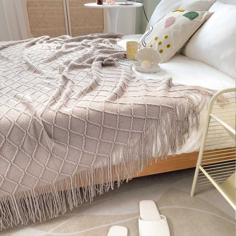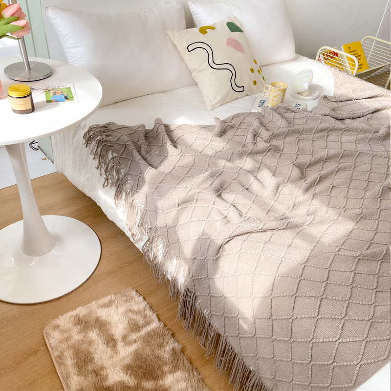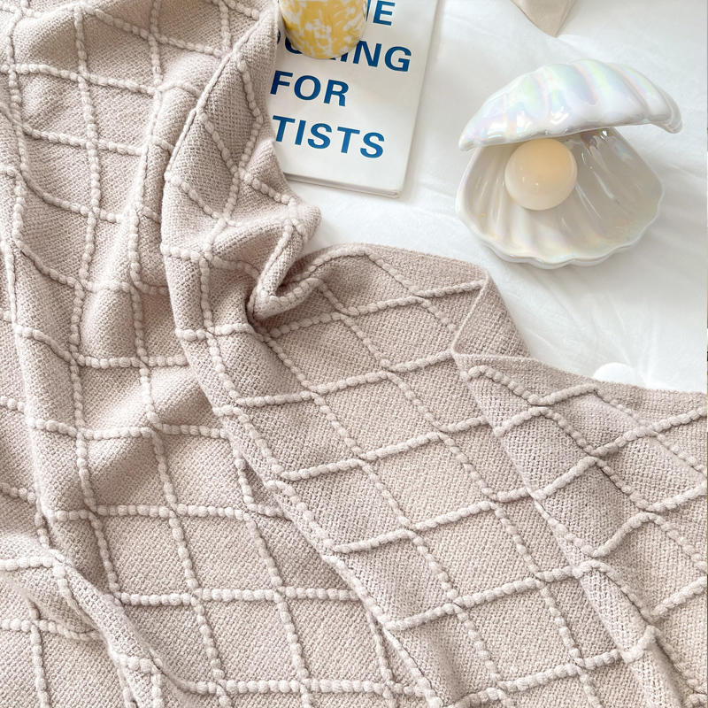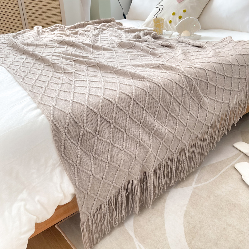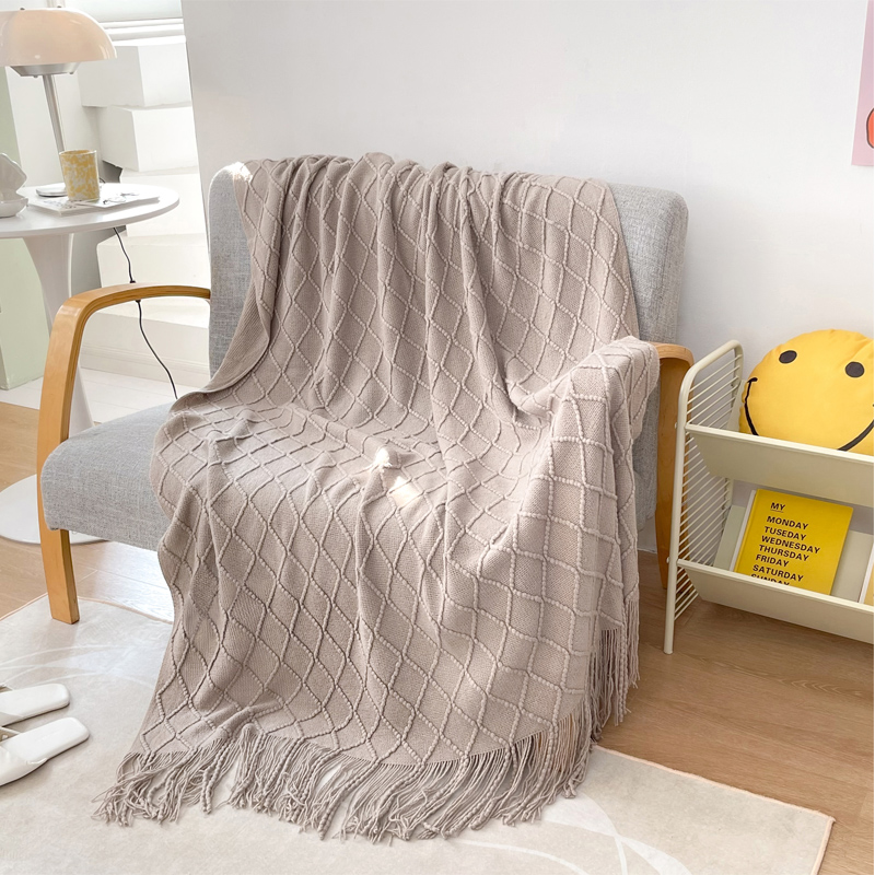 朴尔家纺-毛巾被 2025新款菱形格条纹流苏手工针织毯 浅咖色