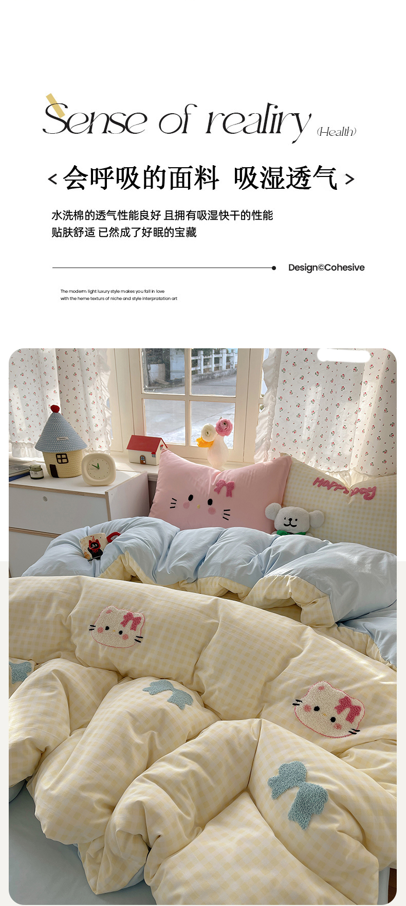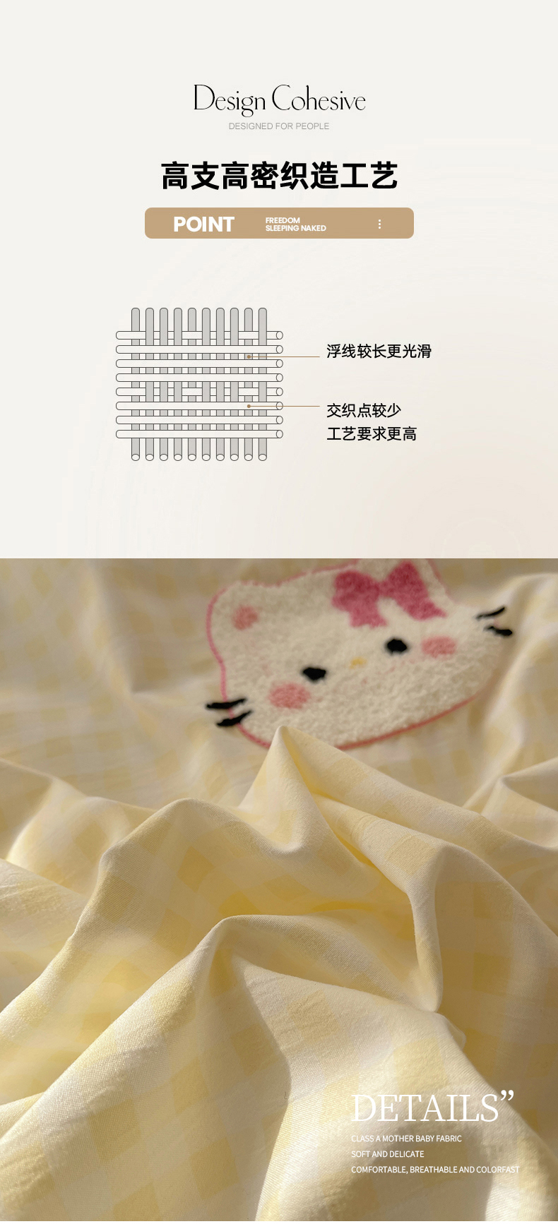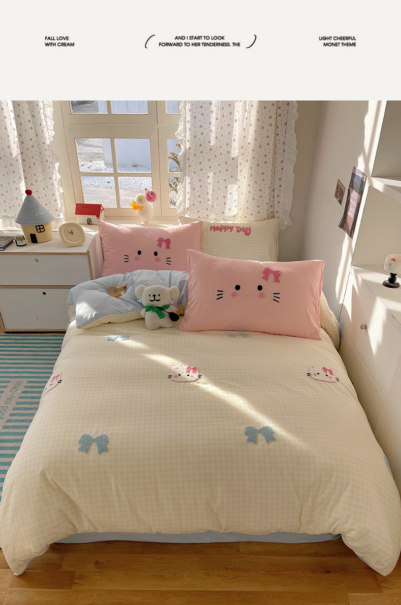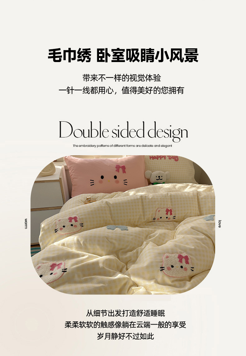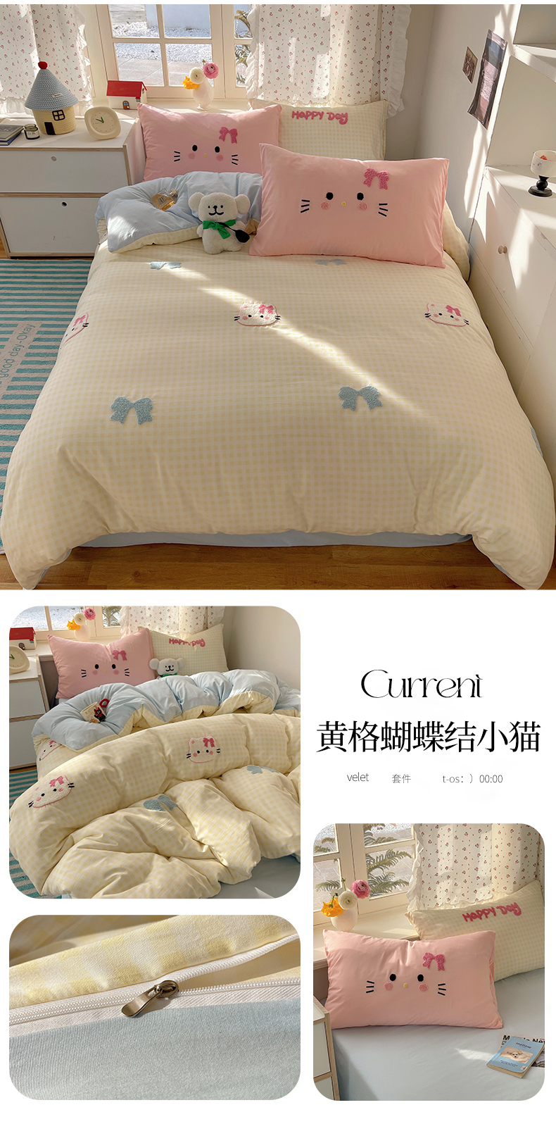 当前位置: 91家纺网 > 商品网购 > 床品套件 > 四件套 > 毛巾绣四件套 > 红嘴企鹅 2025新款水洗棉毛巾绣四件套 黄格蝴蝶结小猫