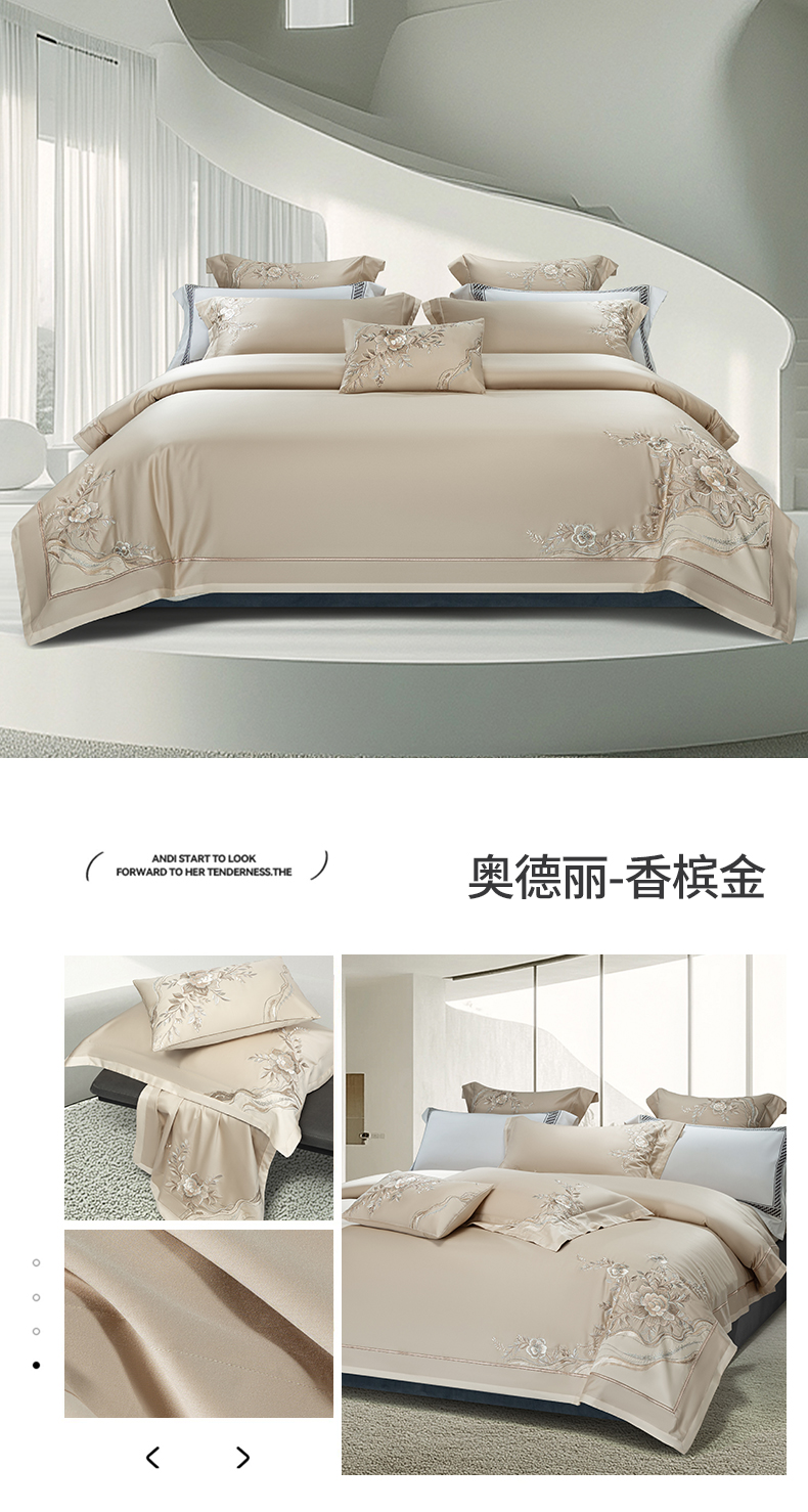 商品名称:高大尚婚庆馆 2025春夏新款 长绒棉高端绣花四件套-奥德丽 奥德丽-香槟金
