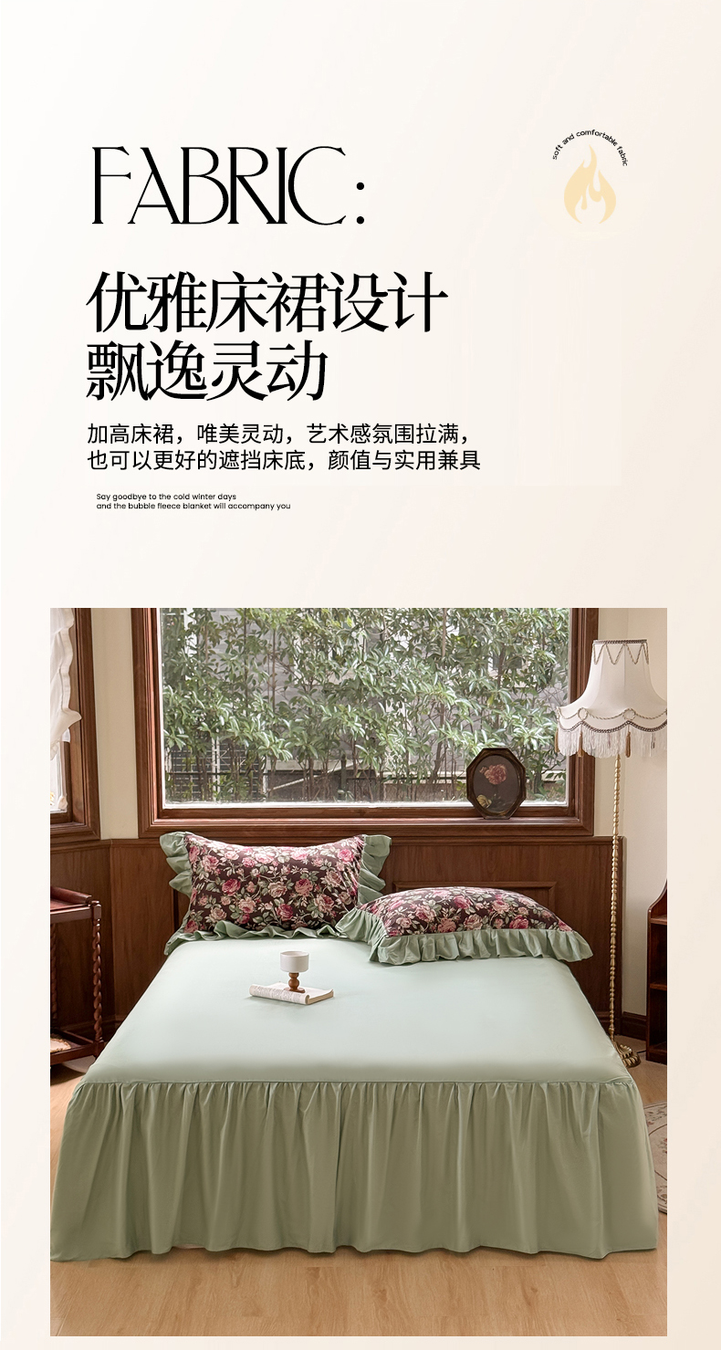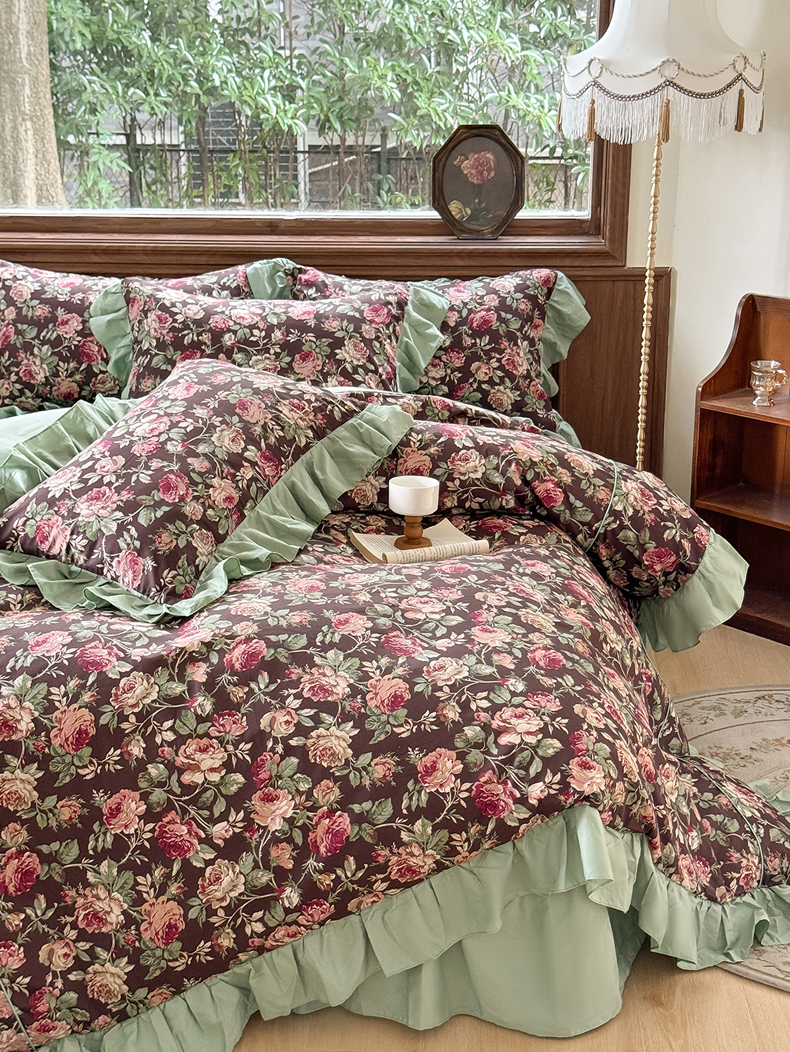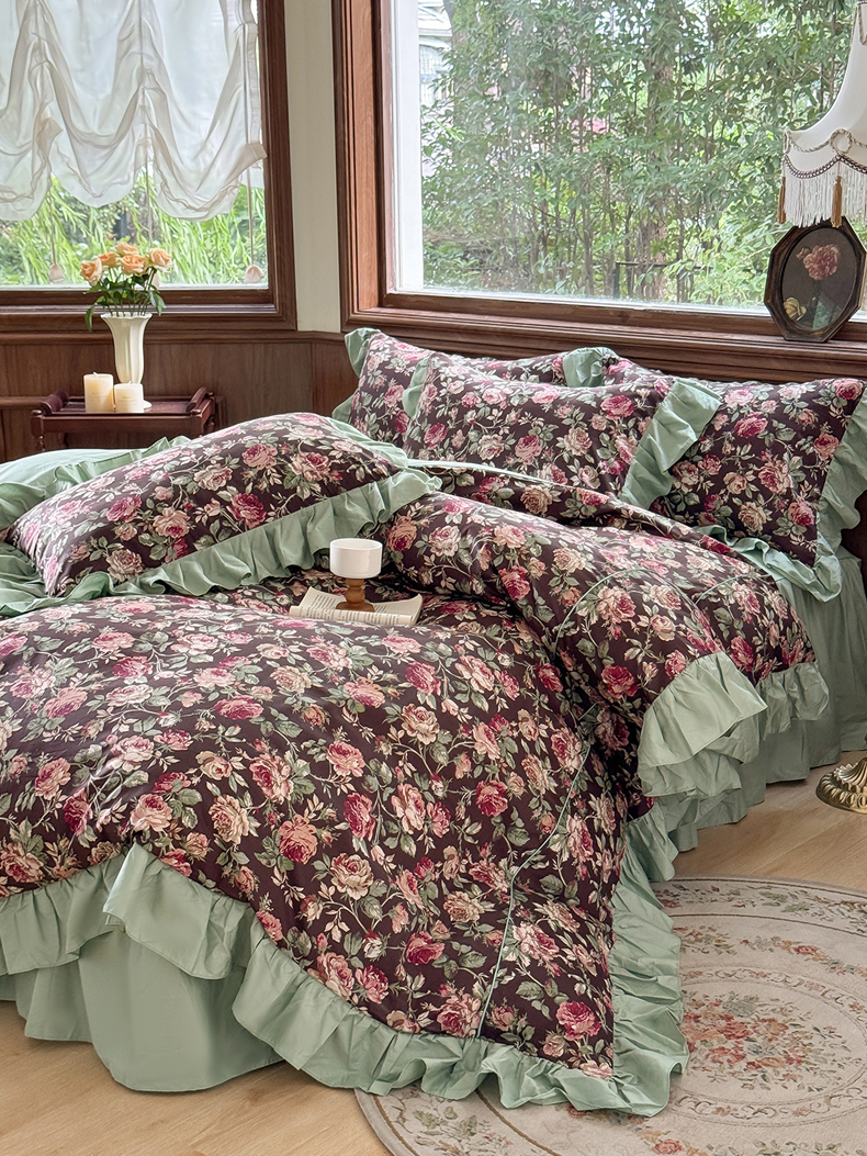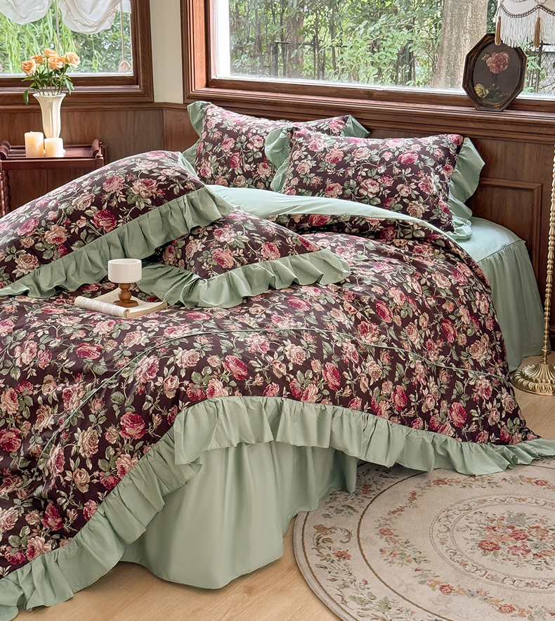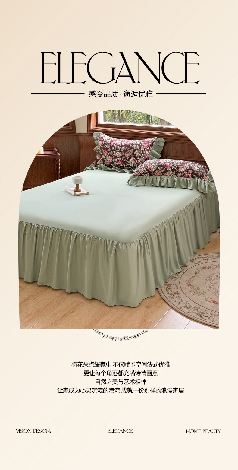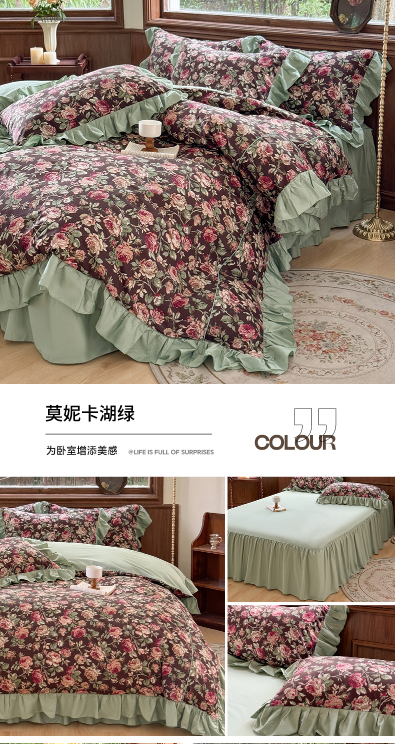 商品名称:胜权家纺 2025新款全棉13372法式床裙款活性印花四件套 莫妮卡-湖绿