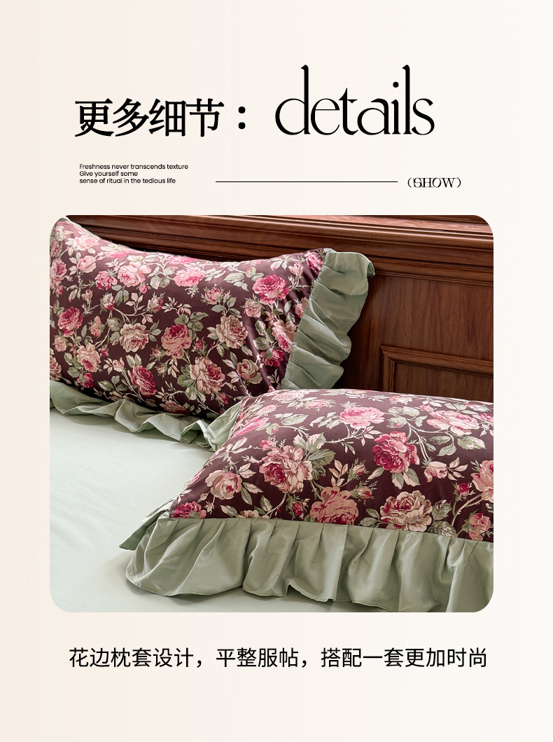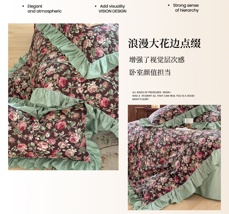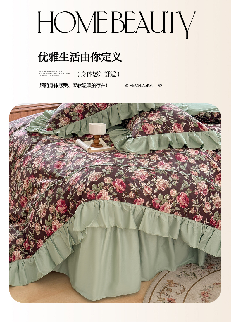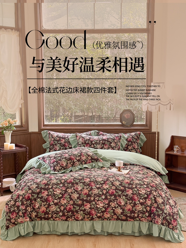 (总)胜权家纺 2025新款全棉13372法式床裙款活性印花四件套,莫妮卡-湖绿,莫妮卡-酒红