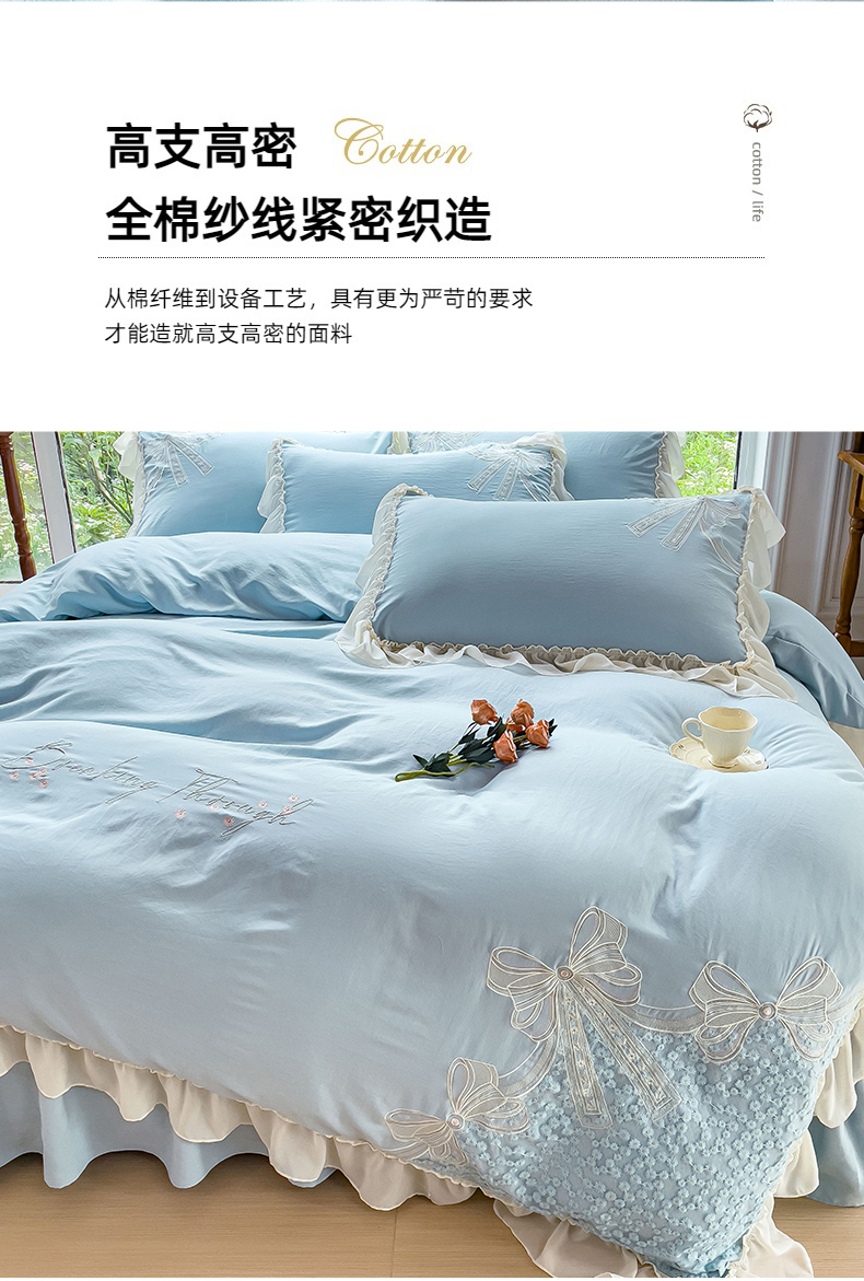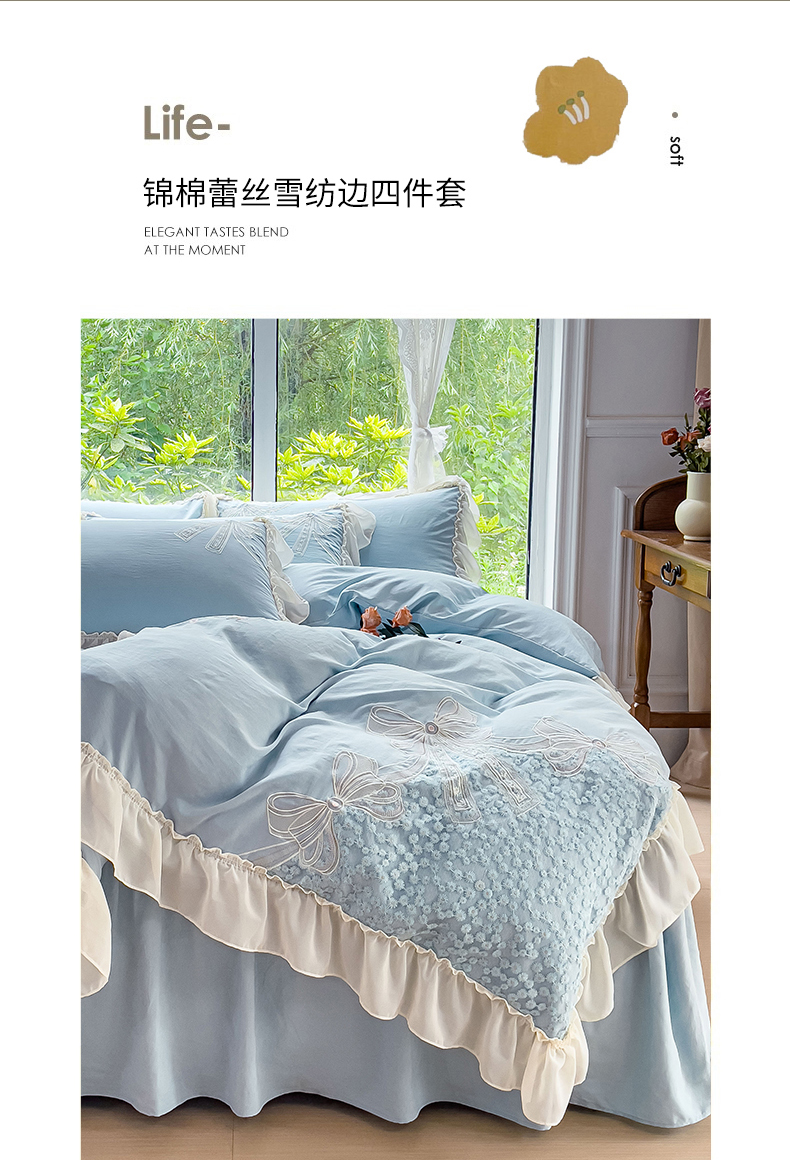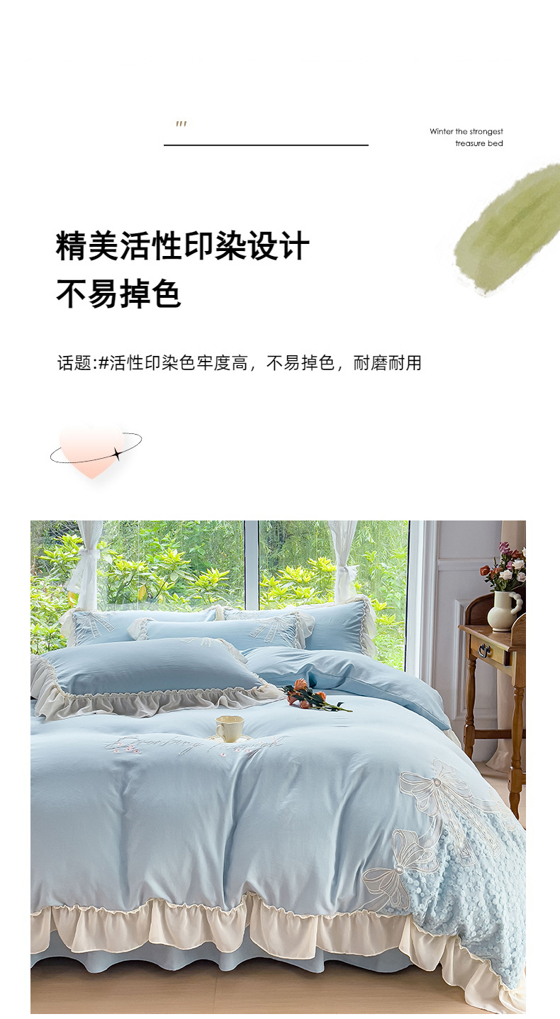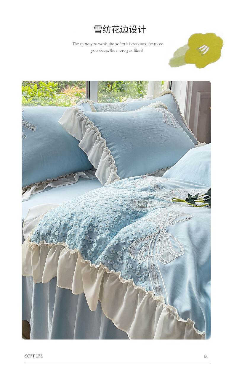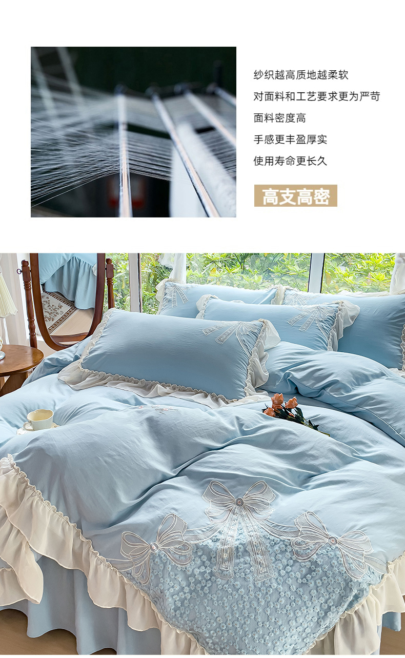 商品名称:睡美人 2025韩版全锦棉刺绣公主风蕾丝床裙款四件套-蝶恋花 蝶恋花-青春兰