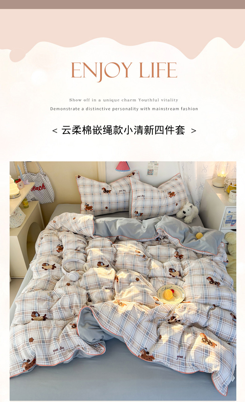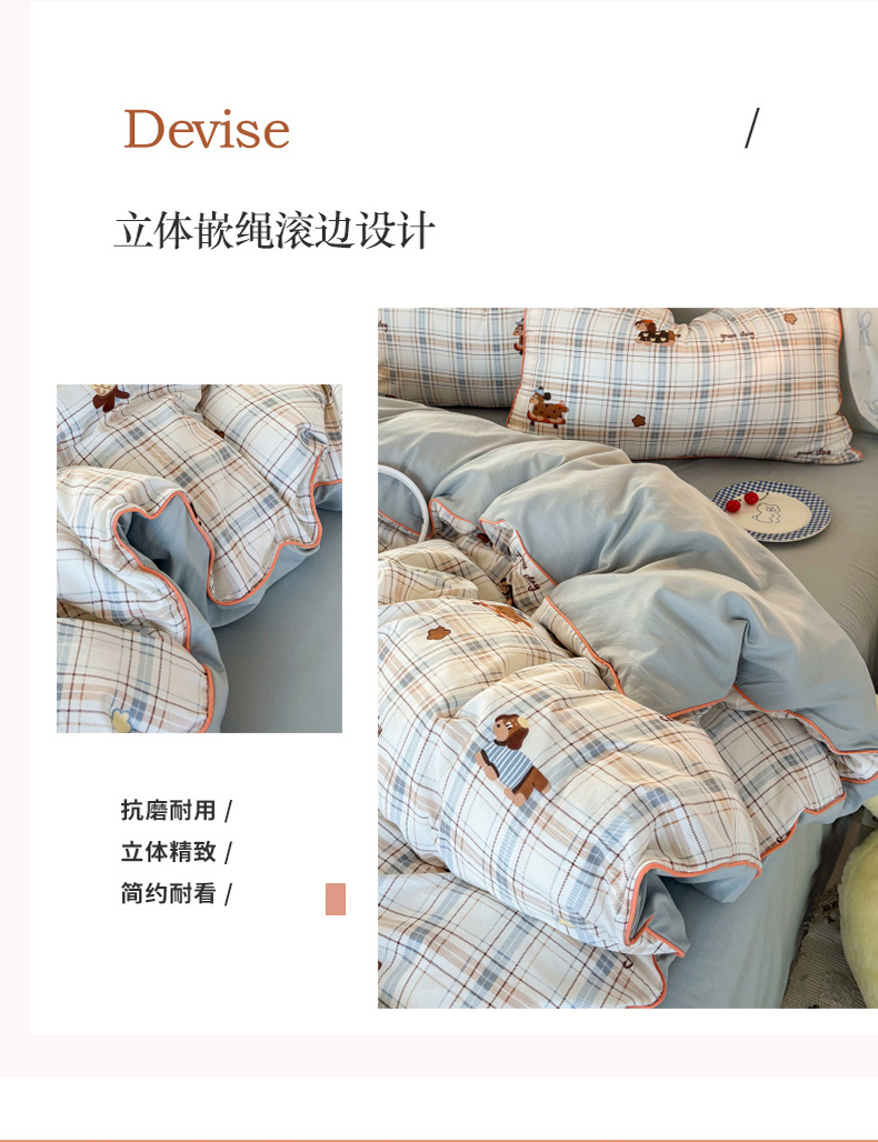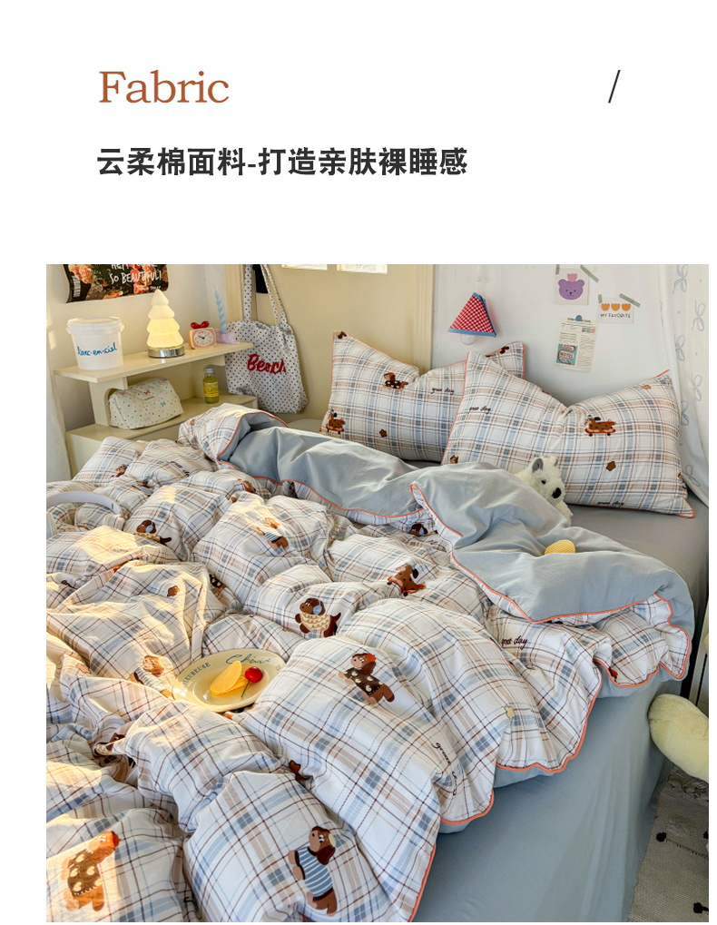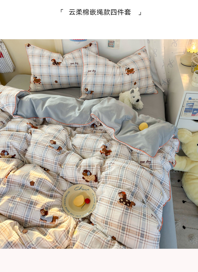 商品名称:潮邦创意家居 2025新款云柔棉立体嵌绳款小清新四件套 蓝格萌趣