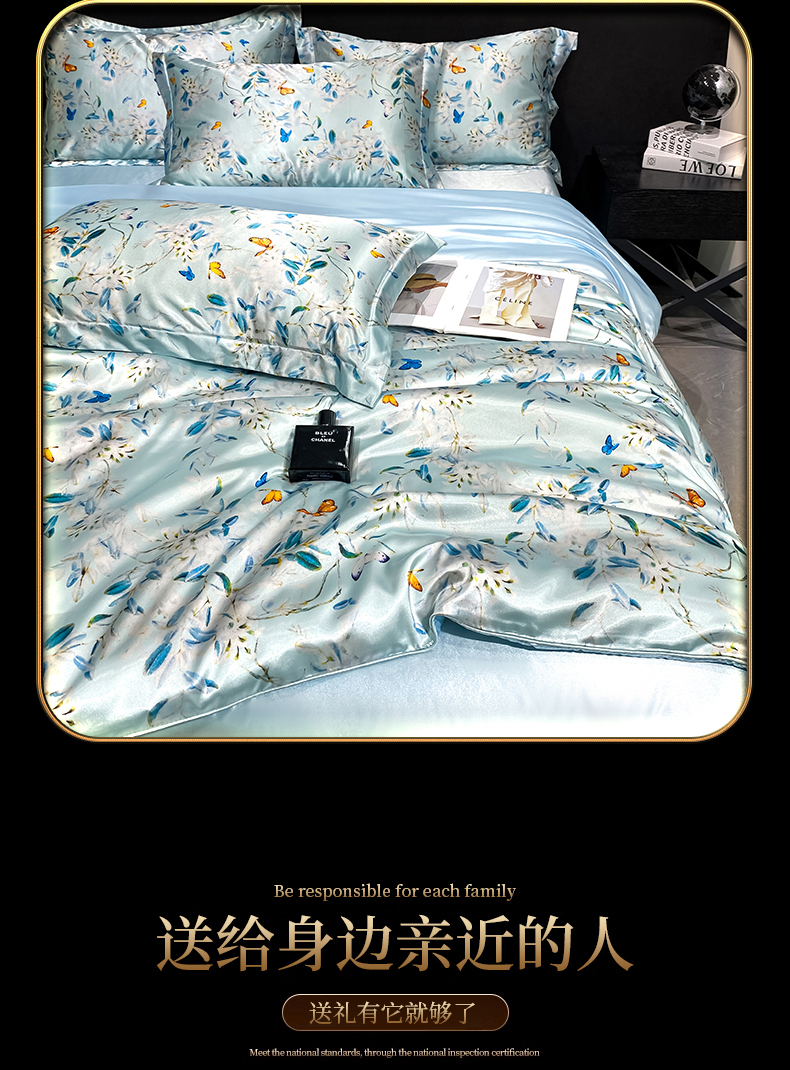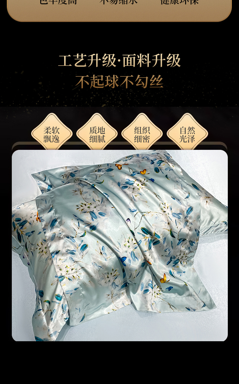 商品名称:黄鹂鸟 2025新款高端轻奢丝滑裸睡丝绸数码印花水洗真丝天丝四件套系列 -风格四 缤纷蝶梦