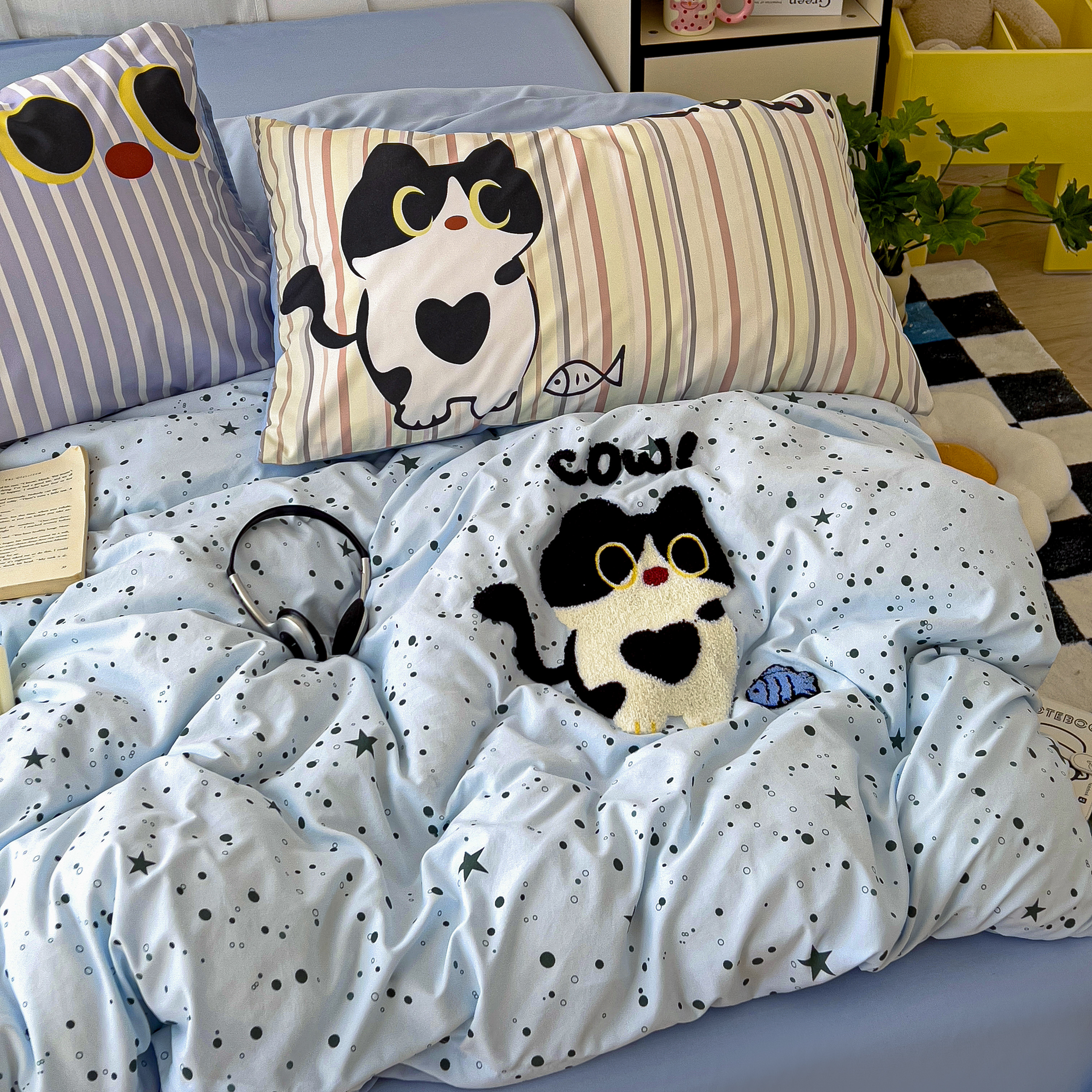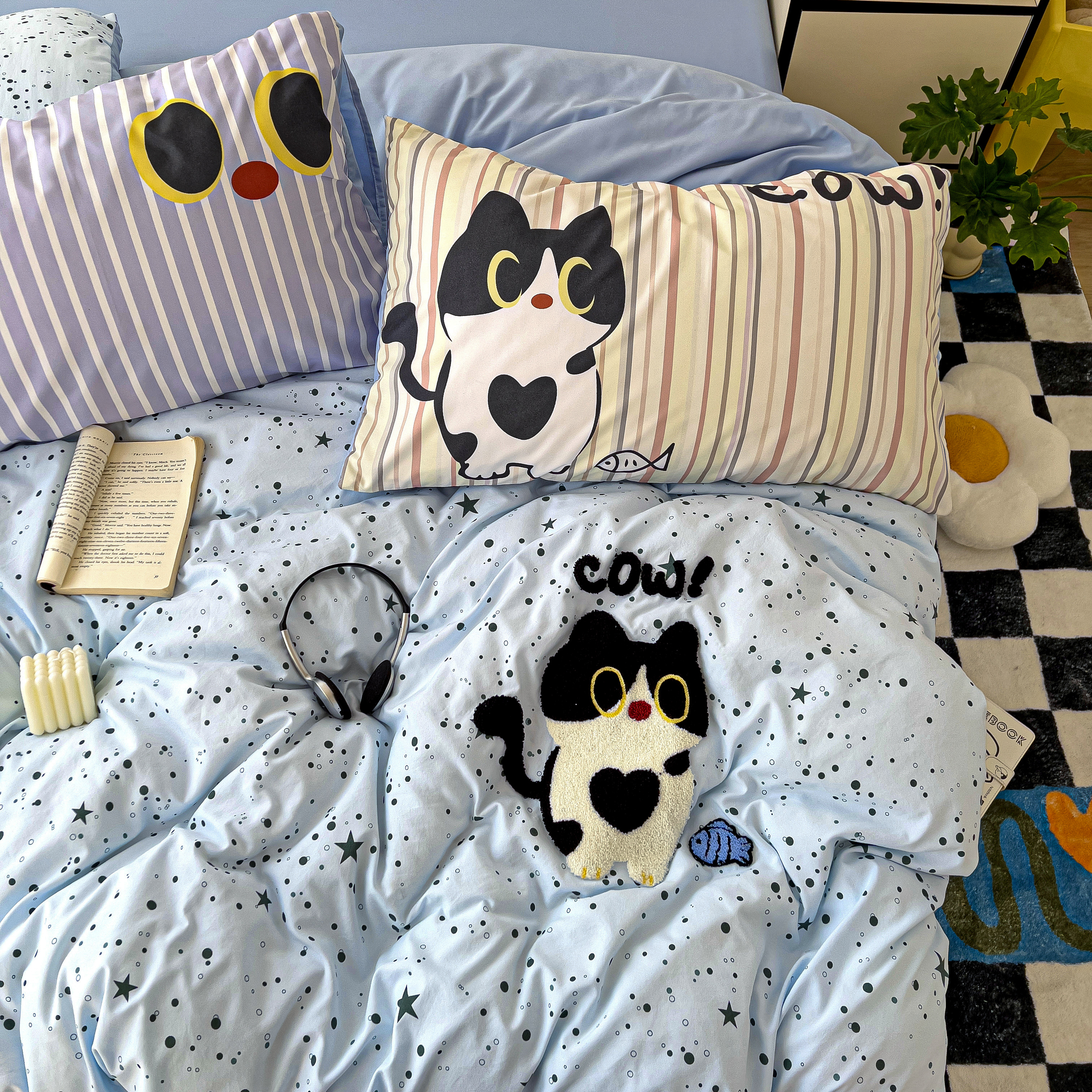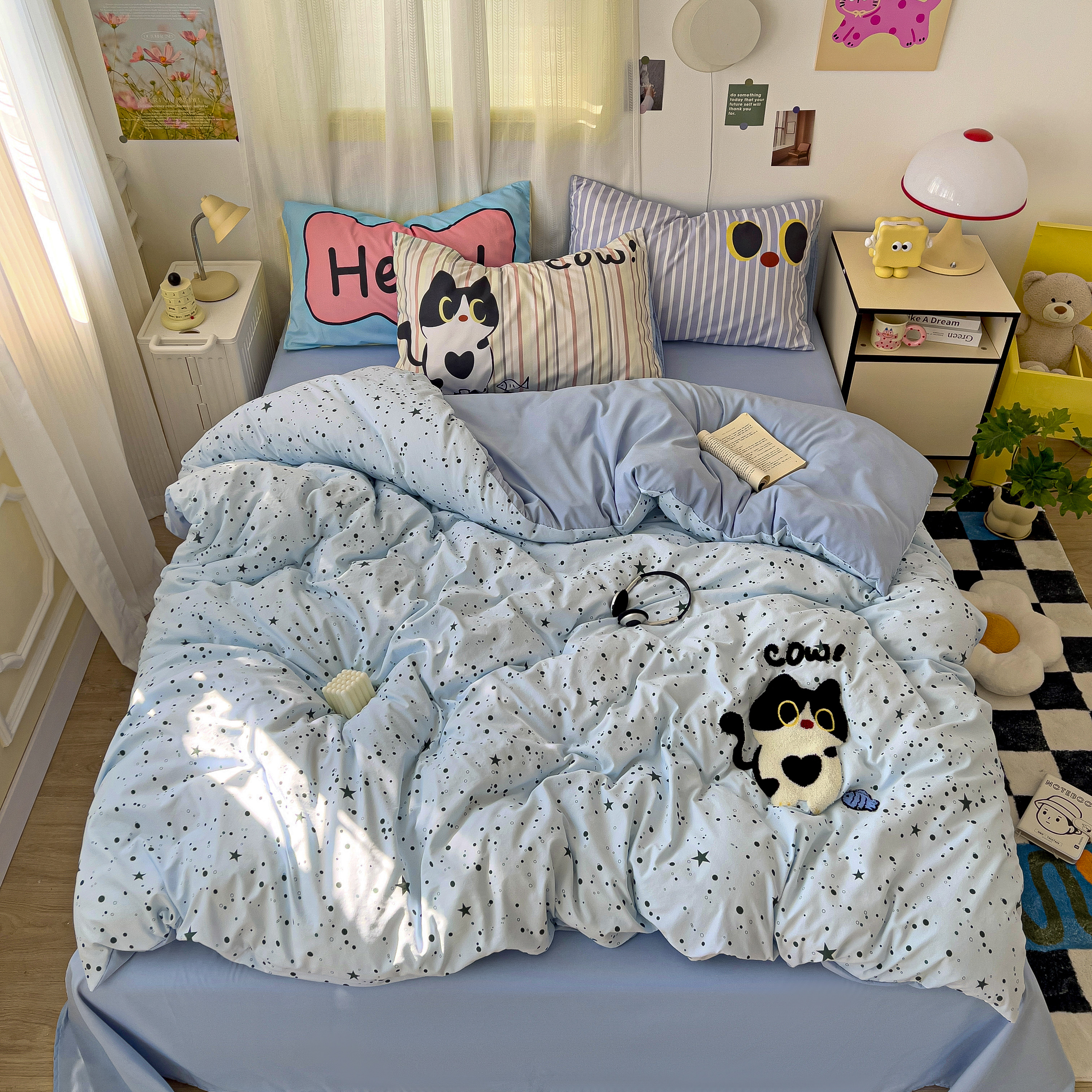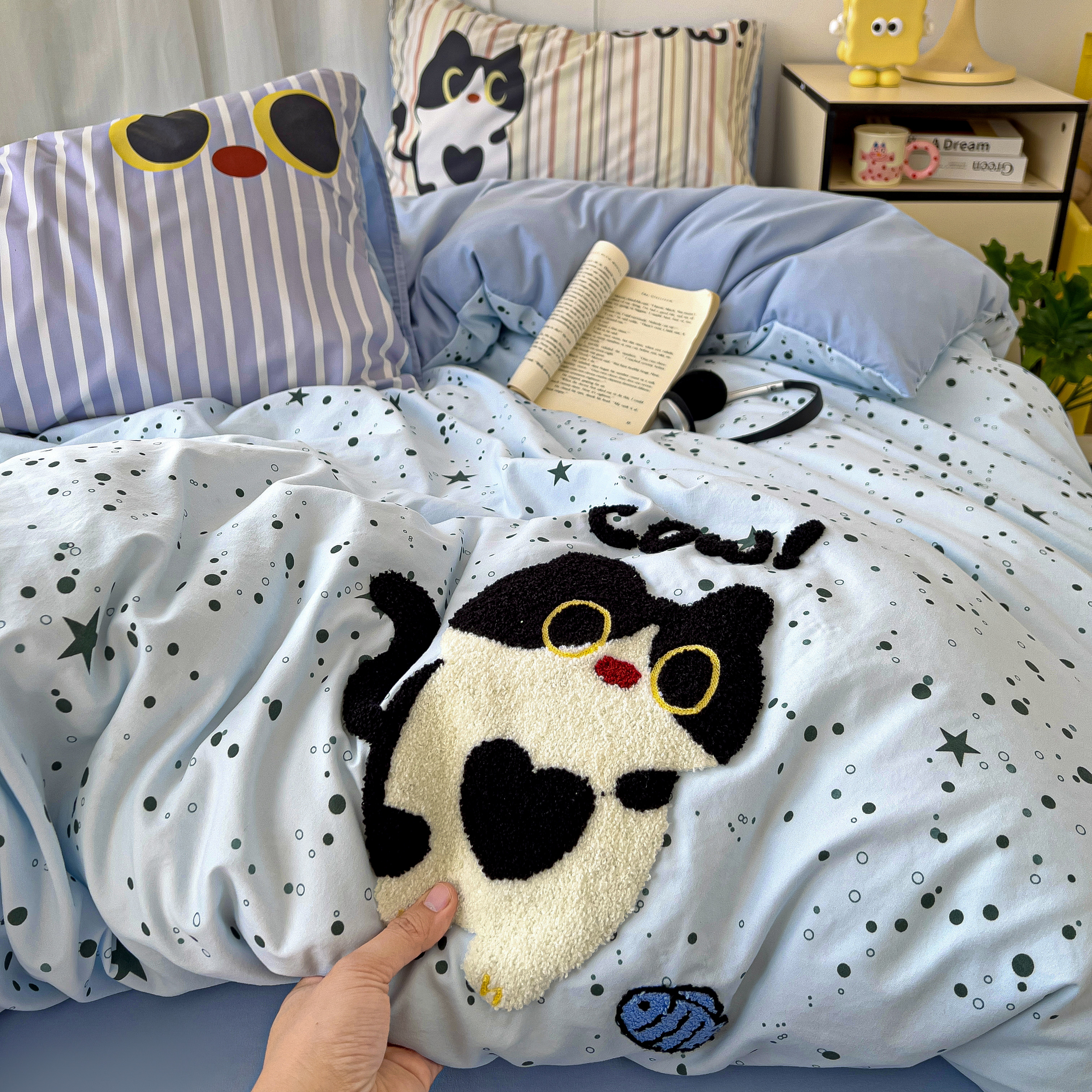一霖家纺 2025新款高克重云朵棉数码印花+毛巾绣四件套 黑色小猫