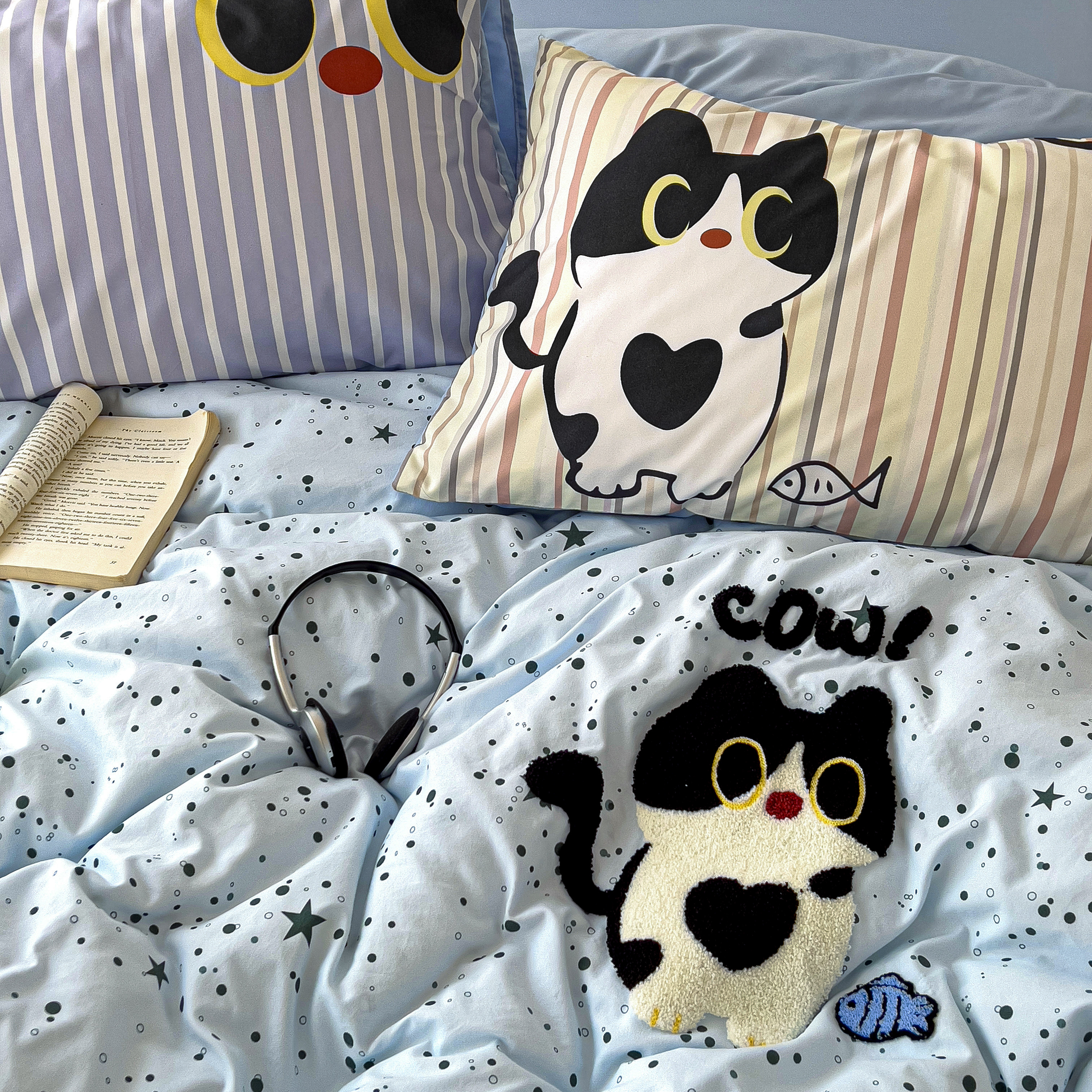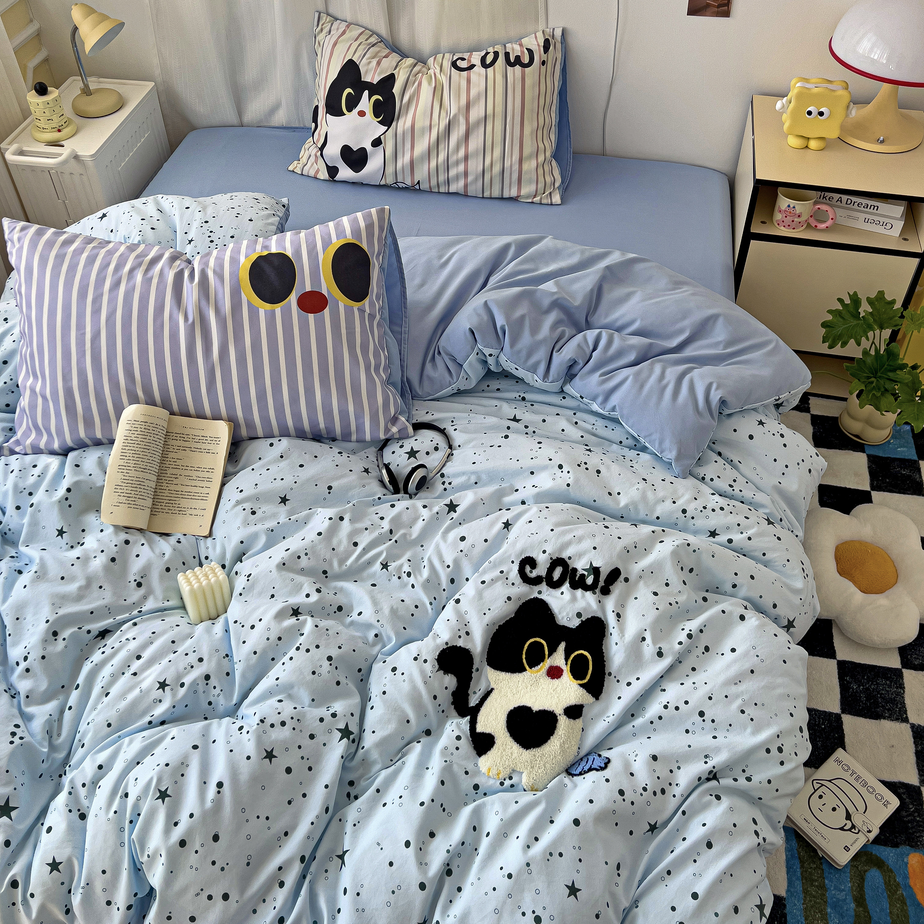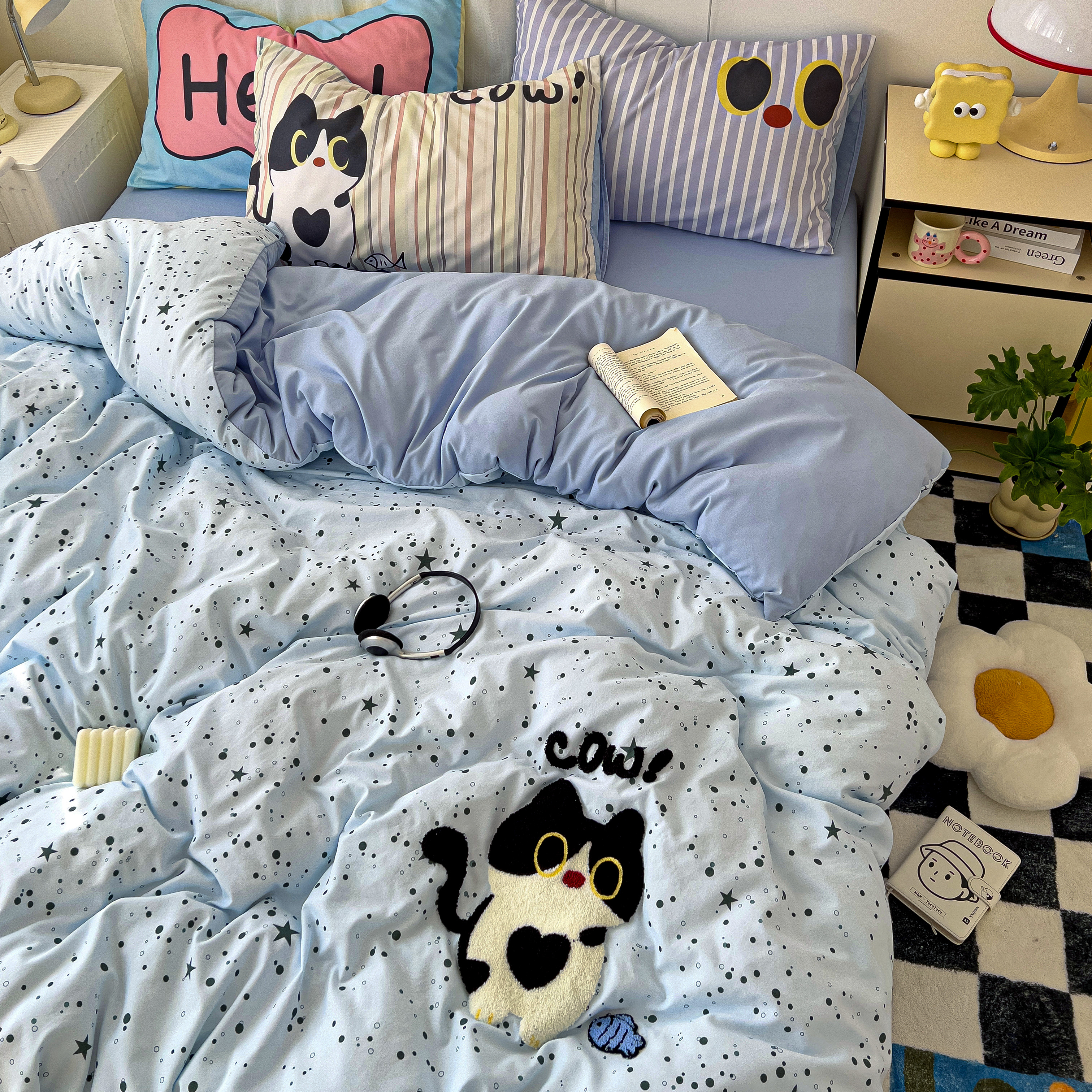 一霖家纺 2025新款高克重云朵棉数码印花+毛巾绣四件套 黑色小猫