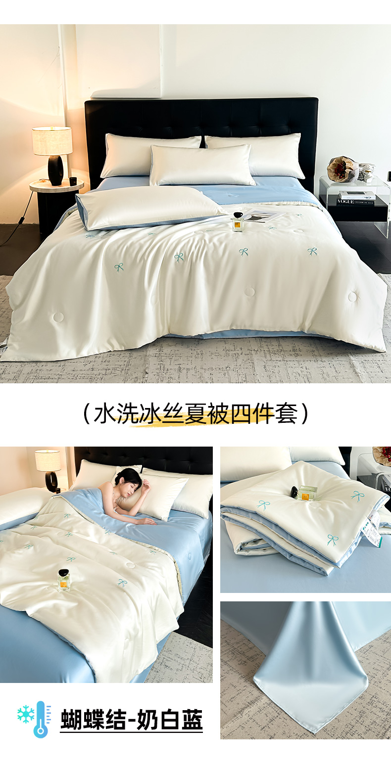 • 91家纺网 家纺一手货源 找家纺 绒世界 2025春夏水洗冰丝夏被四件套满绣系列 蝴蝶结-奶白蓝