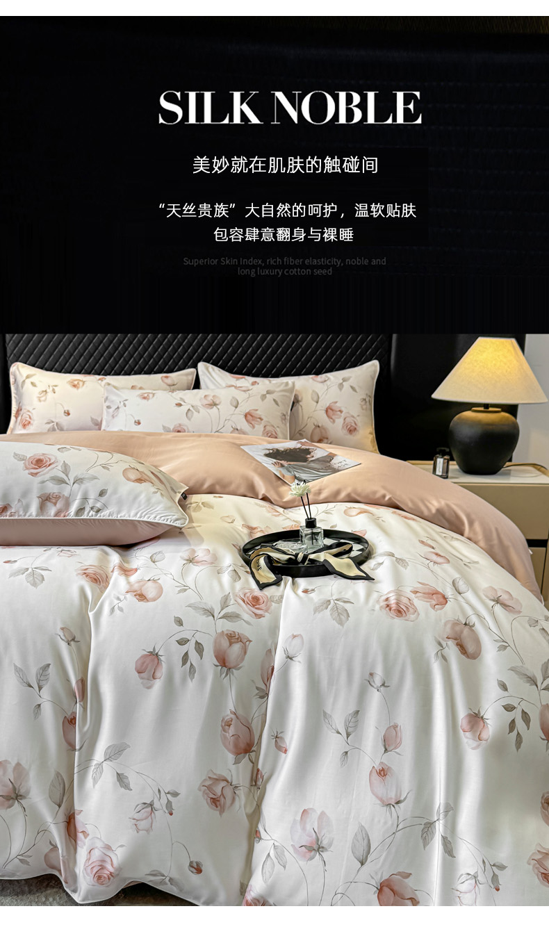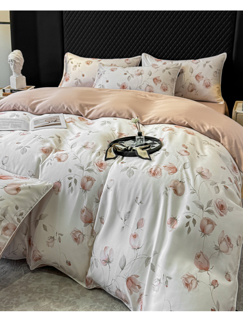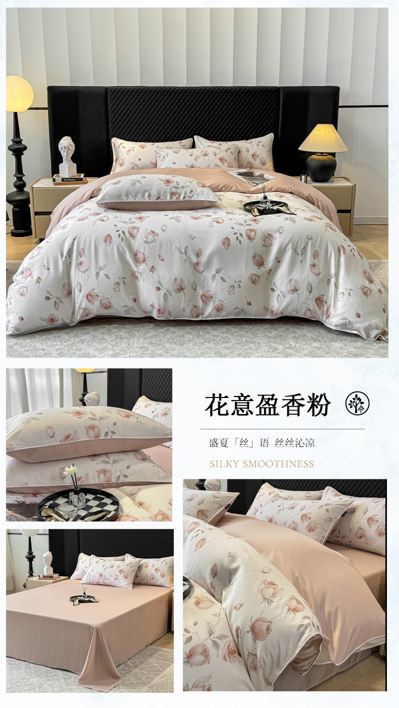 洺兰家居 2025春夏新款100支莱赛尔天丝贡缎数码印花麻绳款四件套高端礼盒 花意盈香粉