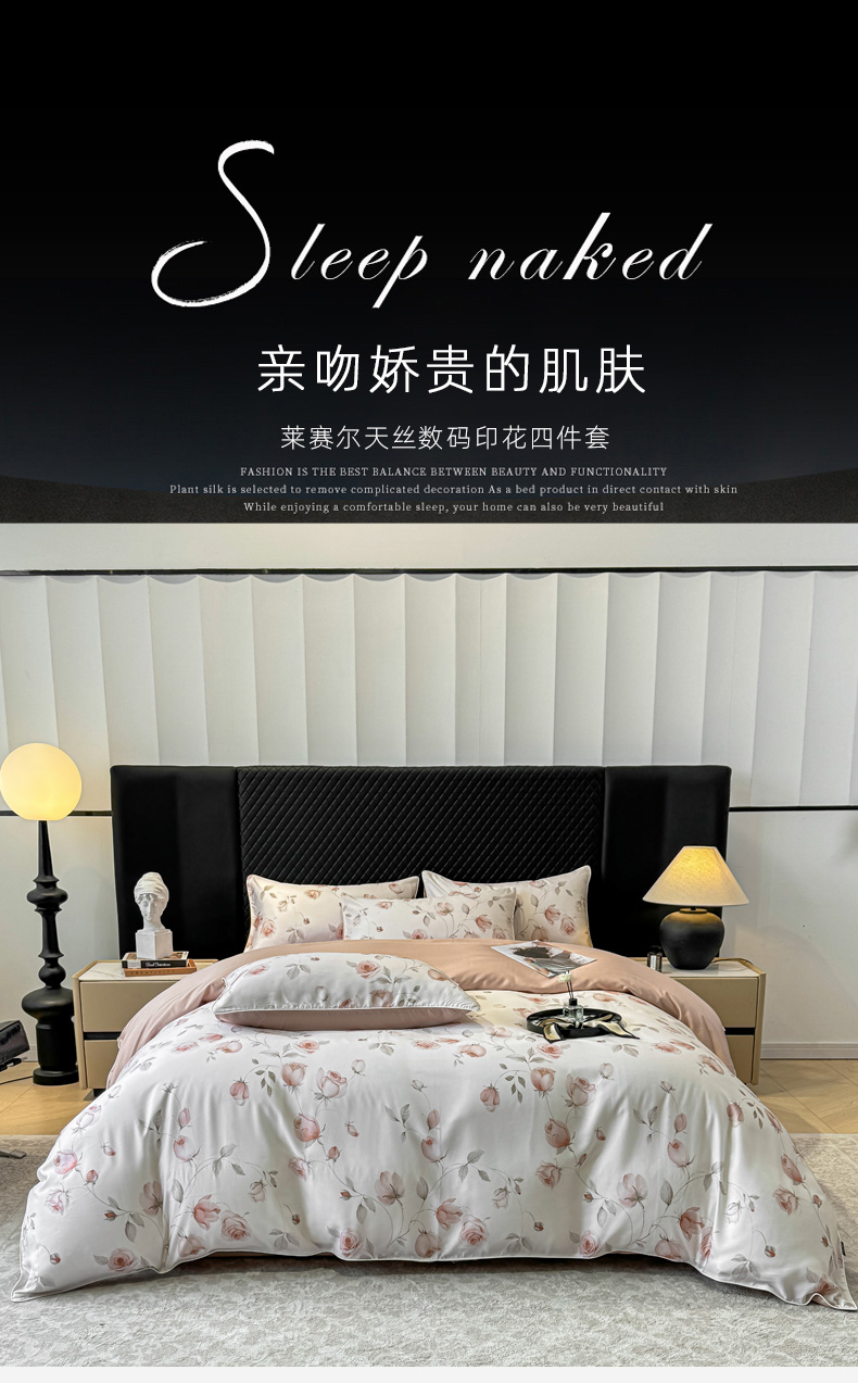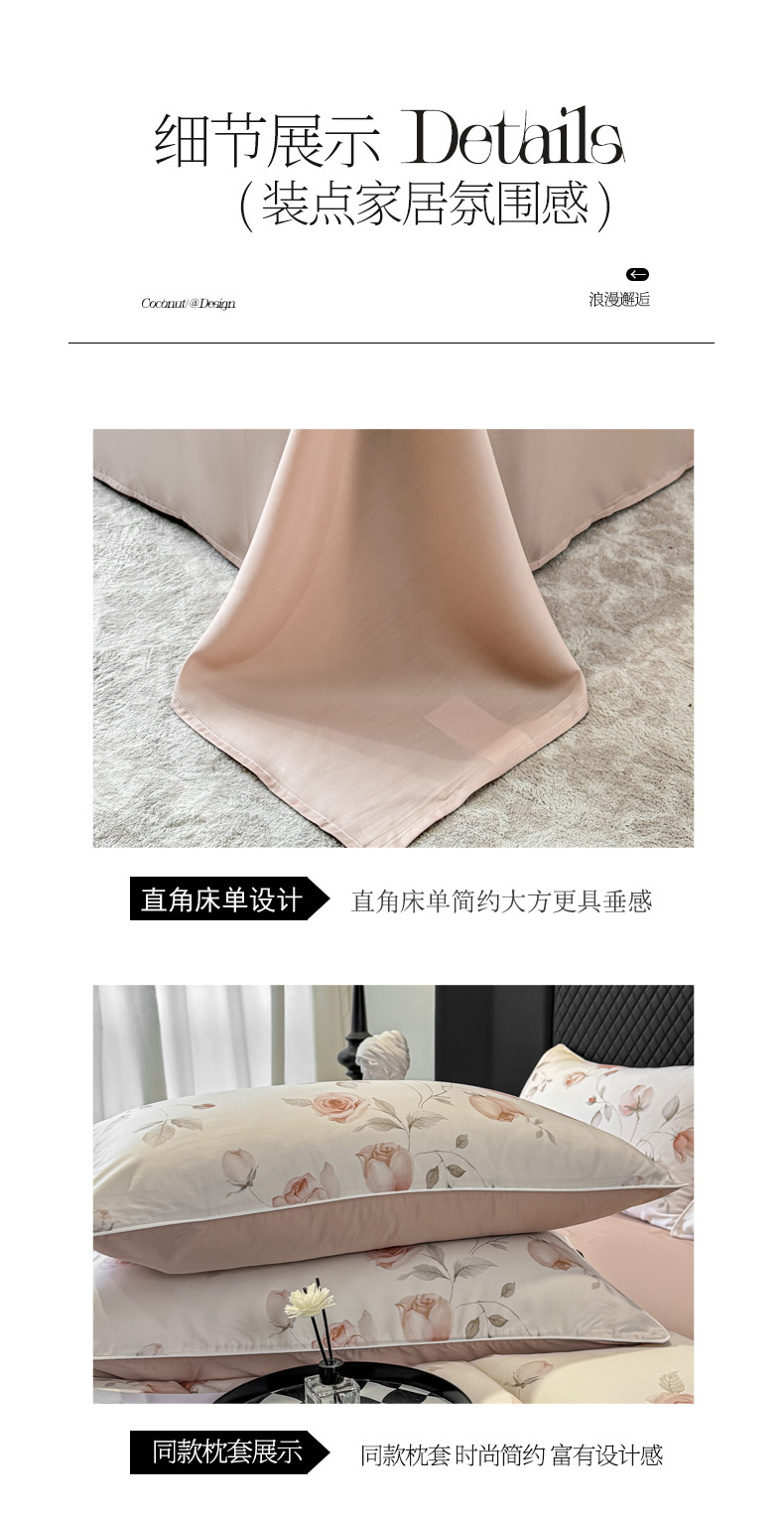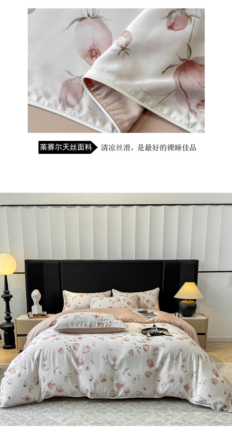 洺兰家居 2025春夏新款100支莱赛尔天丝贡缎数码印花麻绳款四件套高端礼盒 花意盈香粉