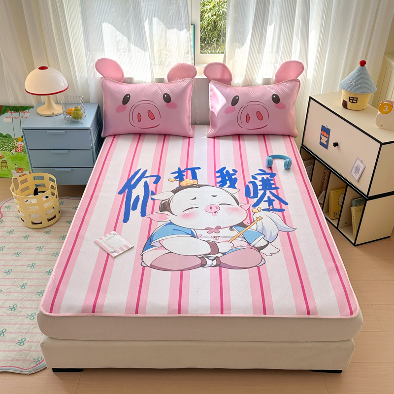 一霖家纺 2025新款大版300D冰藤席席子凉席三件套 草莓小猫