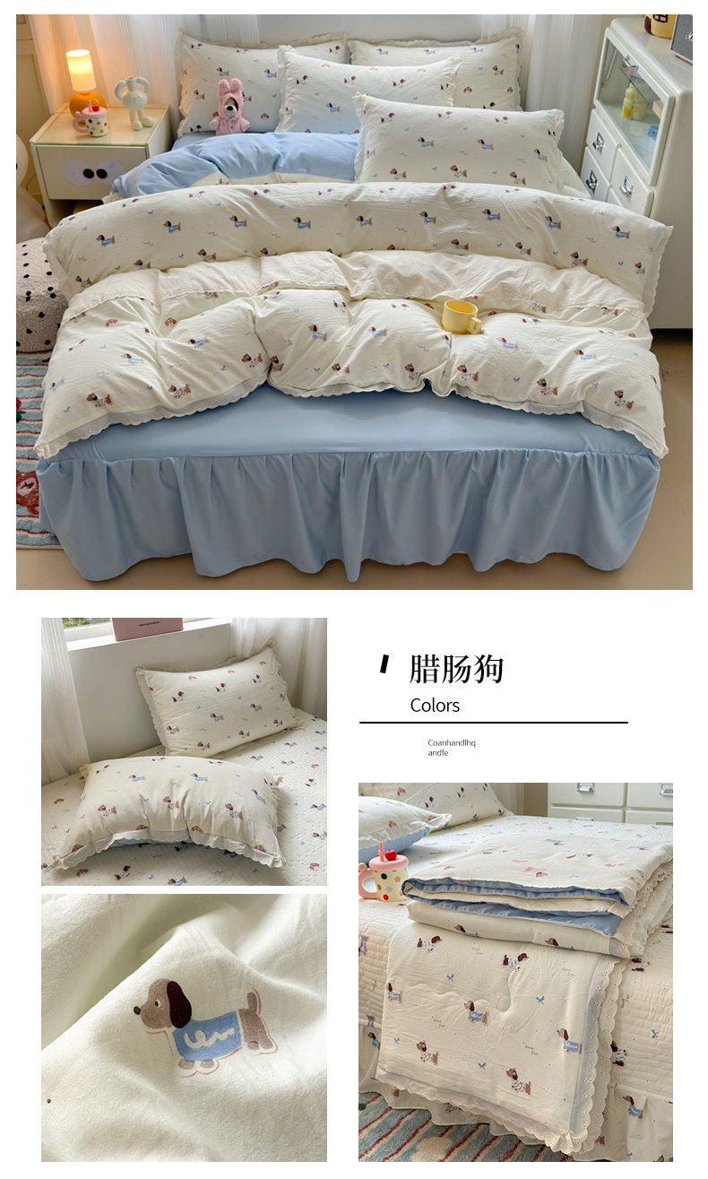 • 91家纺网 家纺一手货源 找家纺 2025新款小清新全棉花边水洗棉夏凉被四件套 腊肠狗