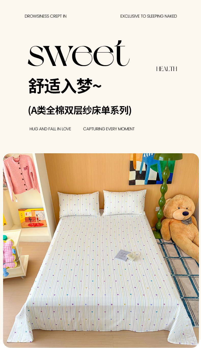 (总)感遇家纺2025新款全棉双层纱纤柔四件套,格子爱心蓝,花开半夏,滑板小狗,七彩虹,少女甜心,晚香玉,小美好,心心相印,樱桃,叠拍图仅供参考