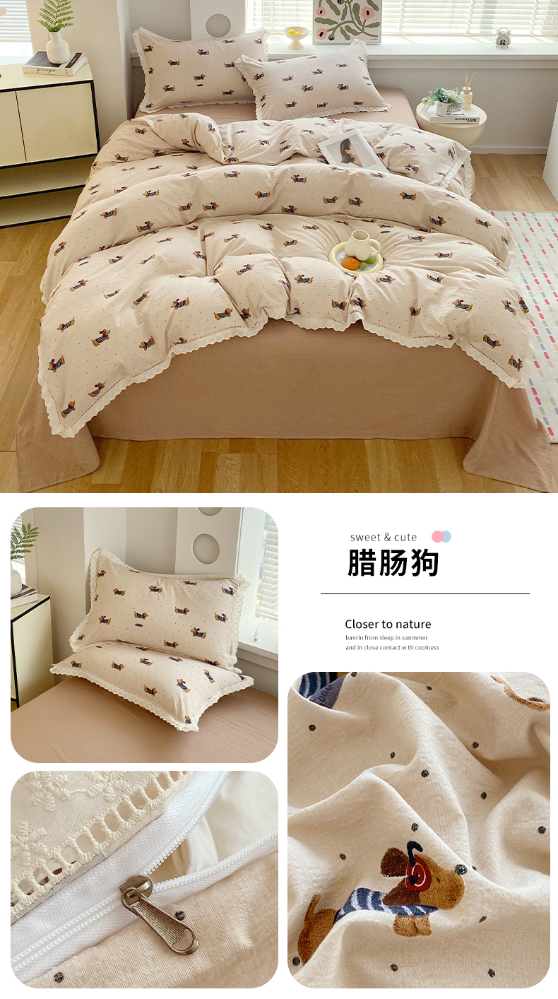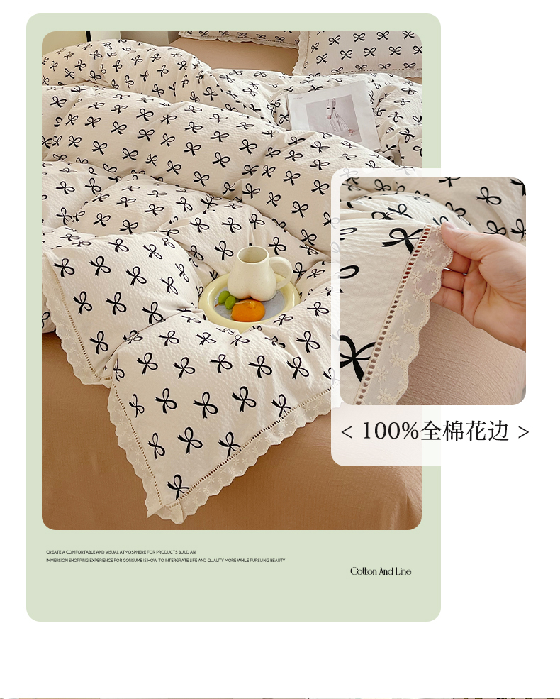 商品名称:雨彤家纺 2025新款A类高克重云感皱皱双层纱全棉镂空花边款法式四件套-叠拍图 相伴-米