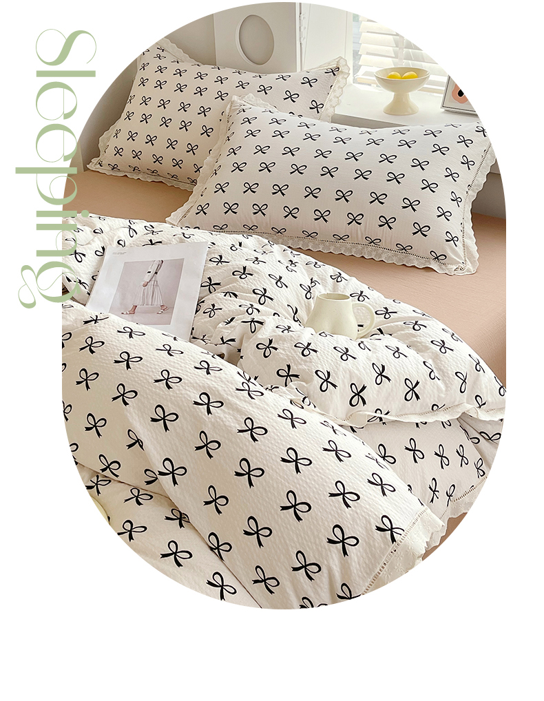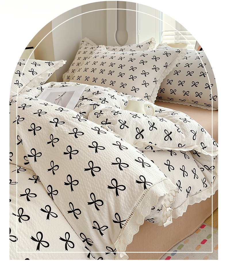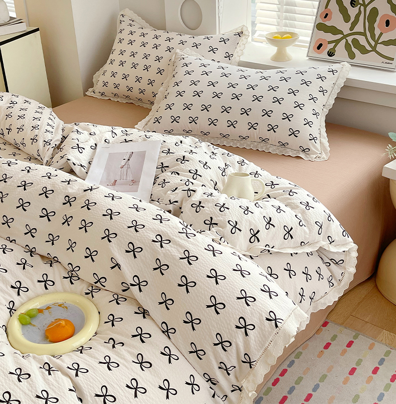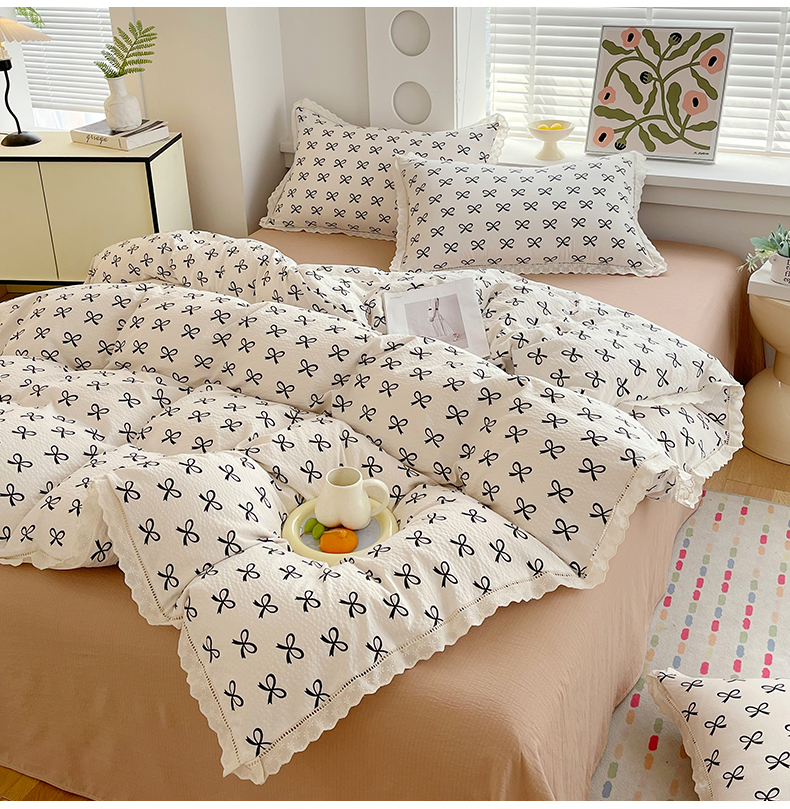 雨彤家纺 2025新款A类高克重云感皱皱双层纱全棉镂空花边款法式四件套-叠拍图 相伴-米