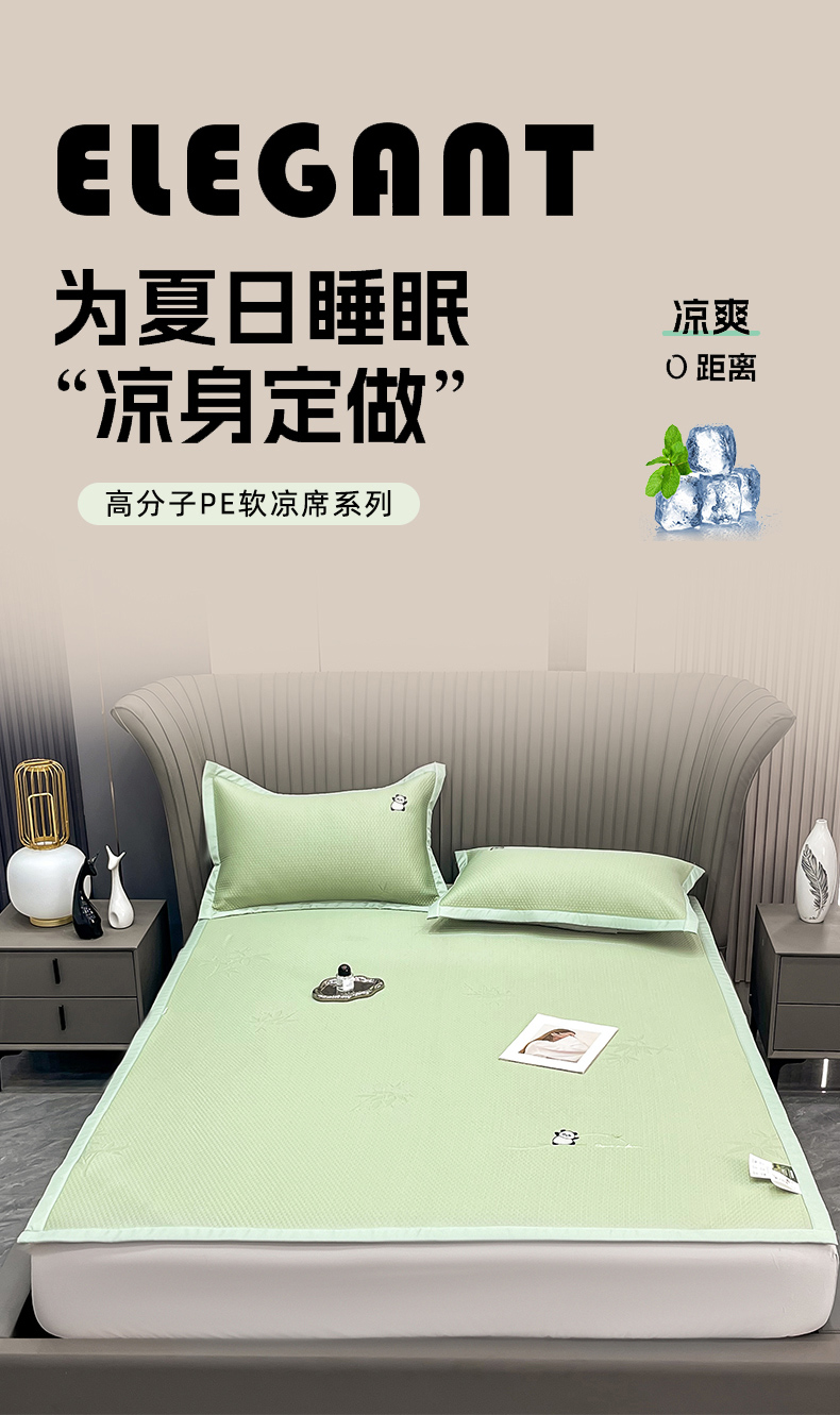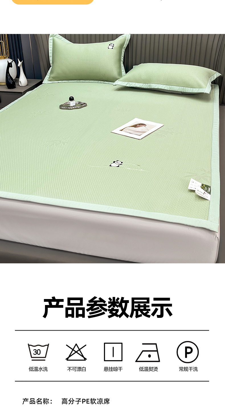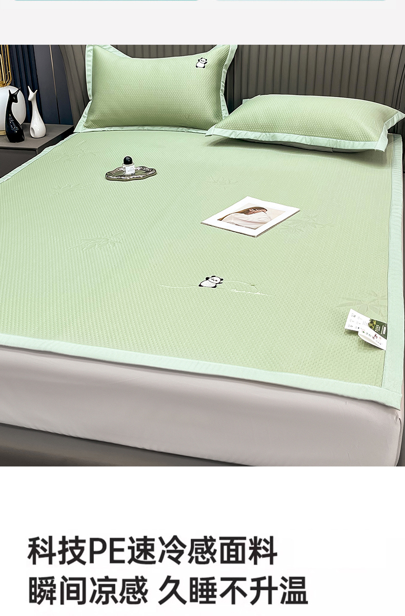 • 91家纺网 家纺一手货源 找家纺 瑞兴纺 2025新款高分子PE软凉席绣花款床单款 绣花床单款-竹林熊猫-绿