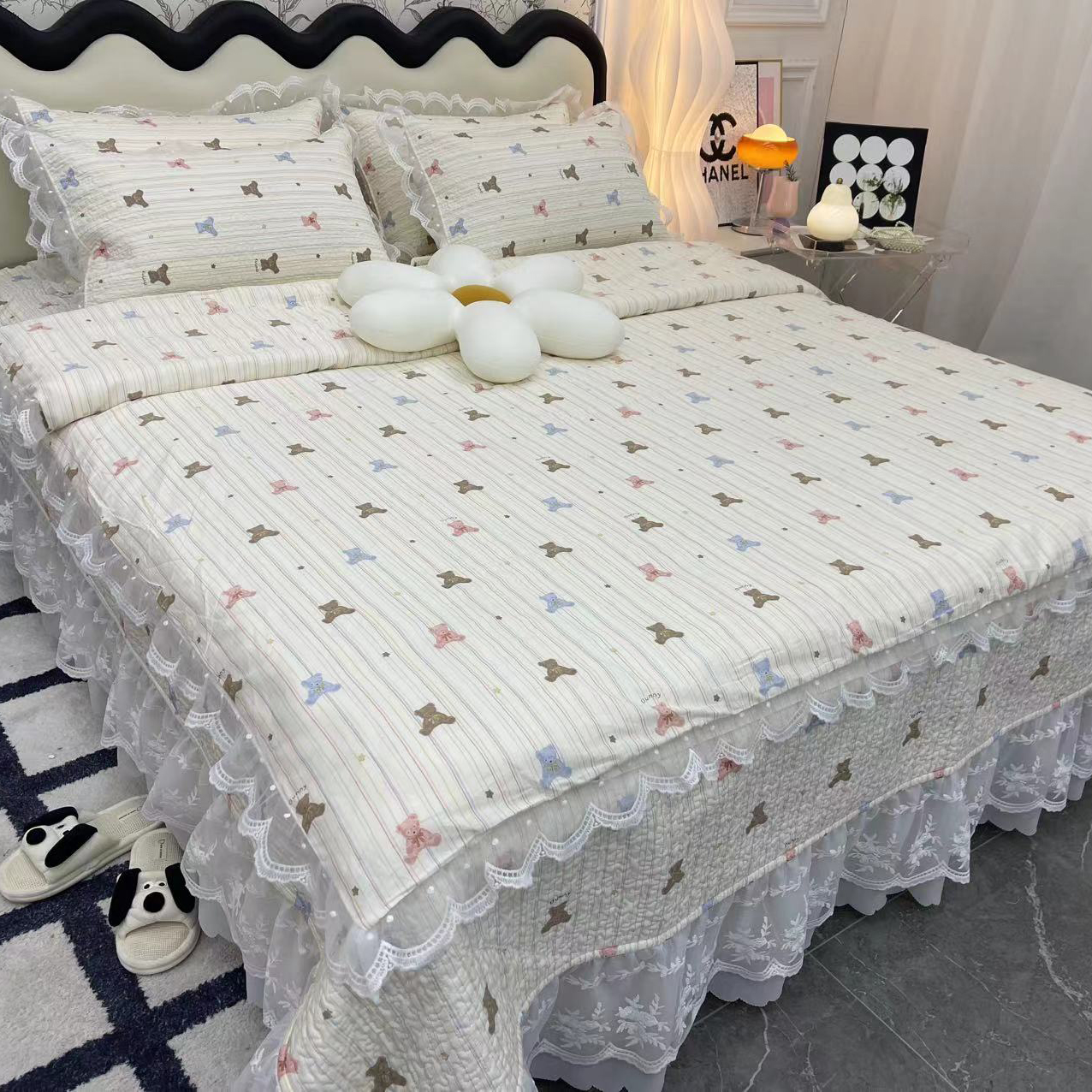 禧瑞谷 2025新款双层花边纯棉床盖雪纺蕾丝款纯棉床盖四件套 彩条熊,彩条熊