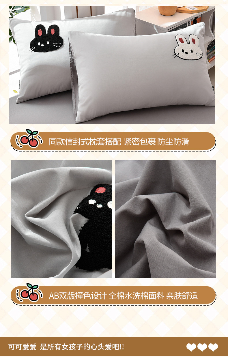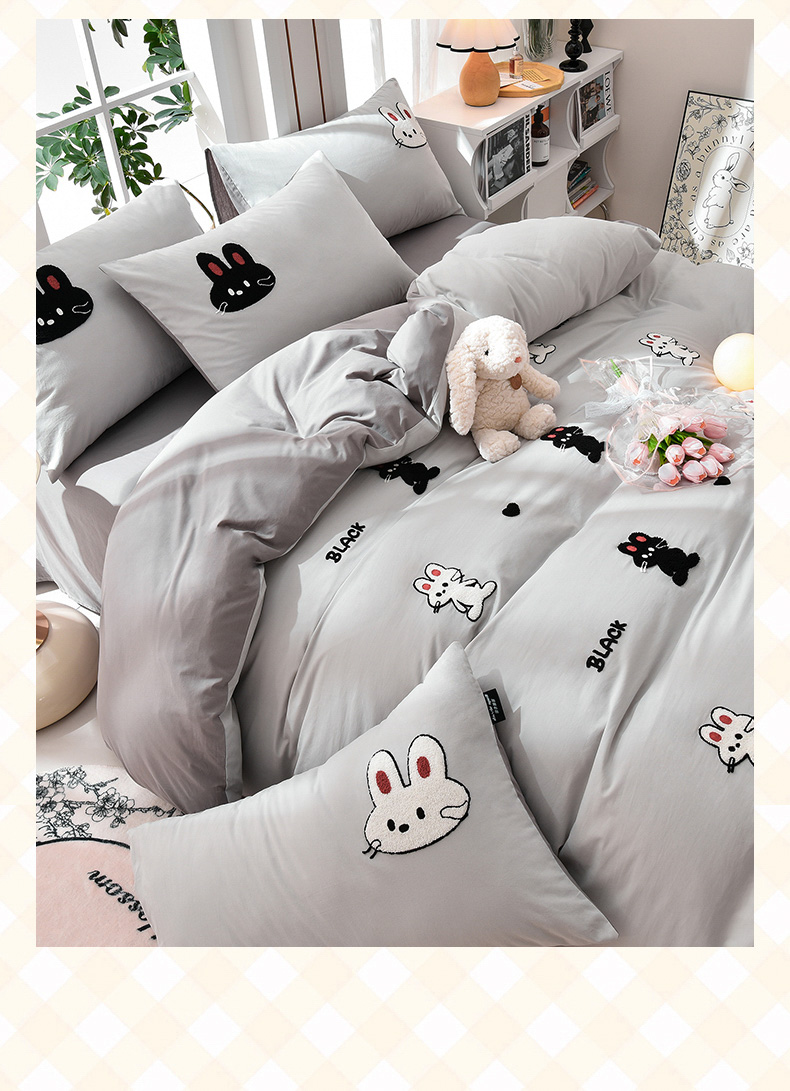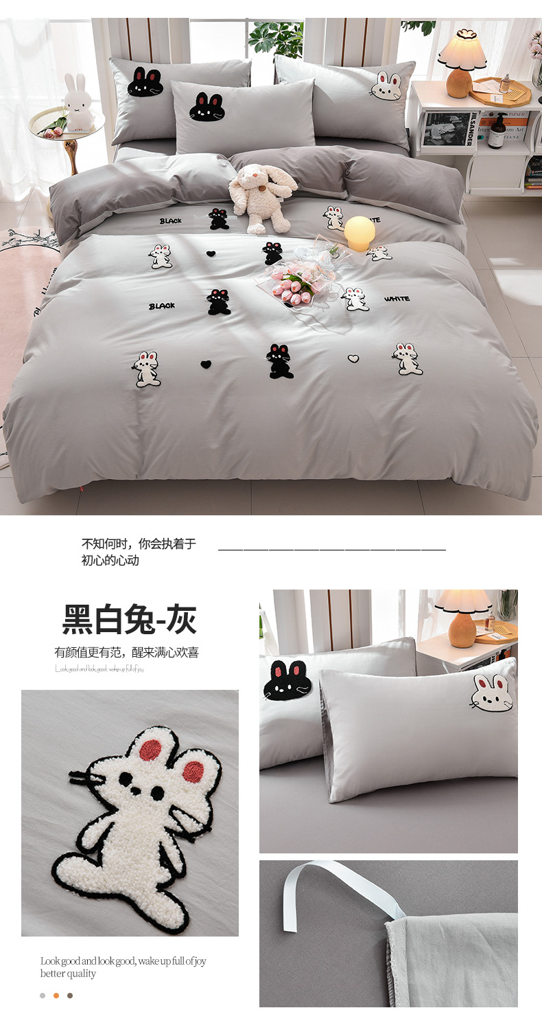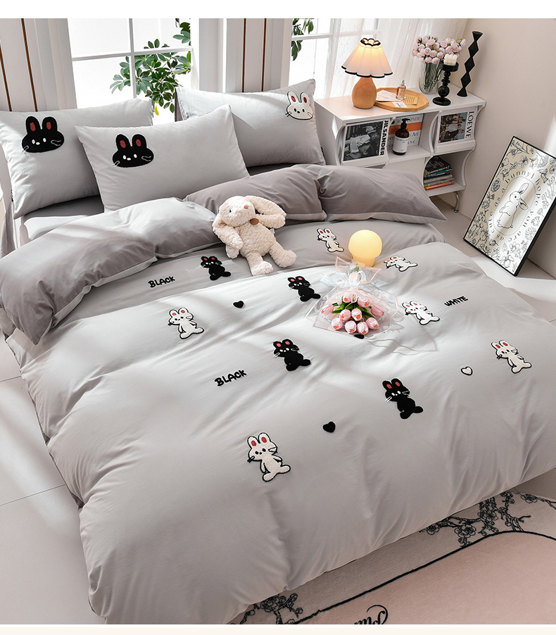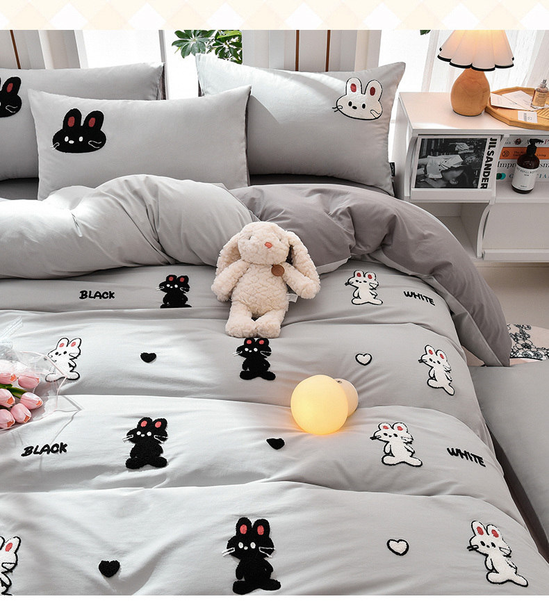 当前位置: 91家纺网 > 商品网购 > 床品套件 > 四件套 > 水洗棉四件套 > 炫拼家纺 2026新春款萌系A类全棉纯棉40支水洗棉毛巾绣四件套 黑白兔-灰