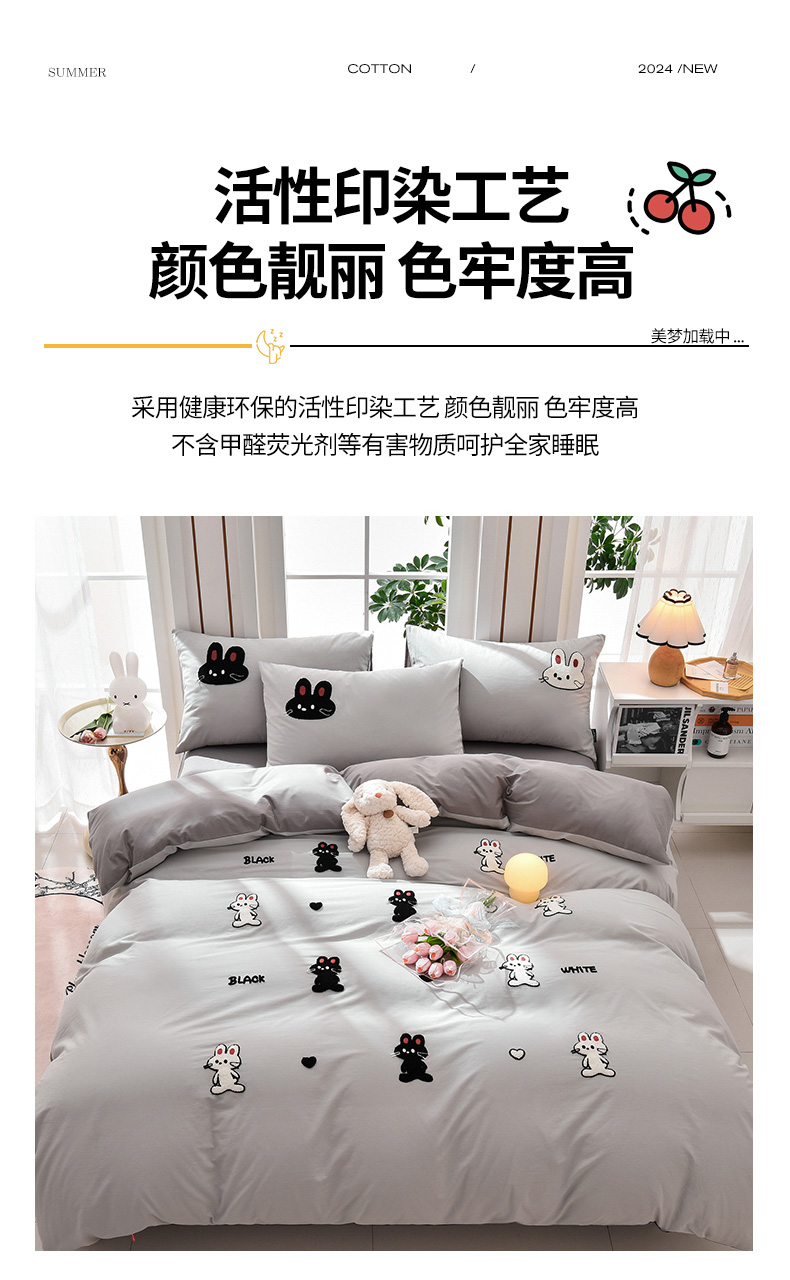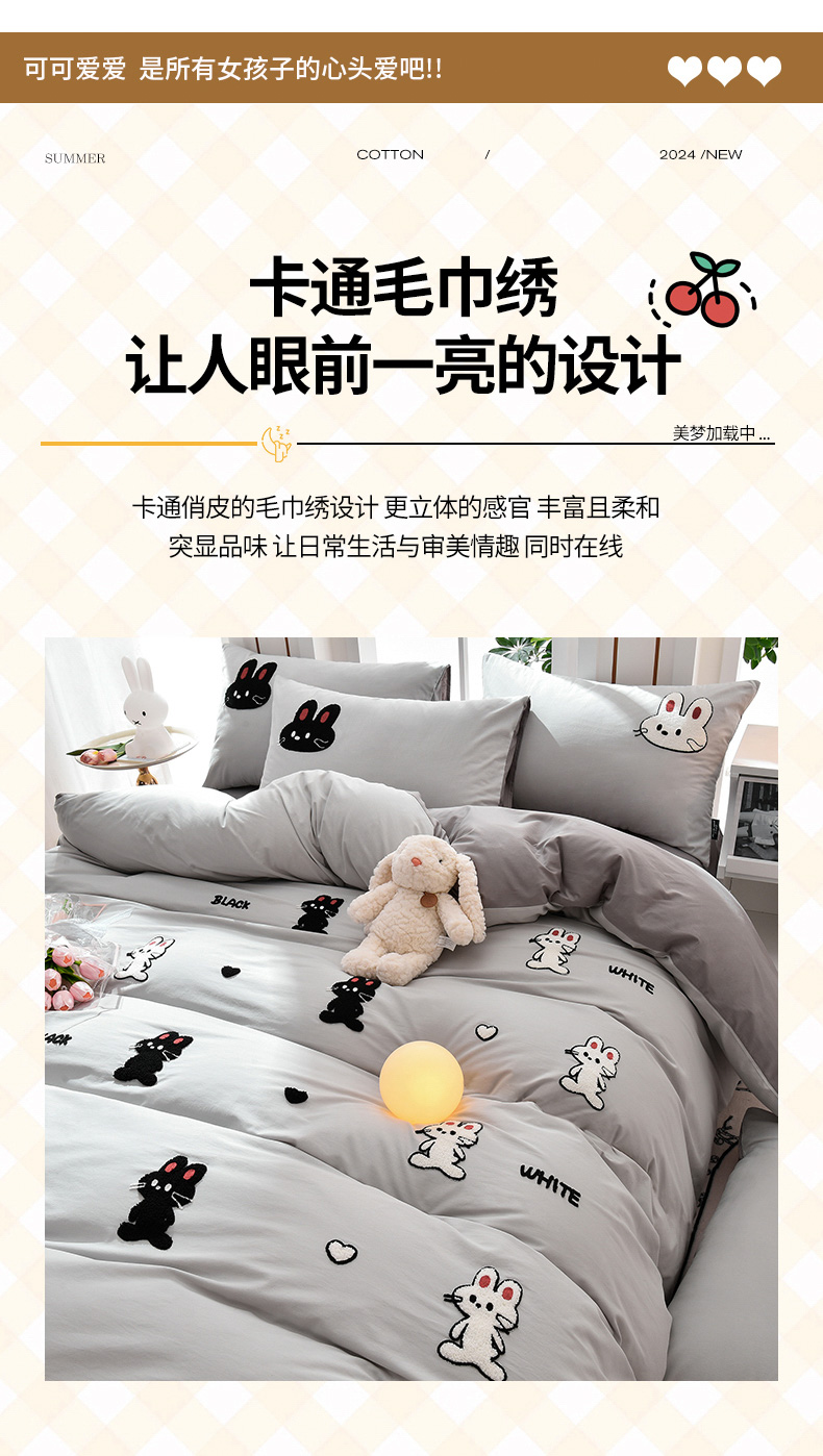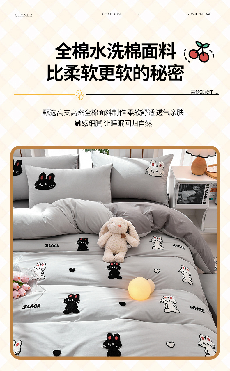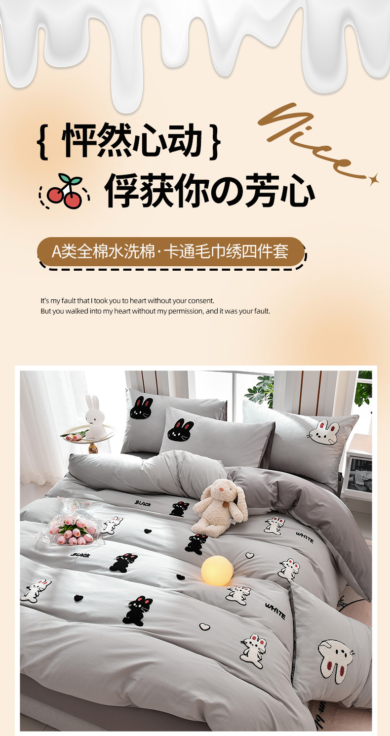 当前位置: 91家纺网 > 商品网购 > 床品套件 > 四件套 > 水洗棉四件套 > 炫拼家纺 2026新春款萌系A类全棉纯棉40支水洗棉毛巾绣四件套 黑白兔-灰