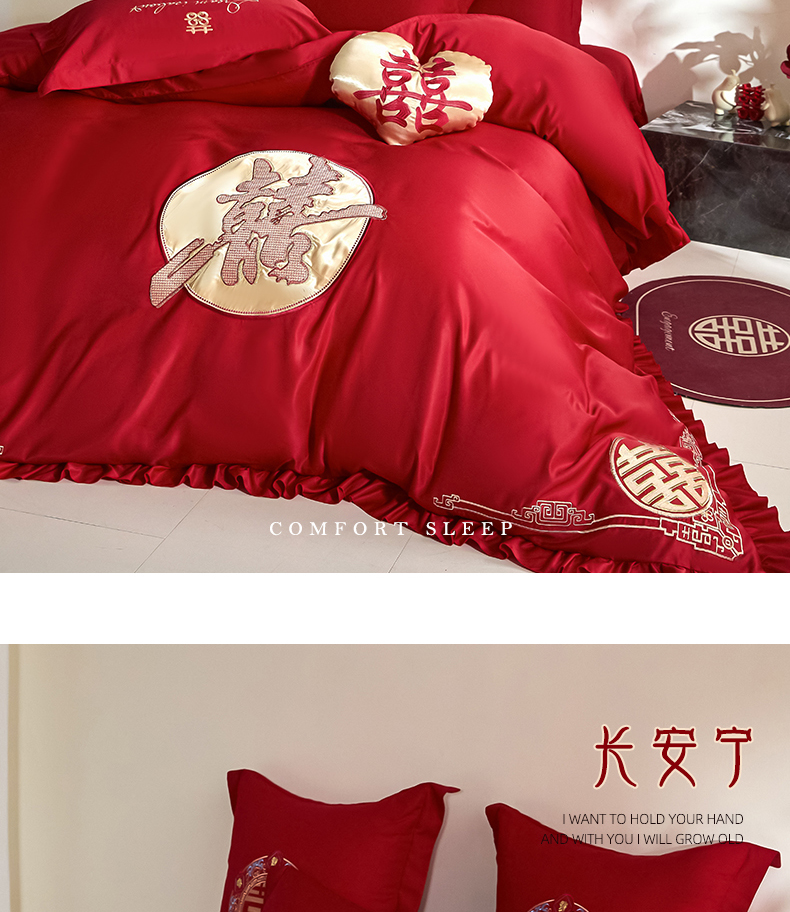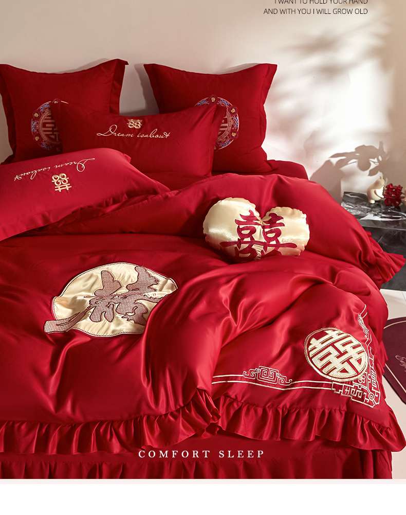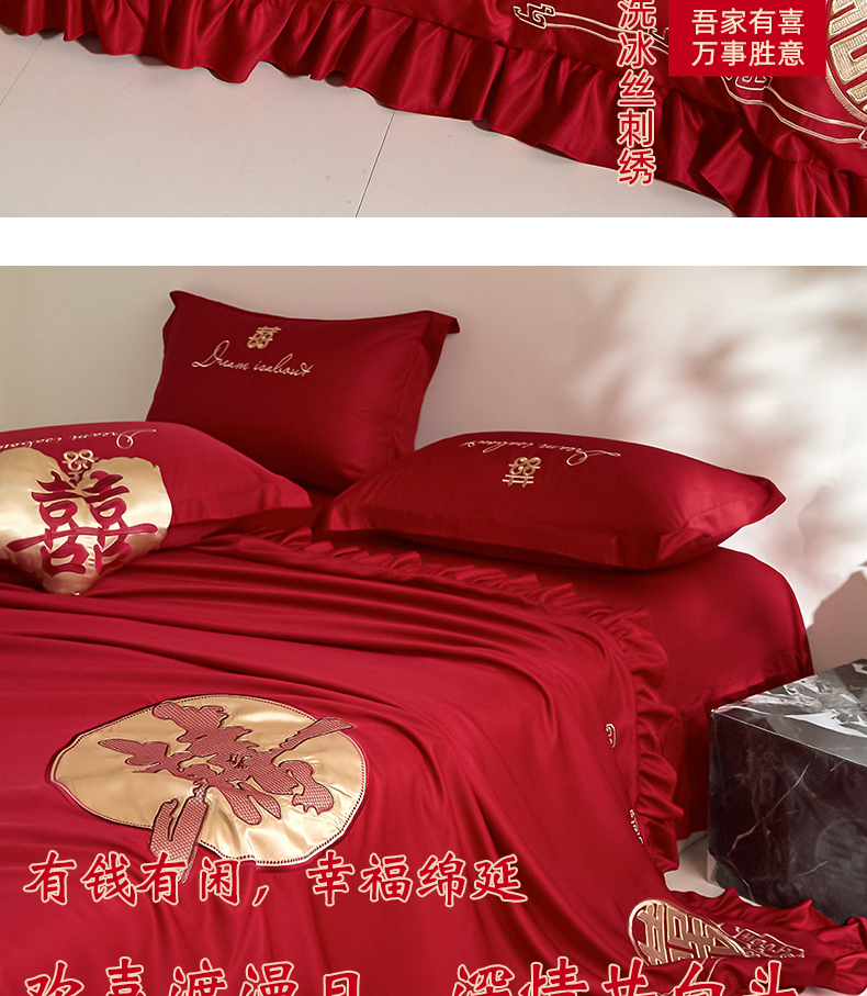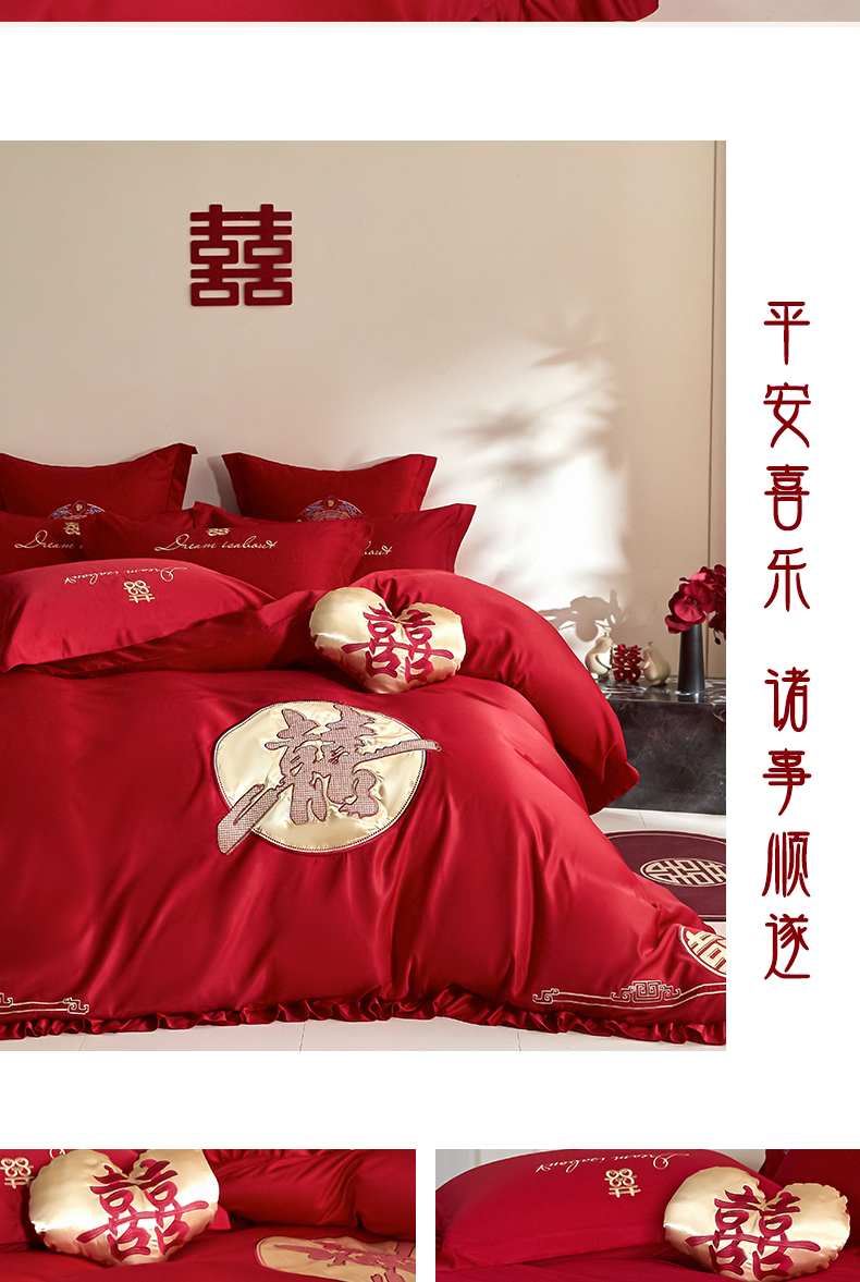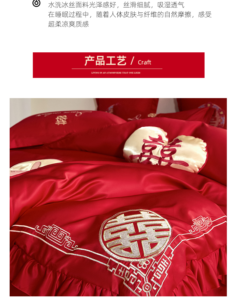 当前位置: 91家纺网 > 商品网购 > 床品套件 > 四件套 > 婚庆四件套 > 玉雅家纺 2025新款水洗冰丝刺绣床裙款婚庆四件套 床裙款-喜临门