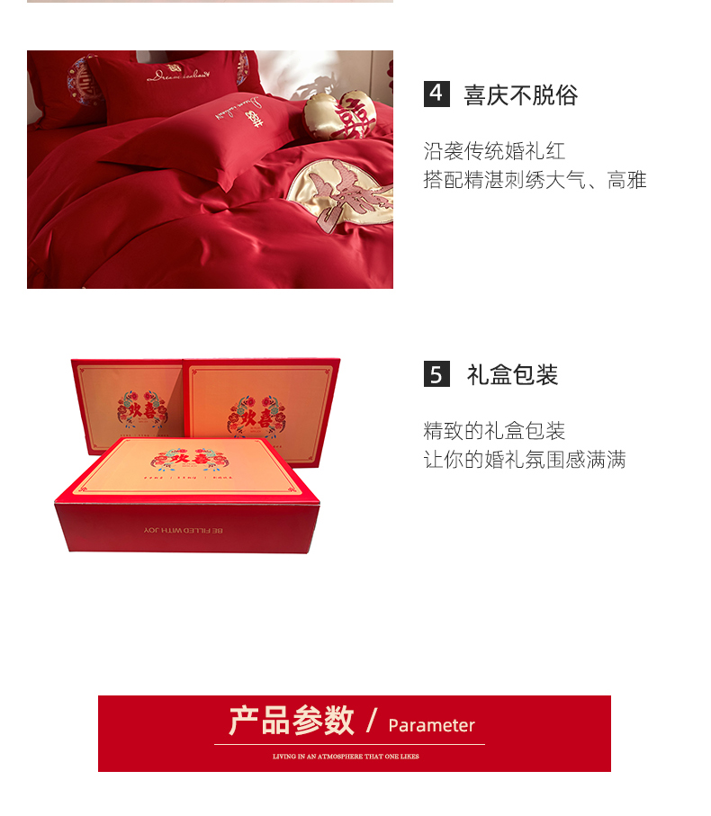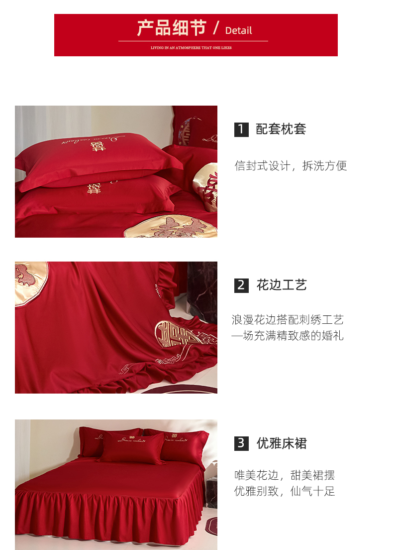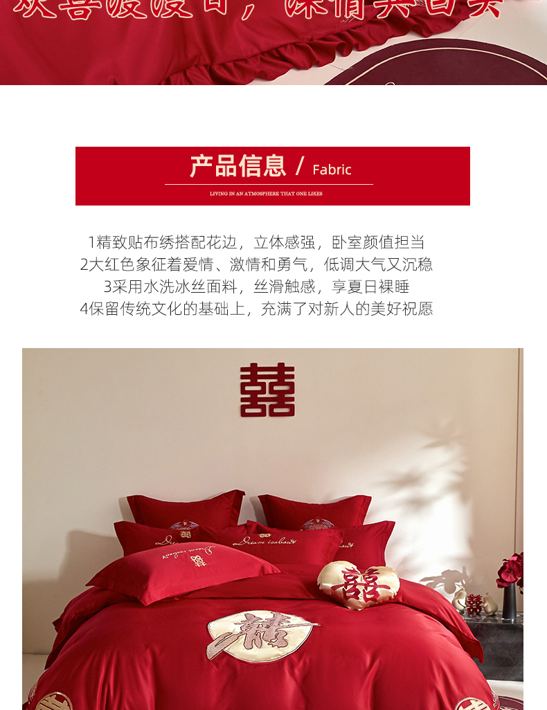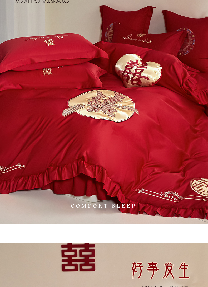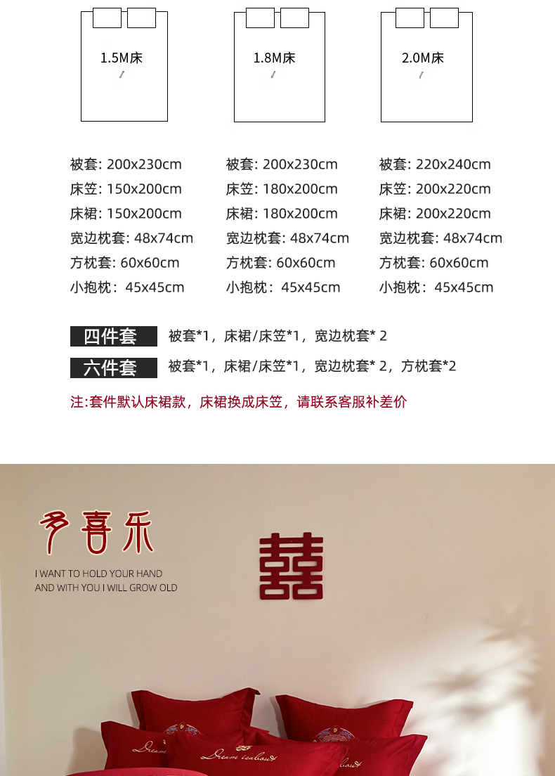 当前位置: 91家纺网 > 商品网购 > 床品套件 > 四件套 > 婚庆四件套 > 玉雅家纺 2025新款水洗冰丝刺绣床裙款婚庆四件套 床裙款-喜临门