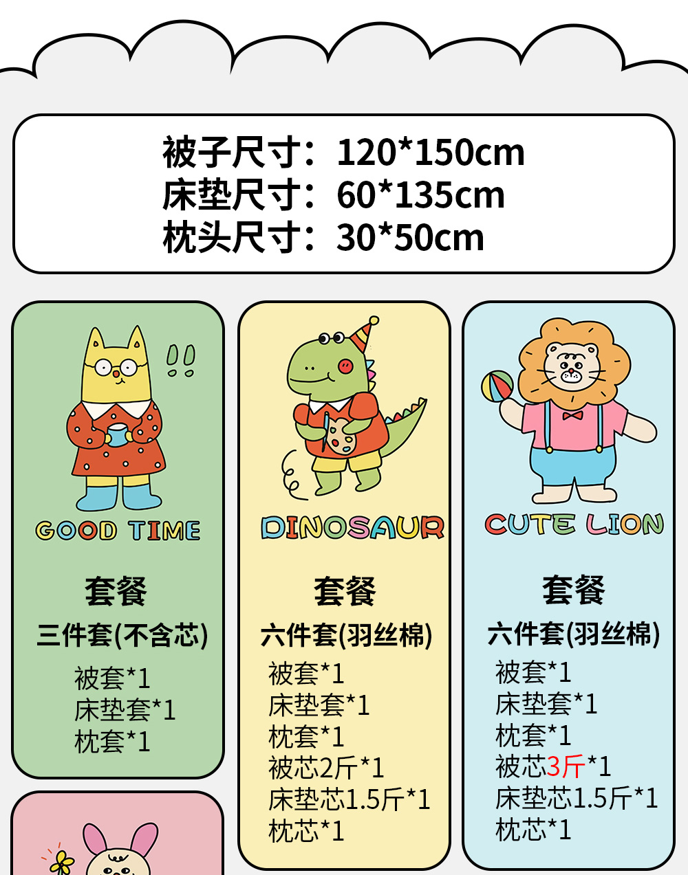 被套120x150cm+垫套60x135cm+枕套30x50cm-不含芯 | ¥110.00 |