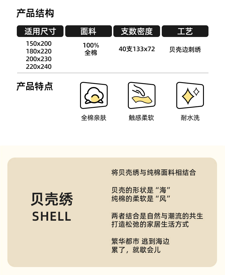 商品名称:浮光家居 2025新款全棉贝壳边系列单被套 甜卡日常