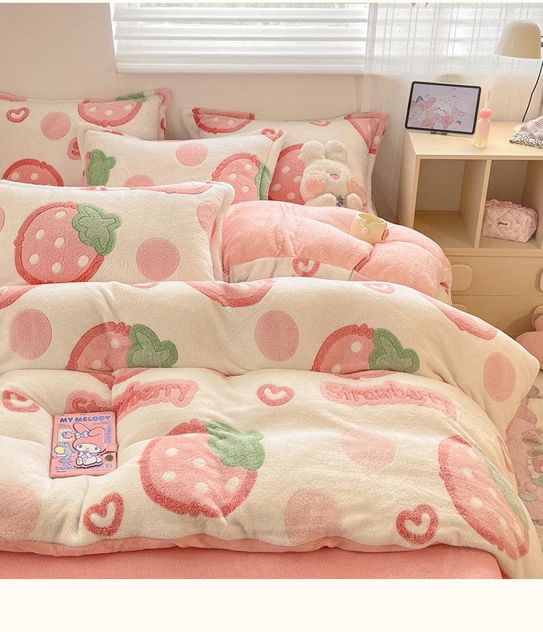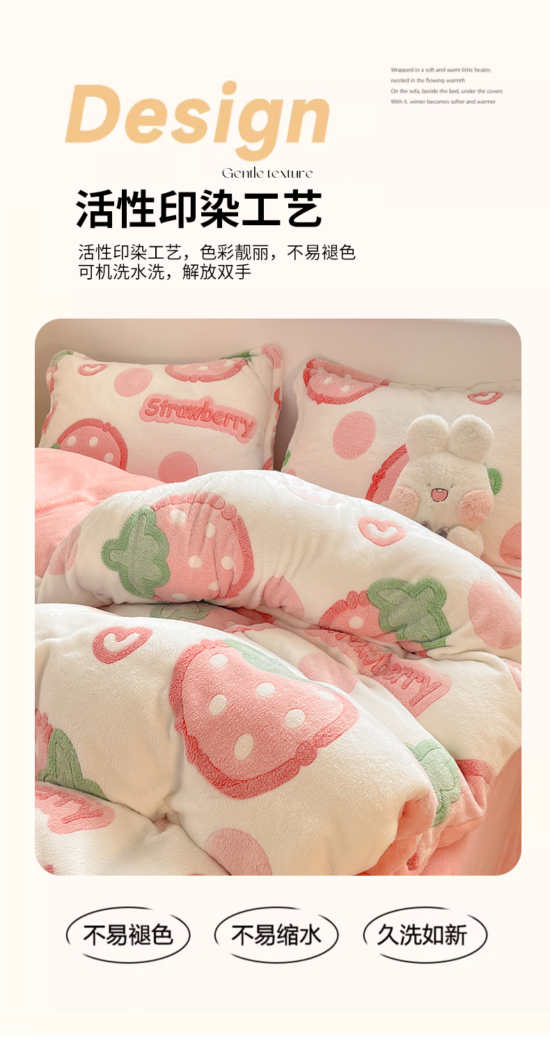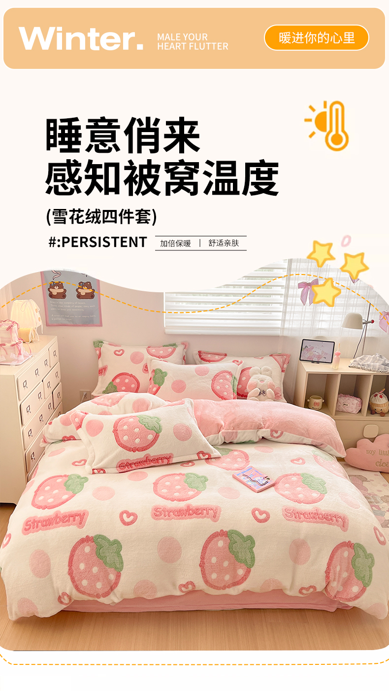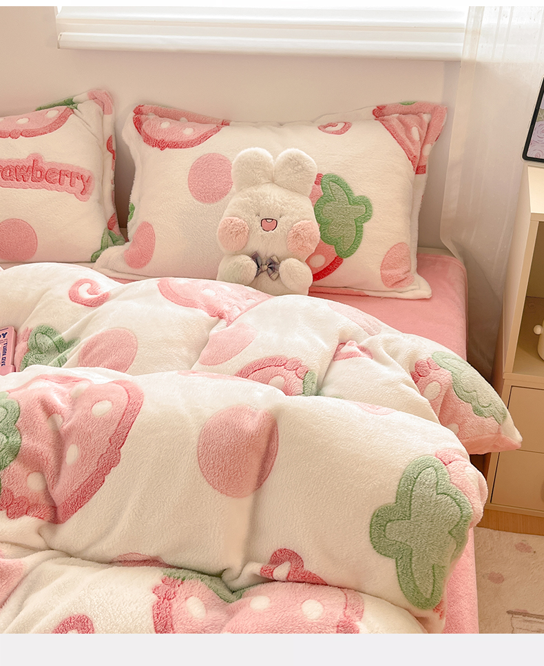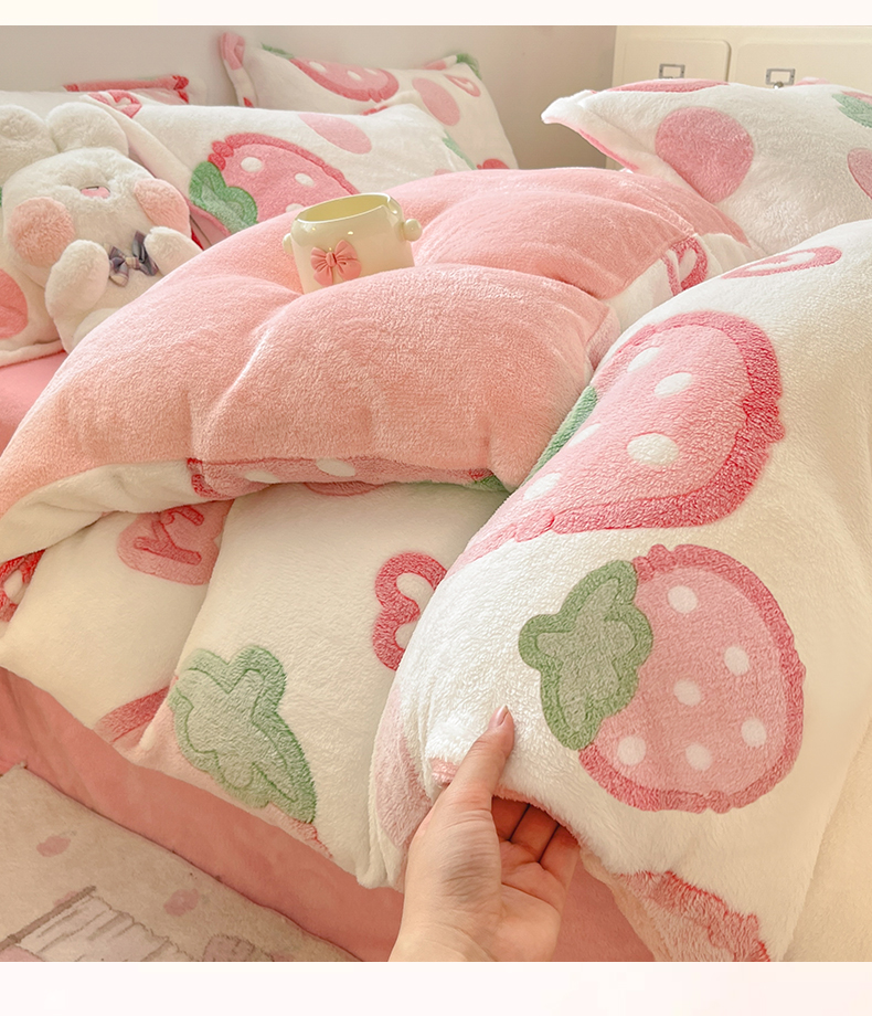 当前位置: 91家纺网 > 商品网购 > 床品套件 > 四件套 > 其它四件套 > 川悦生活 2025新款立体雪花绒印花大床四件套系列二场景一 啵啵草莓