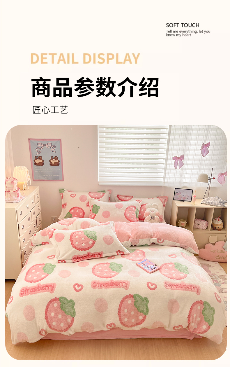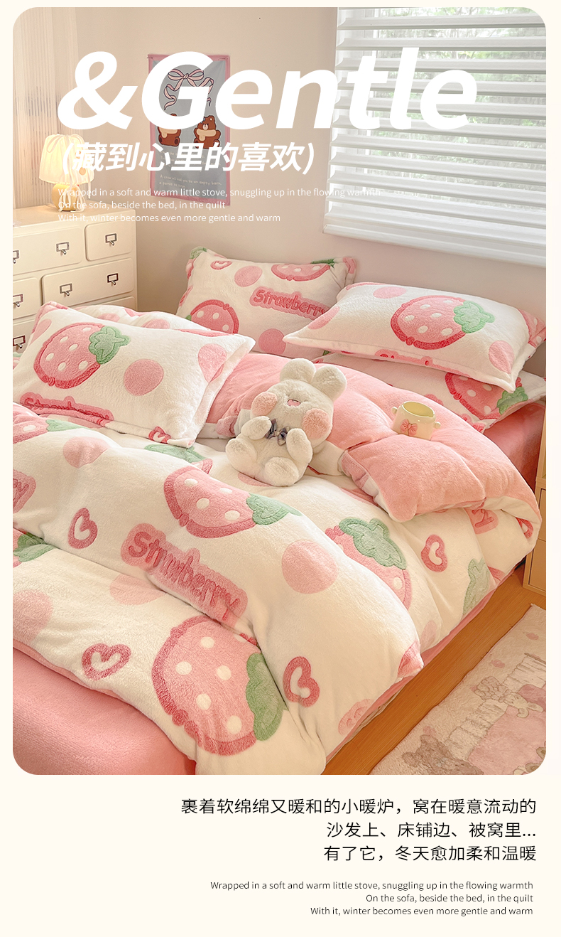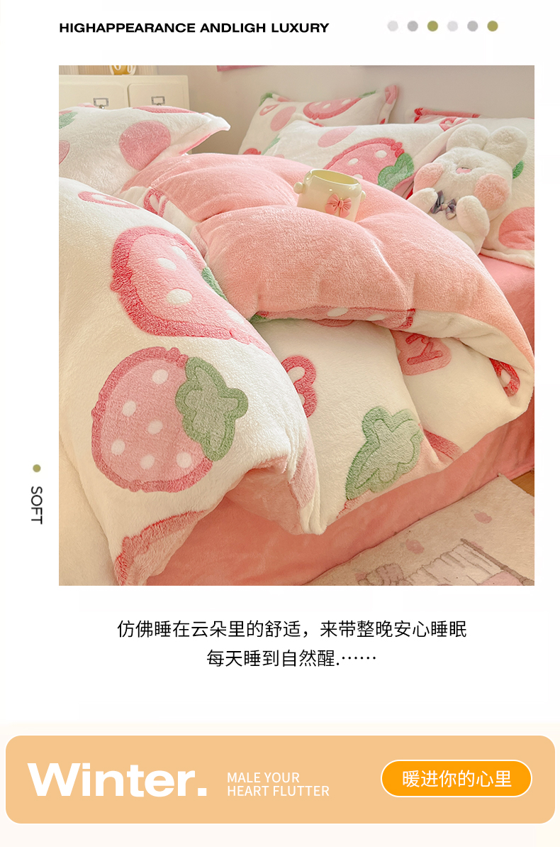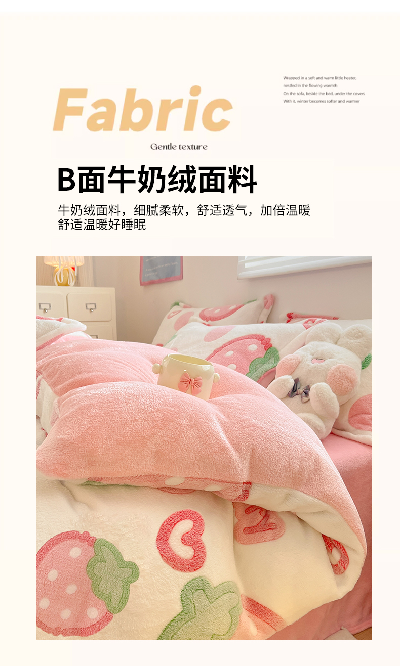 当前位置: 91家纺网 > 商品网购 > 床品套件 > 四件套 > 其它四件套 > 川悦生活 2025新款立体雪花绒印花大床四件套系列二场景一 啵啵草莓