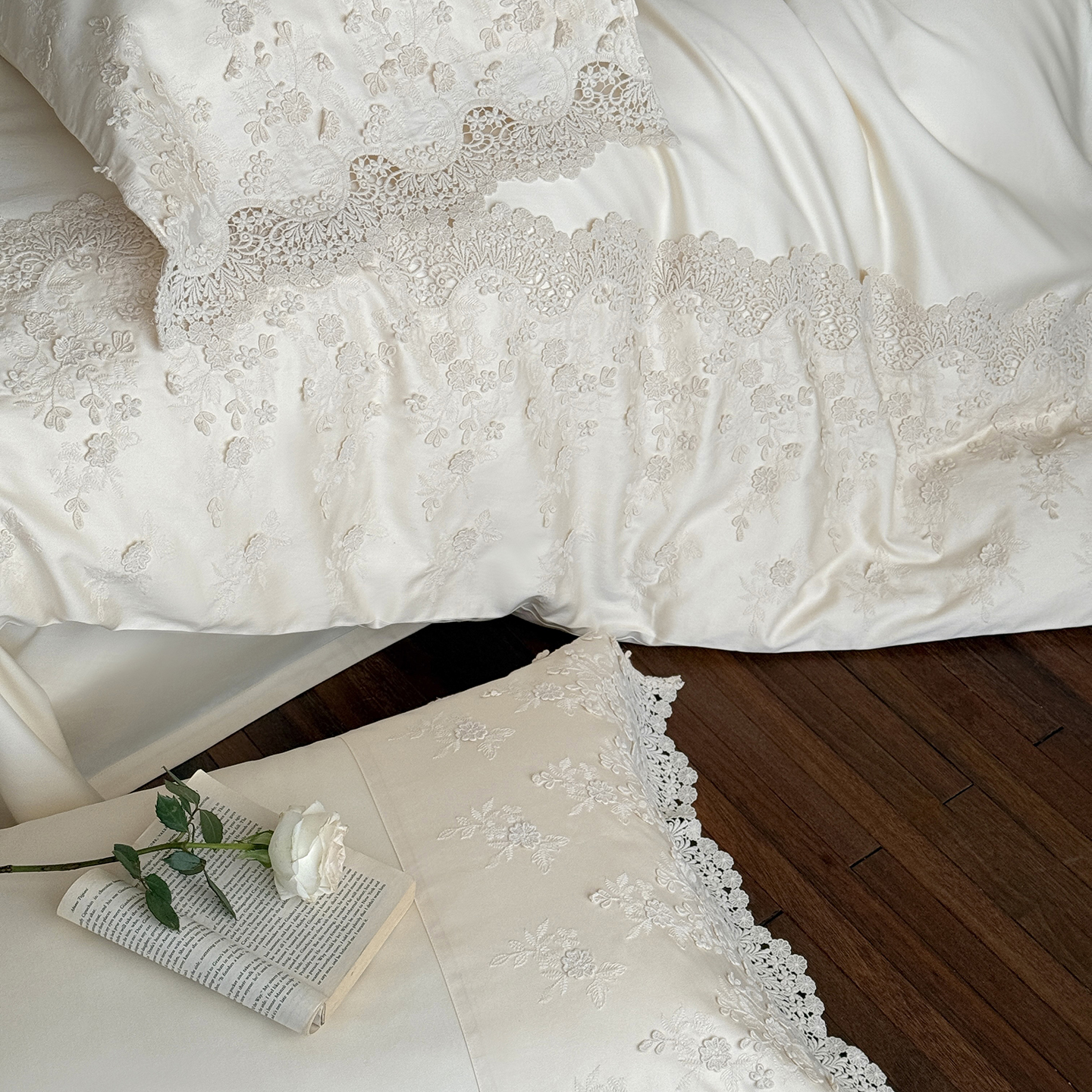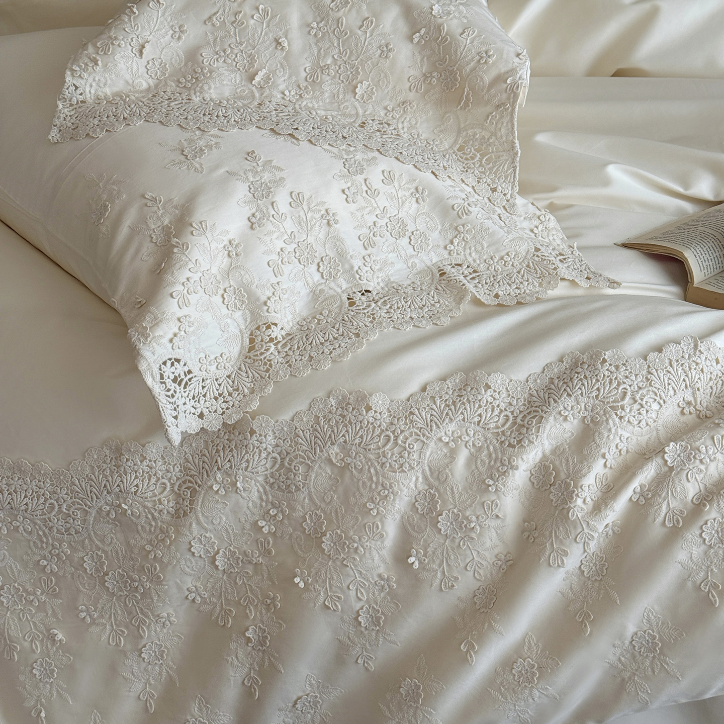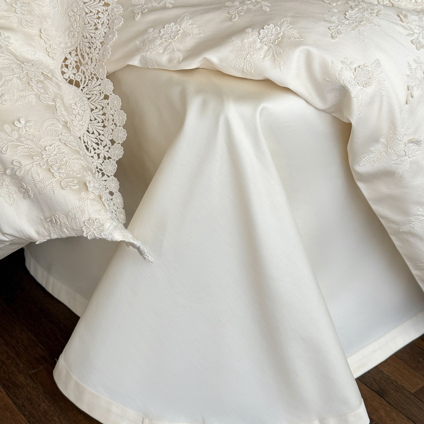 (总)佳汐蓝 2025春夏新品双层皱皱纱刺绣+织带+荷叶边四件套--白茶花,奶白,曲奇
