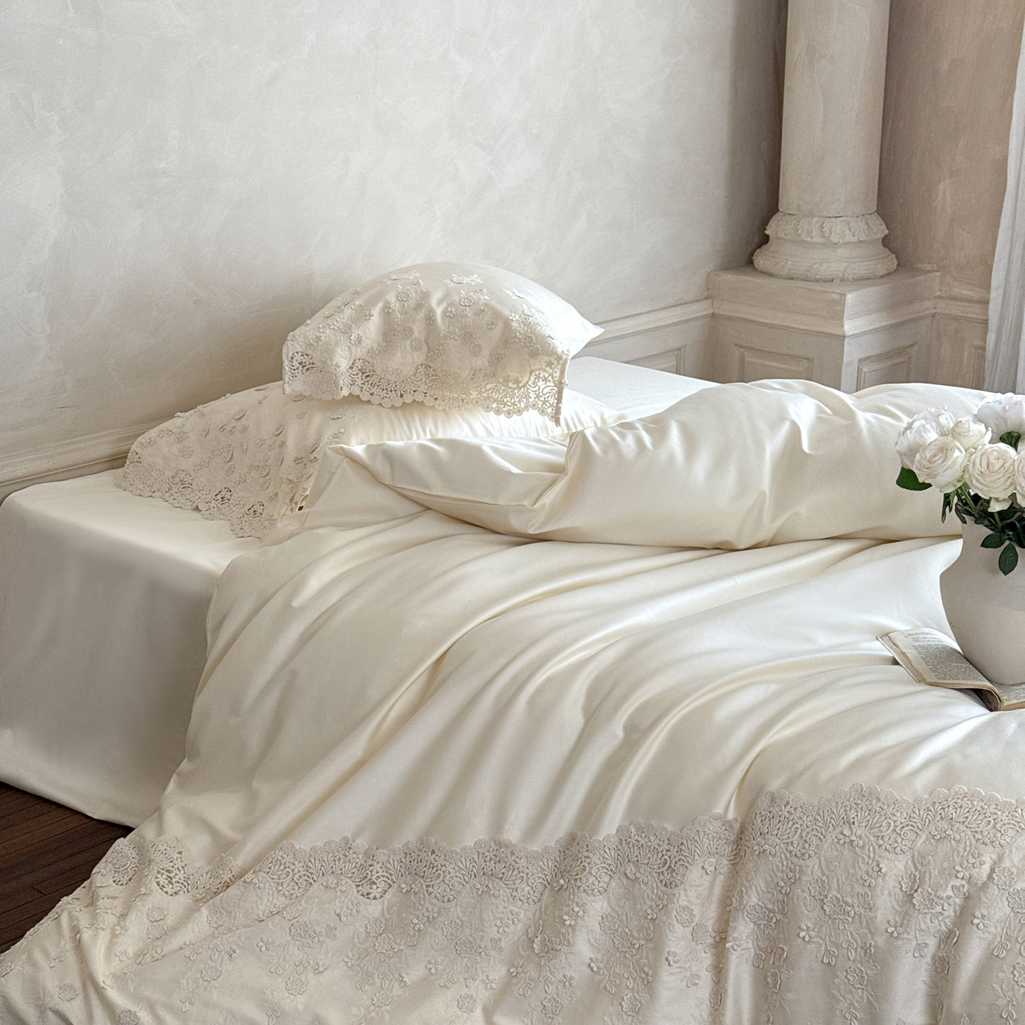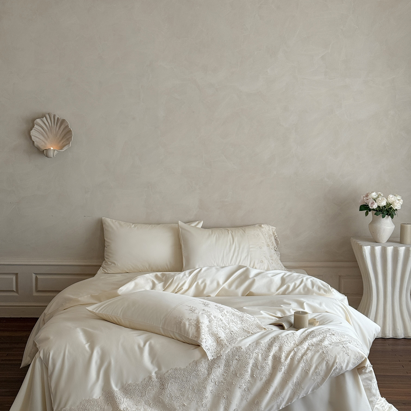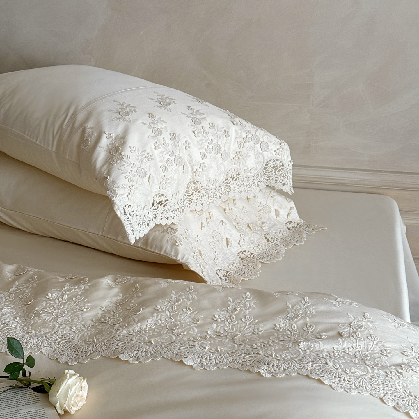 (总)佳汐蓝 2025春夏新品双层皱皱纱刺绣+织带+荷叶边四件套--白茶花,奶白,曲奇